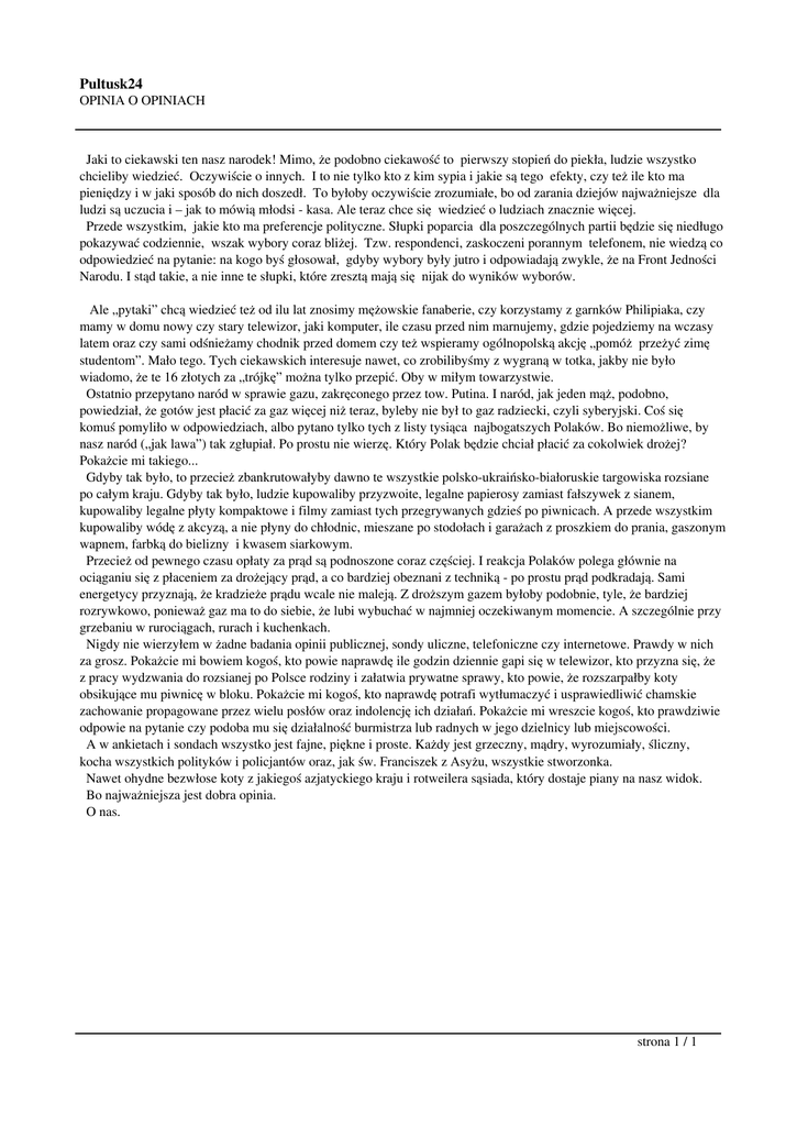 Pultusk24 OPINIA O OPINIACH Jaki to ciekawski ten nasz narodek! Mimo, że podobno ciekawość to pierwszy stopień do piekła, ludzie wszystko chcieliby wiedzieć. Oczywiście o innych. I to nie tylko kto z kim sypia i jakie są tego efekty, czy też ile kto ma pieniędzy i w jaki sposób do nich doszedł. To byłoby oczywiście zrozumiałe, bo od zarania dziejów najważniejsze dla ludzi są uczucia i – jak to mówią młodsi - kasa. Ale teraz chce się wiedzieć o ludziach znacznie więcej. Przede wszystkim, jakie kto ma preferencje polityczne. Słupki poparcia dla poszczególnych partii będzie się niedługo pokazywać codziennie, wszak wybory coraz bliżej. Tzw. respondenci, zaskoczeni porannym telefonem, nie wiedzą co odpowiedzieć na pytanie: na kogo byś głosował, gdyby wybory były jutro i odpowiadają zwykle, że na Front Jedności Narodu. I stąd takie, a nie inne te słupki, które zresztą mają się nijak do wyników wyborów. Ale „pytaki” chcą wiedzieć też od ilu lat znosimy mężowskie fanaberie, czy korzystamy z garnków Philipiaka, czy mamy w domu nowy czy stary telewizor, jaki komputer, ile czasu przed nim marnujemy, gdzie pojedziemy na wczasy latem oraz czy sami odśnieżamy chodnik przed domem czy też wspieramy ogólnopolską akcję „pomóż przeżyć zimę studentom”. Mało tego. Tych ciekawskich interesuje nawet, co zrobilibyśmy z wygraną w totka, jakby nie było wiadomo, że te 16 złotych za „trójkę” można tylko przepić. Oby w miłym towarzystwie. Ostatnio przepytano naród w sprawie gazu, zakręconego przez tow. Putina. I naród, jak jeden mąż, podobno, powiedział, że gotów jest płacić za gaz więcej niż teraz, byleby nie był to gaz radziecki, czyli syberyjski. Coś się komuś pomyliło w odpowiedziach, albo pytano tylko tych z listy tysiąca najbogatszych Polaków. Bo niemożliwe, by nasz naród („jak lawa”) tak zgłupiał. Po prostu nie wierzę. Który Polak będzie chciał płacić za cokolwiek drożej? Pokażcie mi takiego... Gdyby tak było, to przecież zbankrutowałyby dawno te wszystkie polsko-ukraińsko-białoruskie targowiska rozsiane po całym kraju. Gdyby tak było, ludzie kupowaliby przyzwoite, legalne papierosy zamiast fałszywek z sianem, kupowaliby legalne płyty kompaktowe i filmy zamiast tych przegrywanych gdzieś po piwnicach. A przede wszystkim kupowaliby wódę z akcyzą, a nie płyny do chłodnic, mieszane po stodołach i garażach z proszkiem do prania, gaszonym wapnem, farbką do bielizny i kwasem siarkowym. Przecież od pewnego czasu opłaty za prąd są podnoszone coraz częściej. I reakcja Polaków polega głównie na ociąganiu się z płaceniem za drożejący prąd, a co bardziej obeznani z techniką - po prostu prąd podkradają. Sami energetycy przyznają, że kradzieże prądu wcale nie maleją. Z droższym gazem byłoby podobnie, tyle, że bardziej rozrywkowo, ponieważ gaz ma to do siebie, że lubi wybuchać w najmniej oczekiwanym momencie. A szczególnie przy grzebaniu w rurociągach, rurach i kuchenkach. Nigdy nie wierzyłem w żadne badania opinii publicznej, sondy uliczne, telefoniczne czy internetowe. Prawdy w nich za grosz. Pokażcie mi bowiem kogoś, kto powie naprawdę ile godzin dziennie gapi się w telewizor, kto przyzna się, że z pracy wydzwania do rozsianej po Polsce rodziny i załatwia prywatne sprawy, kto powie, że rozszarpałby koty obsikujące mu piwnicę w bloku. Pokażcie mi kogoś, kto naprawdę potrafi wytłumaczyć i usprawiedliwić chamskie zachowanie propagowane przez wielu posłów oraz indolencję ich działań. Pokażcie mi wreszcie kogoś, kto prawdziwie odpowie na pytanie czy podoba mu się działalność burmistrza lub radnych w jego dzielnicy lub miejscowości. A w ankietach i sondach wszystko jest fajne, piękne i proste. Każdy jest grzeczny, mądry, wyrozumiały, śliczny, kocha wszystkich polityków i policjantów oraz, jak św. Franciszek z Asyżu, wszystkie stworzonka. Nawet ohydne bezwłose koty z jakiegoś azjatyckiego kraju i rotweilera sąsiada, który dostaje piany na nasz widok. Bo najważniejsza jest dobra opinia. O nas. strona 1 / 1