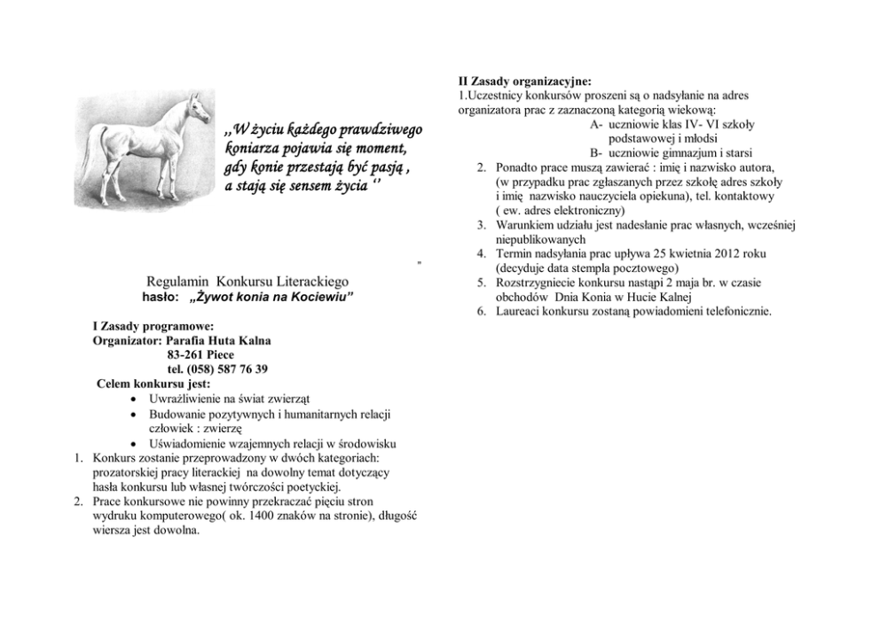 ,,W życiu każdego prawdziwego koniarza pojawia się moment, gdy konie przestają być pasją , a stają się sensem życia ‘’ ” Regulamin Konkursu Literackiego hasło: „Żywot konia na Kociewiu” I Zasady programowe: Organizator: Parafia Huta Kalna 83-261 Piece tel. (058) 587 76 39 Celem konkursu jest: Uwrażliwienie na świat zwierząt Budowanie pozytywnych i humanitarnych relacji człowiek : zwierzę Uświadomienie wzajemnych relacji w środowisku 1. Konkurs zostanie przeprowadzony w dwóch kategoriach: prozatorskiej pracy literackiej na dowolny temat dotyczący hasła konkursu lub własnej twórczości poetyckiej. 2. Prace konkursowe nie powinny przekraczać pięciu stron wydruku komputerowego( ok. 1400 znaków na stronie), długość wiersza jest dowolna. II Zasady organizacyjne: 1.Uczestnicy konkursów proszeni są o nadsyłanie na adres organizatora prac z zaznaczoną kategorią wiekową: A- uczniowie klas IV- VI szkoły podstawowej i młodsi B- uczniowie gimnazjum i starsi 2. Ponadto prace muszą zawierać : imię i nazwisko autora, (w przypadku prac zgłaszanych przez szkołę adres szkoły i imię nazwisko nauczyciela opiekuna), tel. kontaktowy ( ew. adres elektroniczny) 3. Warunkiem udziału jest nadesłanie prac własnych, wcześniej niepublikowanych 4. Termin nadsyłania prac upływa 25 kwietnia 2012 roku (decyduje data stempla pocztowego) 5. Rozstrzygniecie konkursu nastąpi 2 maja br. w czasie obchodów Dnia Konia w Hucie Kalnej 6. Laureaci konkursu zostaną powiadomieni telefonicznie.