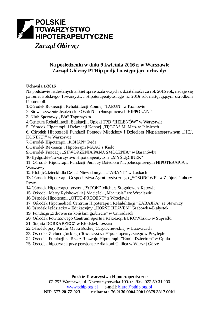 Na posiedzeniu w dniu 9 kwietnia 2016 r. w Warszawie Zarząd Główny PTHip podjął następujące uchwały: Uchwała 1/2016 Na podstawie nadesłanych ankiet sprawozdawczych z działalności za rok 2015 rok, nadaje się patronat Polskiego Towarzystwa Hipoterapeutycznego na 2016 rok następującym ośrodkom hipoterapii: 1.Ośrodek Rekreacji i Rehabilitacji Konnej ”TABUN” w Krakowie 2. Stowarzyszenie Jeździeckie Osób Niepełnosprawnych HIPPOLAND 3. Klub Sportowy „Bór” Toporzysko 4.Centrum Rehabilitacji, Edukacji i Opieki TPD ”HELENÓW” w Warszawie 5. Ośrodek Hipoterapii i Rekreacji Konnej „TĘCZA” M. Matz w Jaksicach 6. Ośrodek Hipoterapii Fundacji Pomocy Młodzieży i Dzieciom Niepełnosprawnym „HEJ, KONIKU!” w Warszawie 7.Ośrodek Hipoterapii „ROHAN” Reda 8.Ośrodek Rekreacji i Hipoterapii MAAG z Kielc 9.Ośrodek Fundacji „STWORZENIA PANA SMOLENIA” w Baranówku 10.Bydgoskie Towarzystwo Hipoterapeutyczne „MYŚLĘCINEK” 11. Ośrodek Hipoterapii Fundacji Pomocy Dzieciom Niepełnosprawnym HIPOTERAPIA z Warszawy 12.Klub jeździecki dla Dzieci Niewidomych „TARANT” w Laskach 13.Ośrodek Hipoterapii Gospodarstwa Agroturystycznego „SOSONOWE” w Zbójnej, Tabory Rzym 14.Ośrodek Hipoterapeutyczny „PADOK” Michała Stogniewa z Katowic 15. Ośrodek Marty Rylokowskiej-Maciążek „Mar-tusia” we Wrocławiu 16.Ośrodek Hipoterapii „OTTO-PRODENT” z Wrocławia 17. Ośrodek Hipomedical Centrum Hipoterapii i Rehabilitacji ”ZABAJKA” ze Stawnicy 18.Ośrodek Jeździecko – Edukacyjny „HORSE HEAVEN” Grabówka-Białystok 19. Fundacja „Zdrowie na końskim grzbiecie” w Uniradzach 20. Ośrodek Powiatowego Centrum Sportu i Rekreacji BUKOWISKO w Supraślu 21. Stajnia DOBRARZECZ w Kłodzie/k Leszna 22.Ośrodek przy Parafii Matki Boskiej Częstochowskiej w Latowicach 23. Ośrodek Zielonogórskiego Towarzystwa Hipoterapeutycznego w Przylepie 24. Ośrodek Fundacji na Rzecz Rozwoju Hipoterapii ”Konie Dzieciom” w Opolu 25. Ośrodek hipoterapii przy pensjonacie dla koni Galilea w Wilczej Górze Polskie Towarzystwo Hipoterapeutyczne 02-797 Warszawa, ul. Nowoursynowska 100. tel./fax 022 59 31 900 www.pthip.org.pl e-mail: [email protected] NIP 677-20-77-023 nr konta: 76 2130 0004 2001 0379 3817 0001 26. Fundacja Hipoterapeutyczna – Jamajka Klub w Dziekanowie Leśnym 27. Ośrodek KONIK NA BIEGUNACH Rehabilitacja Ruchowa Ewy Polańskiej 28. Ośrodek Hipoterapeutyczno-Rehabilitacyjno-Jeździecki IKARION w Bobrku 29. Ośrodek Stowarzyszenia św. Celestyna w Mikoszowie 30. Ośrodek JAGODOWA STAJENKA k. Bydgoszczy 31. Ośrodek Hipoterapii i Rekreacji Ruchowej PASJA Flentowo 32. Hipomedical 2 ośrodek Rehabilitacji Dzieci Zabajka 2 ze Złotowa 33. Ośrodek Jazdy Konnej i Hipoterapii Andrzeja Michalskiego z Budzistowa 34. Ośrodek hipoterapii w Specjalnym Ośrodku Szkolno–Wychowawczym w Łupkach 35. Ośrodkowi hipoterapii przy Domu Wczasów Dziecięcych TPD w Głazie 36.Ośrodek Rekreacji Konnej "Pod Aniołami" Bydgoszcz. Uchwała 2/2016 Nadaje się warunkowo patronat Polskiego Towarzystwa Hipoterapeutycznego na 2016 rok następującym ośrodkom: 1. Towarzystwo Przyjaciół Niepełnosprawnych „STAJNIA POD JODŁAMI” 2. Stowarzyszenie Ostrowskie Centrum Hipoterapii Wtórek 3. Ośrodek Hipoterapii Fundacji DUCHA na Rzecz Rehabilitacji Naturalnej Ludzi Niepełnosprawnych z Torunia 4. Ośrodek Rehabilitacji Konnej Kisielnica Łomża 5. Ośrodek Rehabilitacji i Hipoterapii A. PATALON w Kwidzynie Uchwała nr 3/2016 Zarząd Główny PTHip przyjmuje sprawozdanie merytoryczne Zarządu Głównego Towarzystwa, Oddziałów Warszawskiego i Kujawsko-Pomorskiego oraz Małopolskiego. (uchwała przyjęta jednogłośnie, 8 za) Uchwała 4/2016 Zarząd Główny PTHip przyjmuje bilans Towarzystwa za 2015 rok, który zamknął się dodatnim wynikiem finansowym wysokości 14.171,77 PLN. Kwota ta zostanie przeniesiona na przychody działalności statutowej w 2016 rok. (uchwała przyjęta jednogłośnie 8 glosami). Uchwała 5/2016 W przypadku kursów hipoterapii realizowanych dla mniej niż 15 uczestników obniżona zostaje oplata licencyjna do 2.000 zł, a oplata od każdego uczestnika kursu do 200 zł od osoby. (Uchwała przyjęta jednogłośnie, 8 za). Polskie Towarzystwo Hipoterapeutyczne 02-797 Warszawa, ul. Nowoursynowska 100. tel./fax 022 59 31 900 www.pthip.org.pl e-mail: [email protected] NIP 677-20-77-023 nr konta: 76 2130 0004 2001 0379 3817 0001 Uchwała nr 6/2016 Nadaje się prawo prowadzenia szkolenia praktycznego kursu hipoterapii PTHip-hipoterapeucie mgr psychologii Agacie Rybak z Bydgoskiego Towarzystwa Hipoterapeutycznego Myślęcinek (6 głosów za, 5 wstrzymujących) Uchwała nr 7/2016 Nadaje się prawo prowadzenia praktyk w pełnym zakresie Ośrodkowi Hipoterapii Bydgoskiego Towarzystwa Hipoterapeutycznego Myślęcinek (6 głosów za, 5 wstrzymujących) Uchwała 8/2016 Podnosi się od 2017 roku wysokość rocznej składki członkowskiej PTHip z 50 na 70 zł. (5 głosów za, 3 przeciw) Uchwała 9/2016 Postanawia się rozpocząć przygotowania do nadania osobowości prawnej tym Oddziałom Towarzystwa, które zgłoszą takie zapotrzebowanie. (7 głosów za) Uchwała 10/2016 Przyznaje się wyróżnienie w konkursie na najlepszą pracę o tematyce hipoterapeutycznej w 2016 r. pracy magisterskiej Marty Zientek „Wpływ hipoterapii na wybrane parametry motoryczne i sensoryczne u dziecka z zespołem Downa”, Akademia Wychowania Fizycznego w Katowicach Wydział Fizjoterapii, promotor prof. dr hab. Małgorzata Matyja (Katowice 2016). ( 7 głosów za) Uchwała 11/ 2016 Nadaje się patronat PTHip na 2016/2017 rok ośrodkowi hipoterapeutycznemu KAPIRIS w Paniówkach.( 7 głosów za) Uchwała 12/2016 ZG PTHip postanawia rekomendować do odznaki honorowej PTHip Walnemu Zgromadzenie PTHip za wybitne zasługi dla Towarzystwa oraz dla krzewienia i rozwoju polskiej hipoterapii następujące osoby: złota honorowa odznaka PTHip - Joanna Kozik. srebrna honorowa odznaka PTHip - Ma