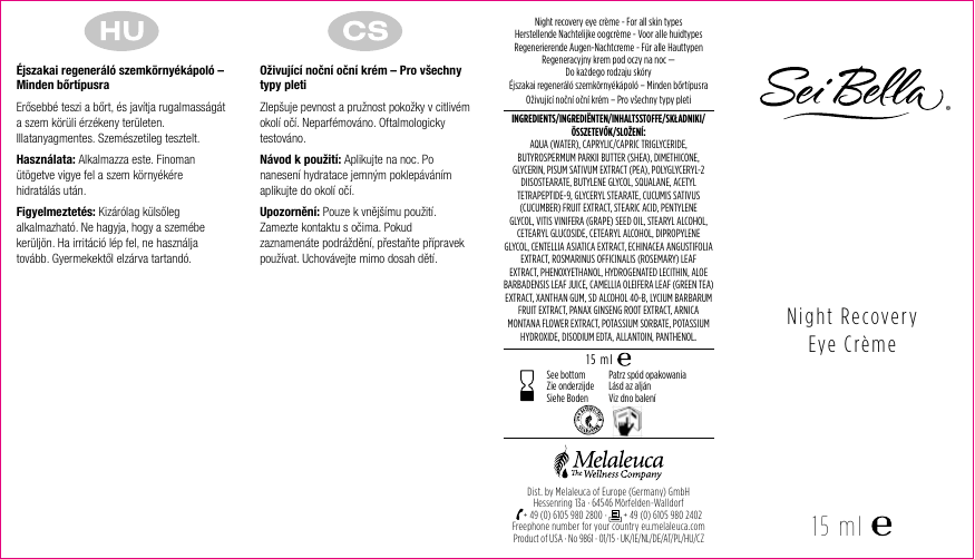 Éjszakai regeneráló szemkörnyékápoló – Minden bőrtípusra Oživující noční oční krém – Pro všechny typy pleti Erősebbé teszi a bőrt, és javítja rugalmasságát a szem körüli érzékeny területen. Illatanyagmentes. Szemészetileg tesztelt. Zlepšuje pevnost a pružnost pokožky v citlivém okolí očí. Neparfémováno. Oftalmologicky testováno. Használata: Alkalmazza este. Finoman ütögetve vigye fel a szem környékére hidratálás után. Návod k použití: Aplikujte na noc. Po nanesení hydratace jemným poklepáváním aplikujte do okolí očí. Figyelmeztetés: Kizárólag külsőleg alkalmazható. Ne hagyja, hogy a szemébe kerüljön. Ha irritáció lép fel, ne használja tovább. Gyermekektől elzárva tartandó. Upozornění: Pouze k vnějšímu použití. Zamezte kontaktu s očima. Pokud zaznamenáte podráždění, přestaňte přípravek používat. Uchovávejte mimo dosah dětí. Night recovery eye crème - For all skin types Herstellende Nachtelijke oogcrème - Voor alle huidtypes Regenerierende Augen-Nachtcreme - Für alle Hauttypen Regeneracyjny krem pod oczy na noc — Do każdego rodzaju skóry Éjszakai regeneráló szemkörnyékápoló – Minden bőrtípusra Oživující noční oční krém – Pro všechny typy pleti INGREDIENTS/INGREDIËNTEN/INHALTSSTOFFE/SKŁADNIKI/ ÖSSZETEVŐK/SLOŽENÍ: AQUA (WATER), CAPRYLIC/CAPRIC TRIGLYCERIDE, BUTYROSPERMUM PARKII BUTTER (SHEA), DIMETHICONE, GLYCERIN, PISUM SATIVUM EXTRACT (PEA), POLYGLYCERYL-2 DIISOSTEARATE, BUTYLENE GLYCOL, SQUALANE, ACETYL TETRAPEPTIDE-9, GLYCERYL STEARATE, CUCUMIS SATIVUS (CUCUMBER) FRUIT EXTRACT, STEARIC ACID, PENTYLENE GLYCOL, VITIS VINIFERA (GRAPE) SEED OIL, STEARYL ALCOHOL, CETEARYL GLUCOSIDE, CETEARYL ALCOHOL, DIPROPYLENE GLYCOL, CENTELLIA ASIATICA EXTRACT, ECHINACEA ANGUSTIFOLIA EXTRACT, ROSMARINUS OFFICINALIS (ROSEMARY) LEAF EXTRACT, PHENOXYETHANOL, HYDROGENATED LECITHIN, ALOE BARBADENSIS LEAF JUICE, CAMELLIA OLEIFERA LEAF (GREEN TEA) EXTRACT, XANTHAN GUM, SD ALCOHOL 40-B, LYCIUM BARBARUM FRUIT EXTRACT, PANAX GINSENG ROOT EXTRACT, ARNICA MONTANA FLOWER EXTRACT, POTASSIUM SORBATE, POTASSIUM HYDROXIDE, DISODIUM EDTA, ALLANTOIN, PANTHENOL. 15 m l See bottom Zie onderzijde Siehe Boden ® Night Recovery Eye Crème Patrz spód opakowania Lásd az alján Viz dno balení Dist. by Melaleuca of Europe (Germany) GmbH Hessenring 13a · 64546 Mörfelden-Walldorf + 49 (0) 6105 980 2800 · + 49 (0) 6105 980 2402 Freephone number for your country eu.melaleuca.com Product of USA · No 9861 · 01/15 · UK/IE/NL/DE/AT/PL/HU/CZ 15 ml Night recovery eye crème For all skin types Herstellende Nachtelijke oogcrème Voor alle huidtypes Regenerierende Augen-Nachtcreme Für alle Hauttypen Regeneracyjny krem pod oczy na noc — Do każdego rodzaju skóry Improves firmness and elasticity of skin in the delicate eye area. Fragrance-free. Ophthalmologist-tested. Verbetert de stevigheid en elasticiteit van de delicate huid rond de ogen. Geurloos. Getest door een oogheelkundige. Verbessert die Festigkeit und Elastizität der empfindlichen Haut um die Augen. Ohne Duftstoffe. Von Augenärzten getestet. Poprawia jędrność i elastyczność skóry delikatnych okolic oczu. Bezzapachowy. Testowany oftalmologicznie. Directions: Apply at night. Pat gently around the eye area after moisturising. Gebruiksaanwijzing: ‚s Avonds aanbrengen. Na een moisturizer zachtjes deppen rond de ogen. Anwendung: Abends auftragen. Nach der Feuchtigkeitsbehandlung sanft um die Augenpartie herum auftupfen. Sposób użycia: Stosować wieczorem. Delikatnie wklepać w okolice oczu po nawilżeniu skóry. Waarschuwing: Enkel voor uitwendig gebruik. Contact met de ogen vermijden. Het gebruik stopzetten bij irritatie. Buiten bereik van kinderen houden. Achtung: Nur zur äußeren Anwendung. Kontakt mit den Augen vermeiden. Bei Auftreten von Hautirritationen die Anwendung beenden. Für Kinder unzugänglich aufbewahren. Ostrzeżenie: Tylko do użytku zewnętrznego. Unikać kontaktu z oczami. W przypadku wystąpienia podrażnienia należy zaprzestać stosowania. Przechowywać w miejscu niedostępnym dla dzieci. Warning: For external use only. Keep out of eyes. Discontinue use if irritation occurs. Keep out of reach of children.
