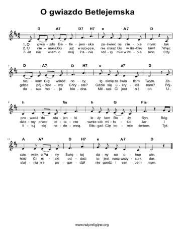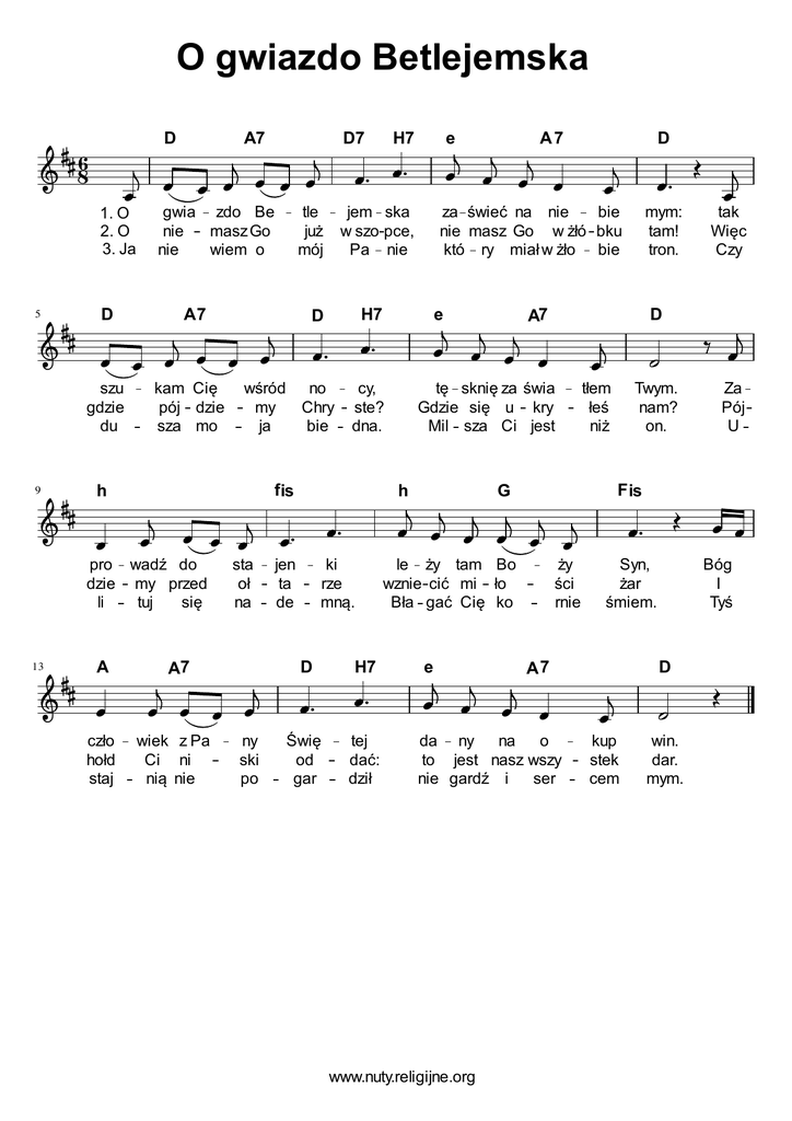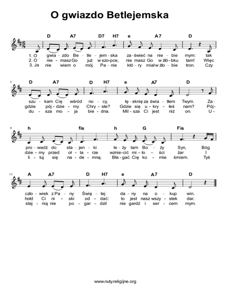 O gwiazdo Betlejemska D 6 8 D A7 kam Cię pój dzie sza mo pro wadź do dzie my przed li tuj się 13 A czło hołd staj sta oł na A7 wiek z Pa Ci ni nią nie ny ski po cy, ste? dna. jen ta de ki rze mną. H7 Świę od gar tej dać: dził mym: tam! tron. tak Więc Czy D tę sknię za świa Gdzie się u kry Mil sza Ci jest tłem łeś niż Twym. nam? on. le ży tam Bo wznie cić mi ło Bła gać Cię ko ży ści rnie Syn, żar śmiem. e Bóg I Tyś A7 da ny na o to jest nasz wszy nie gardź i ser kup stek cem win. dar. mym. www.nuty.religijne.org Za Pój U F is G A7 h e D D za świeć na nie bie nie masz Go w żłó bku któ ry miał w żło bie wśród no my Chry ja bie A7 H7 f is e jem ska w szo pce, Pa nie D h H7 tle już mój szu gdzie du 9 D7 gwia zdo Be nie masz Go nie wiem o 1. O 2. O 3. Ja 5 A7 D