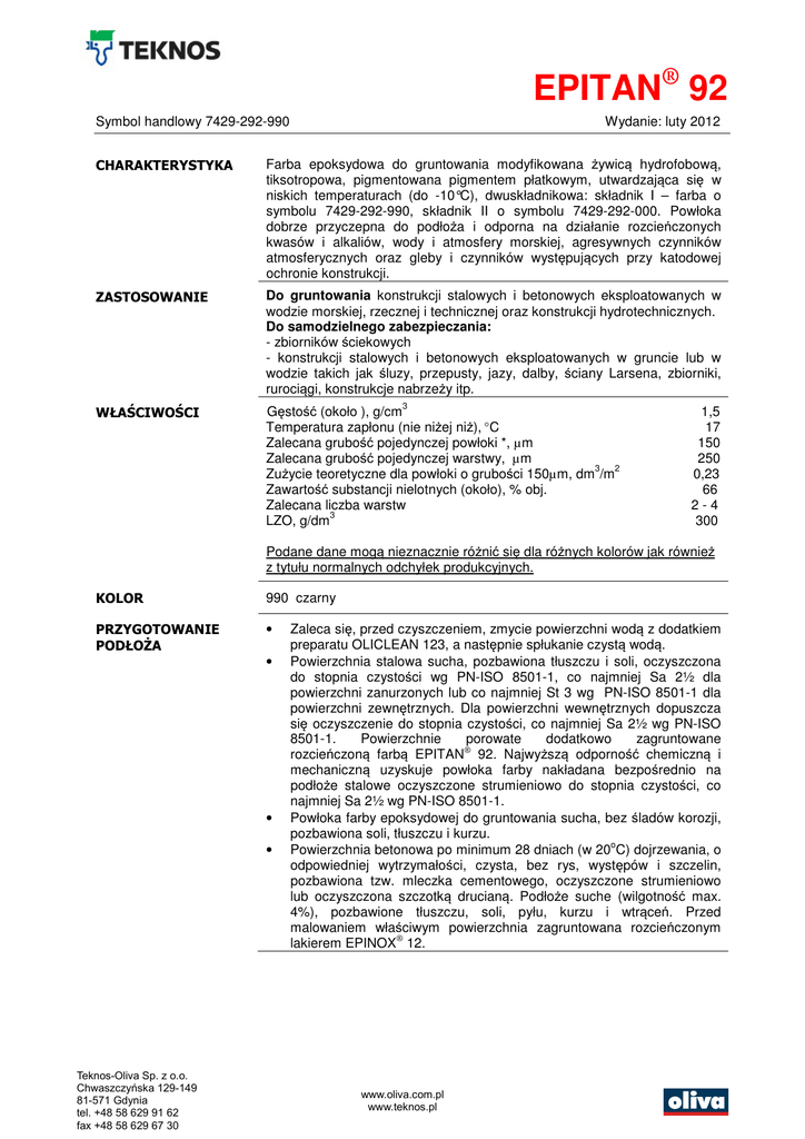 EPITAN® 92 Symbol handlowy 7429-292-990 Wydanie: luty 2012 CHARAKTERYSTYKA Farba epoksydowa do gruntowania modyfikowana żywicą hydrofobową, tiksotropowa, pigmentowana pigmentem płatkowym, utwardzająca się w niskich temperaturach (do -10°C), dwuskładnikowa: składnik I – farba o symbolu 7429-292-990, składnik II o symbolu 7429-292-000. Powłoka dobrze przyczepna do podłoża i odporna na działanie rozcieńczonych kwasów i alkaliów, wody i atmosfery morskiej, agresywnych czynników atmosferycznych oraz gleby i czynników występujących przy katodowej ochronie konstrukcji. ZASTOSOWANIE Do gruntowania konstrukcji stalowych i betonowych eksploatowanych w wodzie morskiej, rzecznej i technicznej oraz konstrukcji hydrotechnicznych. Do samodzielnego zabezpieczania: - zbiorników ściekowych - konstrukcji stalowych i betonowych eksploatowanych w gruncie lub w wodzie takich jak śluzy, przepusty, jazy, dalby, ściany Larsena, zbiorniki, rurociągi, konstrukcje nabrzeży itp. WŁAŚCIWOŚCI Gęstość (około ), g/cm Temperatura zapłonu (nie niżej niż), °C Zalecana grubość pojedynczej powłoki *, µm Zalecana grubość pojedynczej warstwy, µm 3 2 Zużycie teoretyczne dla powłoki o grubości 150µm, dm /m Zawartość substancji nielotnych (około), % obj. Zalecana liczba warstw 3 LZO, g/dm 3 1,5 17 150 250 0,23 66 2-4 300 Podane dane mogą nieznacznie różnić się dla różnych kolorów jak również z tytułu normalnych odchyłek produkcyjnych. KOLOR 990 czarny PRZYGOTOWANIE PODŁOŻA • • • • Teknos-Oliva Sp. z o.o. Chwaszczyńska 129-149 81-571 Gdynia tel. +48 58 629 91 62 fax +48 58 629 67 30 Zaleca się, przed czyszczeniem, zmycie powierzchni wodą z dodatkiem preparatu OLICLEAN 123, a następnie spłukanie czystą wodą. Powierzchnia stalowa sucha, pozbawiona tłuszczu i soli, oczyszczona do stopnia czystości wg PN-ISO 8501-1, co najmniej Sa 2½ dla powierzchni zanurzonych lub co najmniej St 3 wg PN-ISO 8501-1 dla powierzchni zewnętrznych. Dla powierzchni wewnętrznych dopuszcza się oczyszczenie do stopnia czystości, co najmniej Sa 2½ wg PN-ISO 8501-1. Powierzchnie porowate dodatkowo zagruntowane rozcieńczoną farbą EPITAN® 92. Najwyższą odporność chemiczną i mechaniczną uzyskuje powłoka farby nakładana bezpośrednio na podłoże stalowe oczyszczone strumieniowo do stopnia czystości, co najmniej Sa 2½ wg PN-ISO 8501-1. Powłoka farby epoksydowej do gruntowania sucha, bez śladów korozji, pozbawiona soli, tłuszczu i kurzu. o Powierzchnia betonowa po minimum 28 dniach (w 20 C) dojrzewania, o odpowiedniej wytrzymałości, czysta, bez rys, występów i szczelin, pozbawiona tzw. mleczka cementowego, oczyszczone strumieniowo lub oczyszczona szczotką drucianą. Podłoże suche (wilgotność max. 4%), pozbawione tłuszczu, soli, pyłu, kurzu i wtrąceń. Przed malowaniem właściwym powierzchnia zagruntowana rozcieńczonym lakierem EPINOX® 12. www.oliva.com.pl www.teknos.pl EPITAN® 92 Symbol handlowy 7429-292-990 PRZYGOTOWANIE FARBY Wydanie: luty 2012 Składnik I dokładnie wymieszać, a następnie zmieszać ze składnikiem II wg następującej proporcji: wagowo objętościowo składnik I 100 100 składnik II 12 18 Farba nadaje się do użycia po dokładnym wymieszaniu składników, po o upływie 15 minut (w 20 C). Farba stosowana do gruntowania powierzchni porowatych powinna być rozcieńczona przez dodatek do 20% rozcieńczalnika 564. o Czas przydatności mieszaniny składników do stosowania (w 20 C) – 3,5 h. METODY NAKŁADANIA Natrysk bezpowietrzny, pędzel. Przy malowaniu pędzlem może być konieczne nakładanie farby w kilku warstwach dla uzyskania zalecanej grubości pojedynczej powłoki. Parametry natrysku bezpowietrznego: średnica dyszy 0,48 - 0,63 mm ciśnienie w dyszy 20 - 25 MPa ROZCIEŃCZANIE Nie jest wymagane. W razie konieczności (np. zgęstnienie wyrobu) użyć rozcieńczalnik 564 (patrz Informacja Techniczna). Do mycia aparatury: rozcieńczalnik 564. WARUNKI PODCZAS MALOWANIA Warunki podczas malowania: - minimalna temperatura podłoża -5°C (powierzchnia wolna od szronu i lodu) oraz co najmniej 3°C wyższa od temperatury punktu rosy, o - minimalna temperatura farby w wężach: +15 C, o - temperatura otoczenia nie niżej niż: -10 C, - wilgotność względna powietrza najwyżej 95%, - dobra wentylacja. o Czas schnięcia (w 20 C): pyłosuchość na dotyk - 2h - 6h Czas do nałożenia kolejnych warstw: temperatura najkrótszy o o 20 C 6h o o 10 C 8h 0C 14h 5C 10h o -5 C 24h w warunkach wewnętrznych nieograniczony w warunkach zewnętrznych, przy ekspozycji słonecznej 1 miesiąc* *w przypadku kredowania powłoki usunąć produkty degradacji powłoki. najdłuższy Podane czasy dotyczą powłoki o zalecanej grubości, schnącej w warunkach dobrej wentylacji. Czasy te mogą ulec zmianie wraz ze zmianą temperatury, warunków wentylacji, ilości warstw i grubości pokrycia. Czas pełnego utwardzania powłoki: temperatura najkrótszy Teknos-Oliva Sp. z o.o. Chwaszczyńska 129-149 81-571 Gdynia tel. +48 58 629 91 62 fax +48 58 629 67 30 o 20 C 2 dni o 10 C 3 dni www.oliva.com.pl www.teknos.pl o 5C 6 dni o 0C 12 dni o -5 C 18 dni EPITAN® 92 Symbol handlowy 7429-292-990 Wydanie: luty 2012 NASTĘPNE WYMALOWANIA Farby nawierzchniowe poliuretanowe OLIVA INFORMACJA DODATKOWA • • • TRWAŁOŚĆ WYROBU UWAGA! EPINOX, farby winylowe, akrylowe lub Podczas opracowywania specyfikacji malowania, w zależności od przeznaczenia i rodzaju konstrukcji można założyć grubość pojedynczej powłoki inną niż zalecana w instrukcji stosowania. Przy natrysku bezpowietrznym typowy zakres grubości jednej powłoki wynosi od 150 do 250 µm. Zmiana grubości powłoki powoduje zmianę zużycia teoretycznego, grubości warstwy, masy wyschniętej powłoki, czasów schnięcia, czasu do nałożenia kolejnej warstwy oraz oddania pokrycia do eksploatacji. W przypadku eksploatacji powłoki w warunkach agresywnych zaleca się jak najlepsze przygotowanie po