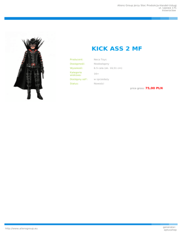 Aliens Group Jerzy Stec Produkcja-Handel-Usługi ul. Lipowa 17C Inowrocław KICK ASS 2 MF Producent: Neca Toys Dostępność: Niedostępny Wysokość: 6.5 cala (ok. 16,51 cm) Kategoria wiekowa: 16+ Dostępny od*: w sprzedaży Status: Nowości price gross: http://www.aliensgroup.eu 75,00 PLN generator: aptusshop