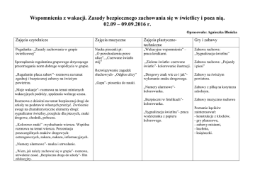 Wspomnienia z wakacji. Zasady bezpiecznego zachowania się w świetlicy i poza nią. 02.09 – 09.09.2016 r. Opracowała: Agnieszka Błońska Zajęcia czytelnicze Zajęcia muzyczne Zajęcia plastycznotechniczne Gry i zabawy Pogadanka- „Zasady zachowania w grupie świetlicowej” Nauka piosenki pt: ,,O przechodzeniu przez ulicę”, „Czerwone światło stój” „Wakacyjne wspomnienia” – praca kredkami. Zabawa ruchowa: ,,Sygnalizacja świetlna” ,,Zielone światło- czerwone światło”- kolorowanie ilustracji. Zabawa ruchowa: ,,Pojazdy i piesi” ,,Drogowy znak wie co i jak”wykonanie znaku drogowego. Zabawy na świeżym powietrzu. „Numery alarmowe”kolorowanka. Zabawy z piłką na korytarzu szkolnym. „Bezpieczni w fotelikach”kolorowanka. Zabawy muzyczno ruchowe Sporządzenie regulaminu grupowego dotyczącego przestrzegania norm dobrego współżycia w grupie. „Regulamin placu zabaw”- rozmowa na temat zgodnej i bezpiecznej zabawy na świeżym powietrzu. „Moje wakacje”- rozmowa na temat minionych wakacyjnych podróży, spędzania wolnego czasu. Rozmowa z dziećmi na temat bezpiecznej drogi do szkoły na podstawie własnych przeżyć. Zwrócenie uwagi na charakterystyczne elementy drogi: sygnalizator świetlny, przejście dla pieszych, znaki drogowe, chodnik, pobocze. ,,Kolorowe znaki” -wysłuchanie wiersza. Wspólna rozmowa na temat wiersza. Prezentacja poszczególnych znaków drogowych: ostrzegawczych, zakazu, nakazu, informacyjnych. „Numery alarmowe”- nauka i utrwalanie. „Wiem, jak należy zachować się w grupie”- rozmowa, utrwalenie zasad. „Bezpieczna droga do szkoły”- film edukacyjny. Rozwiązywanie zagadek słuchowych- ,,Odgłos ulicy” „Gapa”- piosenka do nauki. „Sygnalizacja świetlna”- praca wydzieranka z papieru kolorowego. Poznanie kącików zainteresowań: - konstrukcje z klocków, - gry planszowe, - zabawy misiami, - kuchnia, - książeczki. Dobry kolega, dobra koleżanka. Nasze zainteresowania. 12.09 – 16.09.2016 r. Opracowała: Agnieszka Błońska Zajęcia czytelnicze Zajęcia muzyczne Zajęcia plastycznotechniczne „Mój przyjaciel”- rozmowa wprowadzająca w temat. „Głowa, ramiona....” – zabawa ze śpiewem. ,,Przyjaźń”- rysunek w parach. „Co to znaczy być dobrym kolegą?”- rozmowa tematyczna. Zabawy przy muzyce pt. „Taniec z balonem” „Współpraca”- rozmowa na temat zgodnej pracy w parze i w grupie. Wyjaśnienie pojęcia „kompromis” Słuchanie i nauka piosenki – „W przyjaźni tkwi siła” Rozmowy z dziećmi na temat ich zainteresowań. Słuchanie opowiadania M. Molickiej „Bajka o dwóch ołówkach” Opowiadanie o kotkach- A.B. Świergolik. „Jestem sobie już uczniaczek”piosenka do nauki. Gry i zabawy Zabawy integrujące grupę: - ,,Powitanie różnymi częściami „Mój przyjaciel”- wyklejanie ciała. z plasteliny. -,,Piłka w kole”- rozpoznawanie imion. „Moje hobby”- rysunek. - „Kto to mówi”- rozpoznawanie dzieci po głosie. „Laurka dla przyjaciela”- łączenie - Zabawa ruchowa- ,,Pokaż materiałów. koledze jak…” - ,,Zaczarowany worek”. „Rysunek w grupach”- na - „ Taki jestem”. wylosowany temat. - „Imię i ruch”. - „Po mojej prawej ręce”. Stworzenie „Drzewa przyjaźni” - -„Lustro”. każdy odrysowuje swoją rękę, -„Przyjdź do mnie jako..”. wycina ją i koloruje (można - Zabawy z chustą animacyjną. w symbole, podpisy, różnokolorowo). Ręce Masaż – „Deszczyk”, „Rolnik” przyczepiamy do drzewa Zabawy ruchowe: - „Pająk i muchy”. - „Piłka parzy”. Zabawy ruchowe z elementami Ruchu Rozwijającego W. Sherborne. Grzeczność na co dzień i od święta. 19.09 – 23.09.2016 r. Opracowała: Agnieszka Błońska Zajęcia czytelnicze Zajęcia muzyczne Zajęcia plastycznotechniczne Gry i zabawy Zapoznanie dzieci z podstawowymi zwrotami grzecznościowymi: proszę, przepraszam, dziękuję. Nauka słów i melodii piosenki „Grzeczne słowa” Praca w grupach „Wyczaruj słowo” Uczniowie otrzymują karteczki i farbę. Podczas zamalowywania powierzchni kartki pojawiają się niewidoczne wcześniej wyrazy (napisane świecą): proszę, przepraszam, dziękuję. Praca w zespołach. Wykonanie kluczyków w czterech kolorach Zawieszenie ich pod magicznymi słowami: proszę, przepraszam, dziękuję. - Zabawa orientacyjna „Dzień dobry” Zabawy integrujące grupę: -,,Piłka w kole”- rozpoznawanie imion - Zabawa ruchowa- ,,Pokaż koledze jak…” Zabawa na refleks - zamiana miejsc w kole Masaż – „Deszczyk”, „Rolnik” Zabawy ruchowe: - „Pająk i muchy” - „Piłka parzy” Kalambury Zaprojektowanie i wykonanie znaczka „Uprzejmy Świetlik” Rozwiązywanie zagadek i krzyżówek tematycznych. Wspólne poszukiwanie odpowiedzi na pytanie:” Na czym polega czarodziejska moc tych słów? Co to znaczy, że uśmiech ma czarodziejską moc? Swobodne wypowiedzi na temat potrzeby używania zwrotów grzecznościowych w różnych sytuacjach na podstawie literatury i własnych doświadczeń. Spotkanie w kręgu – w tle słychać śpiew ptaków. Uczniowie zamykają oczy i wyobrażają sobie, że znajdują się przed czarodziejskim ogrodem. Dostępu do niego strzegą ogromne drzwi. Zastanawiają się za pomocą czego mogłyby je otworzyć. Przy użyciu magicznego słowa otwierają drzwi. Odczytują ukryty napis. Zorganizowanie Świetlicowego Dnia Uprzejmości. Ćwiczenia emisyjne i oddechowe – powtarzanie powtarzanie słów piosenki na zasadzie echa. Zabawa muzyczno-ruchowa „Taniec Miłoludków” Wykonanie z kolorowej bibuły bukiecików. Dzieci obdarowywują się samodzielnie wykonanymi bukietami z zastosowaniem zwrotów grzecznościowych. Warszawa - moje miasto. Święto Naszej Szkoły 26.09. – 30.09.2016 r. Opracowała: Agnieszka Błońska Zajęcia czytelnicze Zajęcia muzyczne Zajęcia plastycznotechniczne Gry i zabawy „Nasza Warszawa- stolica Polski”- rozmowa wprowadzająca w temat z wykorzystaniem i