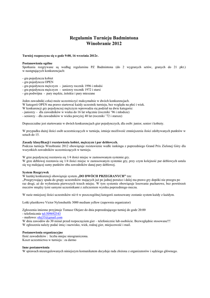 Regulamin Turnieju Badmintona Winobranie 2012 Turniej rozpoczyna się o godz 9:00, 16 września 2012r. Postanowienia ogólne Spotkania rozgrywane są według regulaminu PZ Badmintona (do 2 wygranych setów, granych do 21 pkt.) w następujących konkurencjach: - gra pojedyncza kobiet - gra pojedyncza OPEN - gra pojedyncza mężczyzn - juniorzy rocznik 1996 i młodsi - gra pojedyncza mężczyzn - seniorzy rocznik 1972 i starsi - gra podwójna - pary męskie, żeńskie i pary mieszane Jeden zawodnik(-czka) może uczestniczyć maksymalnie w dwóch konkurencjach. W kategorii OPEN ma prawo startować każdy uczestnik turnieju, bez względu na płeć i wiek. W konkurencji gry pojedynczej mężczyzn wprowadza się podział na dwie kategorie: - juniorzy – dla zawodników w wieku do 16 lat włącznie (roczniki ’96 i młodsze) - seniorzy – dla zawodników w wieku powyżej 40 lat (roczniki ’72 i starsze) Dopuszczalne jest startowanie w dwóch konkurencjach gier pojedynczych, dla osób: junior, senior i kobiety. W przypadku dużej ilości osób uczestniczących w turnieju, istnieje możliwość zmniejszenia ilości zdobywanych punktów w setach do 15. Zasady klasyfikacji i rozstawienia kobiet, mężczyzn i par deblowych. Podczas turnieju Winobranie 2012 obowiązuje rozstawienie wedle rankingu z poprzedniego Grand Prix Zielonej Góry dla wszystkich zawodników uczestniczących w turnieju. W grze pojedynczej rozstawia się 1/4 ilości miejsc w zastosowanym systemie gry. W grze deblowej rozstawia się 1/4 ilości miejsc w zastosowanym systemie gry, przy czym kolejność par deblowych ustala się wg malejącej sumy punktów obu zawodników danej pary deblowej. System Rozgrywek W każdej konkurencji obowiązuje system „DO DWÓCH PRZEGRANYCH” tzn: „Przegrywający spada do grupy uczestników mających już po jednej porażce i dalej ma prawo gry dopóki nie przegra po raz drugi, aż do wyłonienia pierwszych trzech miejsc. W tym systemie obowiązuje losowanie pucharowe, bez powtórzeń meczów między tymi samymi uczestnikami z zaliczeniem wyniku poprzedniego meczu. W razie mniejszej ilości uczestników niż 6 w poszczególnej kategorii zastosowany zostanie system każdy z każdym. Lotki plastikowe Victor Nylonshuttle 3000 medium yellow (zapewnia organizator) Zgłoszenia imienne przyjmuje Tomasz Olejarz do dnia poprzedzającego turniej do godz 20:00 - telefonicznie tel:509692543 - mailowo: [email protected] W dniu zawodów do 30 minut przed rozpoczęciem gier – telefonicznie lub osobiście. Bezwzględnie stosowane!!! W zgłoszeniu należy podać imię i nazwisko, wiek, rodzaj gier, miejscowość i mail. Postanowienia organizacyjne Ilość zawodników : liczba miejsc nieograniczona. Koszt uczestnictwa w turnieju : za darmo Inne postanowienia W sprawach nieuregulowanych niniejszym komunikatem decyduje rada złożona z organizatorów i sędziego głównego.