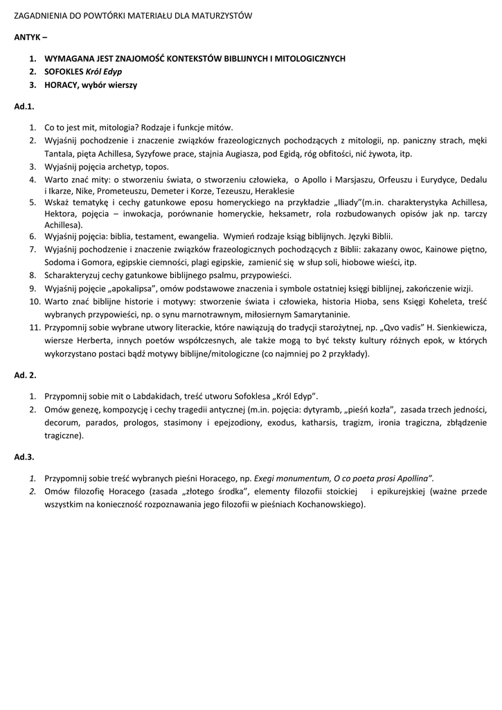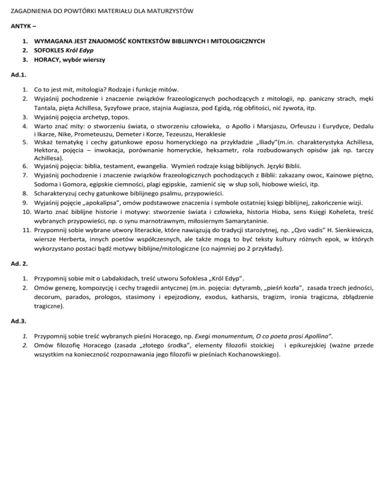 ZAGADNIENIA DO POWTÓRKI MATERIAŁU DLA MATURZYSTÓW ANTYK – 1. WYMAGANA JEST ZNAJOMOŚĆ KONTEKSTÓW BIBLIJNYCH I MITOLOGICZNYCH 2. SOFOKLES Król Edyp 3. HORACY, wybór wierszy Ad.1. 1. Co to jest mit, mitologia? Rodzaje i funkcje mitów. 2. Wyjaśnij pochodzenie i znaczenie związków frazeologicznych pochodzących z mitologii, np. paniczny strach, męki Tantala, pięta Achillesa, Syzyfowe prace, stajnia Augiasza, pod Egidą, róg obfitości, nić żywota, itp. 3. Wyjaśnij pojęcia archetyp, topos. 4. Warto znać mity: o stworzeniu świata, o stworzeniu człowieka, o Apollo i Marsjaszu, Orfeuszu i Eurydyce, Dedalu i Ikarze, Nike, Prometeuszu, Demeter i Korze, Tezeuszu, Heraklesie 5. Wskaż tematykę i cechy gatunkowe eposu homeryckiego na przykładzie „Iliady”(m.in. charakterystyka Achillesa, Hektora, pojęcia – inwokacja, porównanie homeryckie, heksametr, rola rozbudowanych opisów jak np. tarczy Achillesa). 6. Wyjaśnij pojęcia: biblia, testament, ewangelia. Wymień rodzaje ksiąg biblijnych. Języki Biblii. 7. Wyjaśnij pochodzenie i znaczenie związków frazeologicznych pochodzących z Biblii: zakazany owoc, Kainowe piętno, Sodoma i Gomora, egipskie ciemności, plagi egipskie, zamienić się w słup soli, hiobowe wieści, itp. 8. Scharakteryzuj cechy gatunkowe biblijnego psalmu, przypowieści. 9. Wyjaśnij pojęcie „apokalipsa”, omów podstawowe znaczenia i symbole ostatniej księgi biblijnej, zakończenie wizji. 10. Warto znać biblijne historie i motywy: stworzenie świata i człowieka, historia Hioba, sens Księgi Koheleta, treść wybranych przypowieści, np. o synu marnotrawnym, miłosiernym Samarytaninie. 11. Przypomnij sobie wybrane utwory literackie, które nawiązują do tradycji starożytnej, np. „Qvo vadis” H. Sienkiewicza, wiersze Herberta, innych poetów współczesnych, ale także mogą to być teksty kultury różnych epok, w których wykorzystano postaci bądź motywy biblijne/mitologiczne (co najmniej po 2 przykłady). Ad. 2. 1. Przypomnij sobie mit o Labdakidach, treść utworu Sofoklesa „Król Edyp”. 2. Omów genezę, kompozycję i cechy tragedii antycznej (m.in. pojęcia: dytyramb, „pieśń kozła”, zasada trzech jedności, decorum, parados, prologos, stasimony i epejzodiony, exodus, katharsis, tragizm, ironia tragiczna, zbłądzenie tragiczne). Ad.3. 1. Przypomnij sobie treść wybranych pieśni Horacego, np. Exegi monumentum, O co poeta prosi Apollina”. 2. Omów filozofię Horacego (zasada „złotego środka”, elementy filozofii stoickiej i epikurejskiej (ważne przede wszystkim na konieczność rozpoznawania jego filozofii w pieśniach Kochanowskiego).