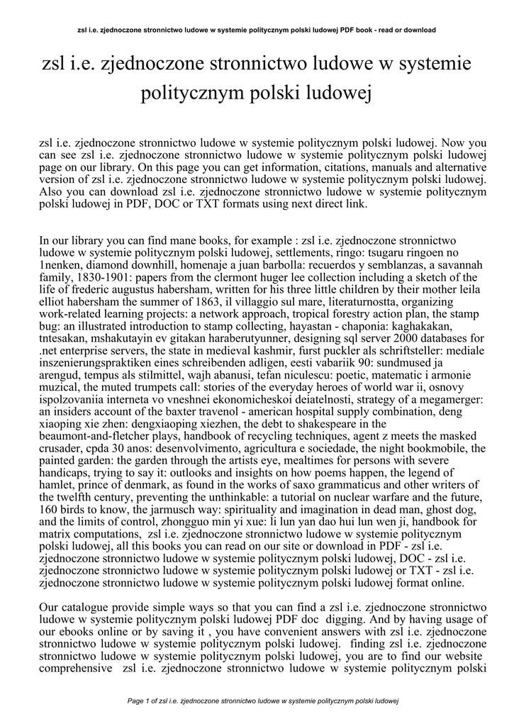zsl i.e. zjednoczone stronnictwo ludowe w systemie politycznym polski ludowej PDF book - read or download zsl i.e. zjednoczone stronnictwo ludowe w systemie politycznym polski ludowej zsl i.e. zjednoczone stronnictwo ludowe w systemie politycznym polski ludowej. Now you can see zsl i.e. zjednoczone stronnictwo ludowe w systemie politycznym polski ludowej page on our library. On this page you can get information, citations, manuals and alternative version of zsl i.e. zjednoczone stronnictwo ludowe w systemie politycznym polski ludowej. Also you can download zsl i.e. zjednoczone stronnictwo ludowe w systemie politycznym polski ludowej in PDF, DOC or TXT formats using next direct link. In our library you can find mane books, for example : zsl i.e. zjednoczone stronnictwo ludowe w systemie politycznym polski ludowej, settlements, ringo: tsugaru ringoen no 1nenken, diamond downhill, homenaje a juan barbolla: recuerdos y semblanzas, a savannah family, 1830-1901: papers from the clermont huger lee collection including a sketch of the life of frederic augustus habersham, written for his three little children by their mother leila elliot habersham the summer of 1863, il villaggio sul mare, literaturnostta, organizing work-related learning projects: a network approach, tropical forestry action plan, the stamp bug: an illustrated introduction to stamp collecting, hayastan - chaponia: kaghakakan, tntesakan, mshakutayin ev gitakan haraberutyunner, designing sql server 2000 databases for .net enterprise servers, the state in medieval kashmir, furst puckler als schriftsteller: mediale inszenierungspraktiken eines schreibenden adligen, eesti vabariik 90: sundmused ja arengud, tempus als stilmittel, wajh abanusi, tefan niculescu: poetic, matematic i armonie muzical, the muted trumpets call: stories of the everyday heroes of world war ii, osnovy ispolzovaniia interneta vo vneshnei ekonomicheskoi deiatelnosti, strategy of a megamerger: an insiders account of the baxter travenol - american hospital supply combination, deng xiaoping xie zhen: dengxiaoping xiezhen, the debt to shakespeare in the beaumont-and-fletcher plays, handbook of recycling techniques, agent z meets the masked crusader, cpda 30 anos: desenvolvimento, agricultura e sociedade, the night bookmobile, the painted garden: the garden through the artists eye, mealtimes for persons with severe handicaps, trying to say it: outlooks and insights on how poems happen, the legend of hamlet, prince of denmark, as found in the works of saxo grammaticus and other writers of the twelfth century, preventing the unthinkable: a tutorial on nuclear warfare and the future, 160 birds to know, the jarmusch way: spirituality and imagination in dead man, ghost dog, and the limits of control, zhongguo min yi xue: li lun yan dao hui lun wen ji, handbook for matrix computations, zsl i.e. zjednoczone stronnictwo ludowe w systemie politycznym polski ludowej, all this books you can read on our site or download in PDF - zsl i.e. zjednoczone stronnictwo ludowe w systemie politycznym polski ludowej, DOC - zsl i.e. zjednoczone stronnictwo ludowe w systemie politycznym polski ludowej or TXT - zsl i.e. zjednoczone stronnictwo ludowe w systemie politycznym polski ludowej format online. Our catalogue provide simple ways so that you can find a zsl i.e. zjednoczone stronnictwo ludowe w systemie politycznym polski ludowej PDF doc digging. And by having usage of our ebooks online or by saving it , you have convenient answers with zsl i.e. zjednoczone stronnictwo ludowe w systemie politycznym polski ludowej. finding zsl i.e. zjednoczone stronnictwo ludowe w systemie politycznym polski ludowej, you are to find our website comprehensive zsl i.e. zjednoczone stronnictwo ludowe w systemie politycznym polski Page 1 of zsl i.e. zjednoczone stronnictwo ludowe w systemie politycznym polski ludowej zsl i.e. zjednoczone stronnictwo ludowe w systemie politycznym polski ludowej PDF book - read or download ludowej manuals listed. These review site is the biggest of these which may have zsl i.e. zjednoczone stronnictwo ludowe w systemie politycznym polski ludowej, literally hundreds of thousands of different products represented. So as to there are particular sites catered to different product also types or categories, brands or niche categories related with zsl i.e. zjednoczone stronnictwo ludowe w systemie politycznym polski ludowej. So depending on what exactly you are searching, you will be able to choose ebooks zsl i.e. zjednoczone stronnictwo ludowe w systemie politycznym polski ludowej to suit your own needs, zsl i.e. zjednoczone stronnictwo ludowe w systemie politycznym polski ludowej. Page 2 of zsl i.e. zjednoczone stronnictwo ludowe w systemie politycznym polski ludowej