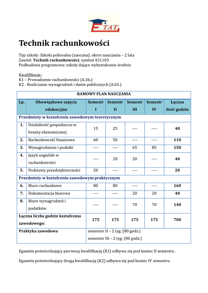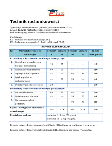 Technik rachunkowości Typ szkoły: Szkoła policealna (zaoczna); okres nauczania – 2 lata Zawód: Technik rachunkowości; symbol 431103 Podbudowa programowa: szkoły dające wykształcenie średnie Kwalifikacje: K1 – Prowadzenie rachunkowości (A.36.) K2 - Rozliczanie wynagrodzeń i danin publicznych (A.65.) RAMOWY PLAN NAUCZANIA Lp. Obowiązkowe zajęcia edukacyjne Semestr Semestr Semestr Semestr I II Łączna III IV ilość godzin Przedmioty w kształceniu zawodowym teoretycznym 1. Działalność gospodarcza w branży ekonomicznej 15 25 ---- ---- 40 2. Rachunkowość finansowa 60 50 ---- ---- 110 3. Wynagrodzenia i podatki ---- ---- 65 85 150 4. Język angielski w ---- 20 20 ---- 40 20 ---- ---- ---- 20 rachunkowości 5. Podstawy przedsiębiorczości Przedmioty w kształceniu zawodowym praktycznym 6. Biuro rachunkowe 80 80 ---- ---- 160 7. Dokumentacja biurowa ---- ---- 20 20 40 8. Biuro wynagrodzeń i ---- ---- 70 70 140 175 175 175 175 700 podatków Łączna liczba godzin kształcenia zawodowego: Praktyka zawodowa semester II – 2 tyg. (80 godz.) semester III – 2 tyg. (80 godz.) Egzamin potwierdzający pierwszą kwalifikację (K1) odbywa się pod koniec II semestru . Egzamin potwierdzający drugą kwalifikację (K2) odbywa się pod koniec IV semestru.