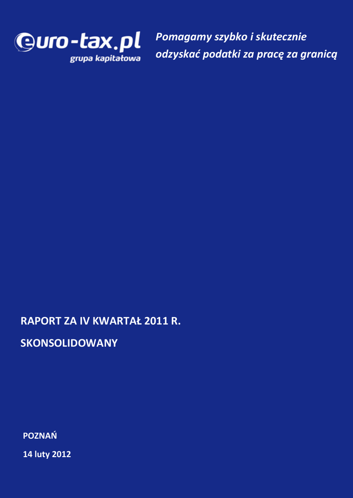 RAPORT ZA IV KWARTAŁ 2011 Pomagamy szybko i skutecznie odzyskać podatki za pracę za granicą RAPORT ZA IV KWARTAŁ 2011 R. SKONSOLIDOWANY POZNAO 14 luty 2012 em www.euro-tax.pl 1 | STRONA RAPORT ZA IV KWARTAŁ 2011 1. Informacje ogólne 1.1. Informacje podstawowe Nazwa Forma prawna: Siedziba: Telefon: Fax: Strona Internetowa: E-mail: REGON: NIP: Numer KRS: Zarząd: Liczba akcji: 1.2. Euro-Tax.pl S.A. Spółka Akcyjna 60-750 Poznao, ul. Wyspiaoskiego 14/2 +48 (61) 828 8102 +48 (61) 828 8122 www.euro-tax-sa.pl [email protected] 300855761 972-117-92-58 0000311384 Adam Powiertowski – Prezes Zarządu, Tomasz Jamrozy – Członek Zarządu 5 000 000 akcji serii A 250 000 akcji serii B Podstawowe obszary działalności Euro-Tax.pl SA jest spółką o charakterze holdingowym działającą od połowy 2008 roku, która koncentruje się na nadzorze i zarządzaniu Spółkami Zależnymi wchodzącymi w skład Grupy Kapitałowej Euro-Tax.pl. Grupa Kapitałowa Euro-Tax.pl działa na rynku związanym z emigracją zarobkową Polaków. Usługi skierowane są do ok. 3 milionów osób, które legalnie pracowały w Wielkiej Brytanii, Holandii, Irlandii, Niemczech, Norwegii, Belgii lub USA w ciągu ostatnich pięciu lat lub są tam zatrudnione obecnie. Podstawową działalnością Grupy Kapitałowej Euro-Tax.pl jest pozyskiwanie klientów i podejmowanie w ich imieniu czynności przed zagranicznymi urzędami skarbowymi, mających na celu złożenie wniosków i procedowanie odzyskania nadpłaconych zaliczek na podatek dochodowy a także od kwietnia 2011 oferowanie usług w zakresie pomocy w uzyskiwaniu zasiłków z Niemiec, Holandii i Norwegii Grupa Kapitałowa Euro-Tax.pl na poziomie operacyjnym generuje przychody ze świadczenia usługi zwrotu nadpłaconego podatku dochodowego przez Polaków pracujących poza granicami kraju. Dodatkowo, spółki wchodzące w skład Grupy Kapitałowej zajmują się również pośrednictwem finansowym przy realizacji czeków skarbowych związanych ze zwrotem podatku. www.euro-tax.pl 2 | STRONA RAPORT ZA IV KWARTAŁ 2011 1.3. Grupa Kapitałowa Euro-Tax.pl S.A. jest jednostką dominującą w stosunku do czterech Spółek Zależnych, wraz z którymi tworzy on Grupę Kapitałową Euro-Tax.pl. Spółkami zależnymi są następujące podmioty: Euro-Tax.pl Sp. z o.o. – największa w Polsce spółka zajmująca się obsługą klientów zainteresowanych odzyskaniem i rozliczeniem nadpłaconego podatku z tytułu pracy za granicą. Świadczy usługę e-commerce: spółka koncentruje się na pozyskiwaniu klientów za pośrednictwem Internetu oraz poprzez call center, działa w kanale B2C; CUF Sp. z o.o. – spółka wyspecjalizowana w procedowaniu i obsłudze zwrotów nadpłaconego podatku za pracę za granicą bezpośrednio przed tamtejszymi urzędami skarbowymi. Działalnośd CUF Sp. z o.o. oparta jest o procedowanie zwrotów nadpłaconego podatku przez klientów zgłoszonych przez Euro-Tax.pl Sp. z o.o. oraz innych partnerów na terenie Polski. CUF Sp. z o.o. działa w kanale B2B; EuroCredit Sp. z o.o. – spółka celowa oferująca usługi pośrednictwa finansowego i inkasa czeków. Oferta EuroCredit Sp. z .o.o. skierowana jest do podatnika samodzielnie realizującego zwrot podatku lub za pośrednictwem podmiotów konkurencyjnych względem spółek Grupy Kapitałowej. EuroCredit Sp. z o.o. działa w kanale B2C oraz B2B. SC Euro-tax.ro Servicii Fiscale Emigranti SRL - Spółka Zależna w Rumunii, która będzie koncentrowała się na pozyskiwaniu i obsłudze rumuoskojęzycznych klientów zainteresowanych zwrotem nadpłaconych zaliczek na podatek za pracę na terenie wybranych krajów Unii Europejskiej. Wejście Emitenta na rynek rumuoski jest elementem realizacji strategii Grupy Kapitałowej Euro-Tax.pl związanej z ekspansją usług zwrotu podatku za pracę za granicą skierowanych do obywateli krajów Europy Środkowo Wschodniej (CEE). Spółka jest obecnie na etapie pozyskiwania klientów. Przychody pojawią się w spółce w pierwszym kwartale 2012 roku. www.euro-tax.pl 3 | STRONA RAPORT ZA IV KWARTAŁ 2011 Calavados Investments II Sp. z o.o. (dawniej Euro-tax.pl Sp. z o.o.) – spółka pozostała po wniesieniu aportu przez Euro-tax.pl Sp. z o.o. do Calavados Investments Sp. z o.o. i zmianie nazwy Euro-tax.pl Sp. z o.o. na Calavados Investments II Sp. z o.o. oraz Calavados Investments Sp. z o.o. na Euro-tax.pl Sp. z o.o. Spółka jest obecnie wykorzystywana do działao w zakresie zwrotu podatku w punktach handlowych na terenie całej Polski. W dniu 2 listopada 2011 Sąd Rejonowy zarejestrował podwyższenie kapitału zakładowego spółki Calavados Investments Sp. z o.o.. Kapitał zakładowy Calavados Investments Sp. z o.o. został podwyższony o kwotę 12.856.000,00 zł, odpowiadającą 257.120 nowym udziałom o wartości nominalnej 50,00 zł każdy. Przed podwyższeniem kapitał zakładowy dzielił sie na 100 udziałów o wartości nominalnej 50,00 zł każdy. Wszystkie nowe 257.120 udziały w podwyższonym kapitale zakładowym, stanowiące 99,9% udziału objęła spółka zależna Emitenta - Euro-tax.pl Sp. z o.o. i pokryła je aportem w postaci zorganizowanej części przedsiębiorstwa, w skład aportu wchodził znak towarowy o wartości 6 780 tys. zł. Po wpisie rejestracji podwyższenia, kapitał zakładowy Calavados Investments sp. z o.o. wynosi obecnie 12.861.000,00 zł i dzieli się na 257.220 równych i niepodzielnych udziałów o wartości nominalnej 50 zł każdy udział. Sąd Rejonowy zarejestrował również : 1) w dniu 2 listopada 2011 zmianę firmy spółki Euro-tax.pl Sp. z o.o. na Calavados Investements II Sp. z o.o. 2) w dniu 2 listopada zmianę firmy spółki Calavados Investments Sp. z o.o. Obecna firma to Euro-tax.pl Sp. z o.o. Akcje spółki Euro-Tax.pl S.A. są od dnia 28 stycznia 2010 roku notowane w alternatywnym systemie obrotu na rynku NewConnect organizowanym przez Giełdę Papierów Wartościowych w Warszawie S.A. 1.4. Otoczenie rynkowe Dynamiczny 