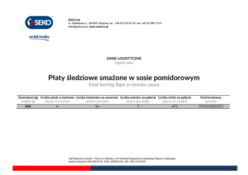 SEKO SA ul. Zakładowa 3, 89-620 Chojnice, tel. +48 52 510 81 40, fax +48 52 396 73 51 [email protected], www.sekosa.pl DANE LOGISTYCZNE logistic data Płaty śledziowe smażone w sosie pomidorowym fried herring flaps in tomato sauce Gramatura (g) Liczba sztuk w kartonie Liczba kartonów na warstwie Liczba warstw na palecie Liczba sztuk na palecie weight (g) pieces in a carton cartons per layer layers per pallet pieces on a pallet 800 6 16 7 672 Sąd Rejonowy Gdańsk - Północ w Gdańsku, VIII Wydział Gospodarczy Krajowego Rejestru Sądowego kapitał zakładowy 655 000,00 ZŁ, KRS: 0000255152, NIP: 586-010-29-90 Kod kreskowy barcode 5902353002203