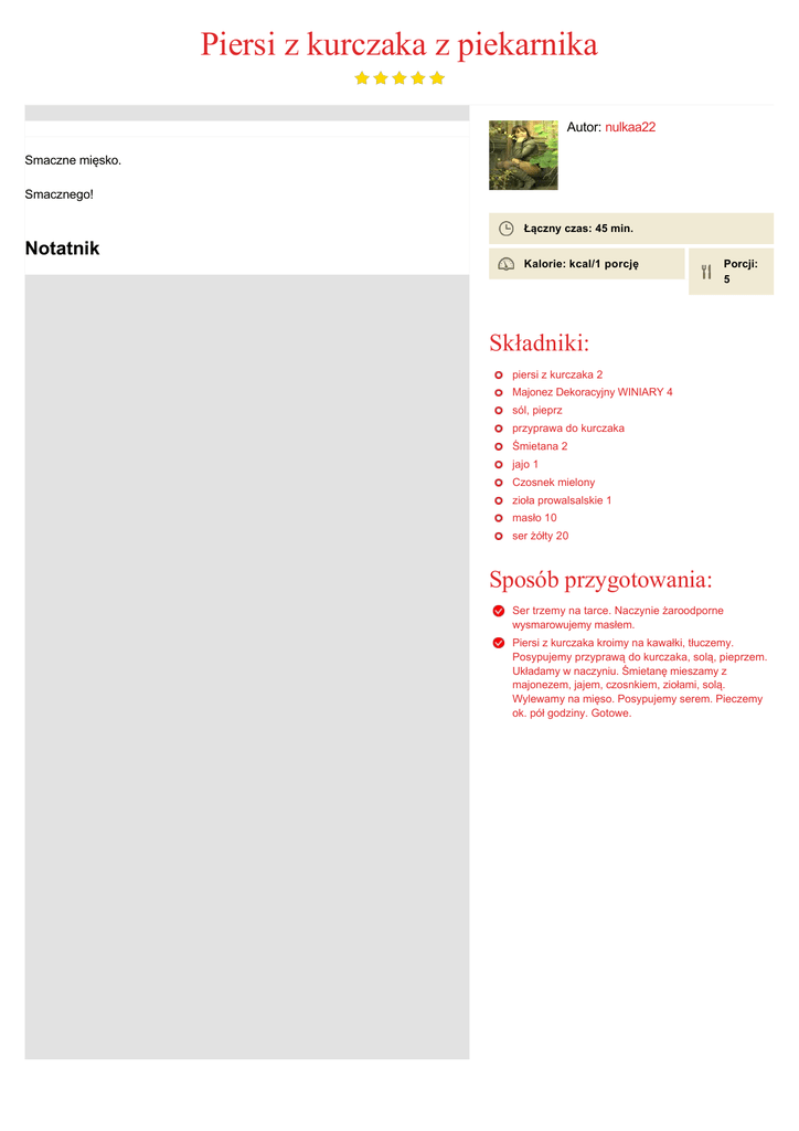 Piersi z kurczaka z piekarnika Autor: nulkaa22 Smaczne mięsko. Smacznego! Łączny czas: 45 min. Notatnik Kalorie: kcal/1 porcję Porcji: 5 Składniki: piersi z kurczaka 2 Majonez Dekoracyjny WINIARY 4 sól, pieprz przyprawa do kurczaka Śmietana 2 jajo 1 Czosnek mielony zioła prowalsalskie 1 masło 10 ser żółty 20 Sposób przygotowania: Ser trzemy na tarce. Naczynie żaroodporne wysmarowujemy masłem. Piersi z kurczaka kroimy na kawałki, tłuczemy. Posypujemy przyprawą do kurczaka, solą, pieprzem. Układamy w naczyniu. Śmietanę mieszamy z majonezem, jajem, czosnkiem, ziołami, solą. Wylewamy na mięso. Posypujemy serem. Pieczemy ok. pół godziny. Gotowe.