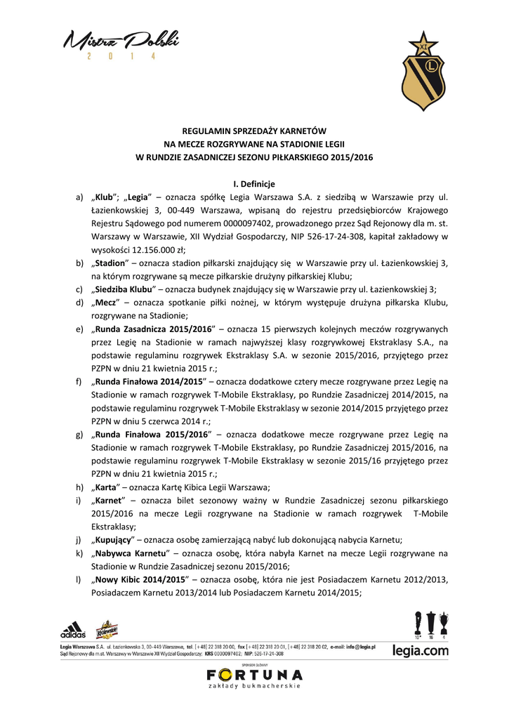 REGULAMIN SPRZEDAŻY KARNETÓW NA MECZE ROZGRYWANE NA STADIONIE LEGII W RUNDZIE ZASADNICZEJ SEZONU PIŁKARSKIEGO 2015/2016 a) b) c) d) e) f) g) h) i) j) k) l) I. Definicje „Klub”; „Legia” – oznacza spółkę Legia Warszawa S.A. z siedzibą w Warszawie przy ul. Łazienkowskiej 3, 00-449 Warszawa, wpisaną do rejestru przedsiębiorców Krajowego Rejestru Sądowego pod numerem 0000097402, prowadzonego przez Sąd Rejonowy dla m. st. Warszawy w Warszawie, XII Wydział Gospodarczy, NIP 526-17-24-308, kapitał zakładowy w wysokości 12.156.000 zł; „Stadion” – oznacza stadion piłkarski znajdujący się w Warszawie przy ul. Łazienkowskiej 3, na którym rozgrywane są mecze piłkarskie drużyny piłkarskiej Klubu; „Siedziba Klubu” – oznacza budynek znajdujący się w Warszawie przy ul. Łazienkowskiej 3; „Mecz” – oznacza spotkanie piłki nożnej, w którym występuje drużyna piłkarska Klubu, rozgrywane na Stadionie; „Runda Zasadnicza 2015/2016” – oznacza 15 pierwszych kolejnych meczów rozgrywanych przez Legię na Stadionie w ramach najwyższej klasy rozgrywkowej Ekstraklasy S.A., na podstawie regulaminu rozgrywek Ekstraklasy S.A. w sezonie 2015/2016, przyjętego przez PZPN w dniu 21 kwietnia 2015 r.; „Runda Finałowa 2014/2015” – oznacza dodatkowe cztery mecze rozgrywane przez Legię na Stadionie w ramach rozgrywek T-Mobile Ekstraklasy, po Rundzie Zasadniczej 2014/2015, na podstawie regulaminu rozgrywek T-Mobile Ekstraklasy w sezonie 2014/2015 przyjętego przez PZPN w dniu 5 czerwca 2014 r.; „Runda Finałowa 2015/2016” – oznacza dodatkowe mecze rozgrywane przez Legię na Stadionie w ramach rozgrywek T-Mobile Ekstraklasy, po Rundzie Zasadniczej 2015/2016, na podstawie regulaminu rozgrywek T-Mobile Ekstraklasy w sezonie 2015/16 przyjętego przez PZPN w dniu 21 kwietnia 2015 r.; „Karta” – oznacza Kartę Kibica Legii Warszawa; „Karnet” – oznacza bilet sezonowy ważny w Rundzie Zasadniczej sezonu piłkarskiego 2015/2016 na mecze Legii rozgrywane na Stadionie w ramach rozgrywek T-Mobile Ekstraklasy; „Kupujący” – oznacza osobę zamierzającą nabyć lub dokonującą nabycia Karnetu; „Nabywca Karnetu” – oznacza osobę, która nabyła Karnet na mecze Legii rozgrywane na Stadionie w Rundzie Zasadniczej sezonu 2015/2016; „Nowy Kibic 2014/2015” – oznacza osobę, która nie jest Posiadaczem Karnetu 2012/2013, Posiadaczem Karnetu 2013/2014 lub Posiadaczem Karnetu 2014/2015; m) „Posiadacz Karnetu 2012/2013” – oznacza osobę, która posiadała karnet przez cały sezon 2012/2013 lub karnet na Rundę Wiosenną 2013 na mecze Legii rozgrywane na Stadionie; n) „Posiadacz Karnetu 2013/2014” – oznacza osobę, która posiadała karnet przez cały sezon 2013/2014 lub karnet na Rundę Rewanżową 2013/2014 na mecze Legii rozgrywane na Stadionie; o) „Posiadacz Karnetu 2014/2015” – oznacza osobę, która posiadała karnet przez cały sezon 2014/2015 lub karnet na Rundę Rewanżową 2014/2015 na mecze Legii rozgrywane na Stadionie; p) „Dotychczasowy Posiadacz Karnetu” - oznacza osobę, która była Posiadaczem Karnetu 2012/2013, Posiadaczem Karnetu 2013/2014 lub Posiadaczem Karnetu 2014/2015; q) „PZPN” – oznacza Polski Związek Piłki Nożnej; r) „POK” – oznacza Punkt Obsługi Kibiców znajdujący się w Siedzibie Klubu; s) „Regulamin” – oznacza niniejszy regulamin sprzedaży karnetów na mecze Rundy Zasadniczej 2015/2016; t) „T–Mobile Ekstraklasa” – oznacza najwyższą klasę rozgrywek piłkarskich w Polsce, prowadzoną przez Ekstraklasę S.A. II. Postanowienia ogólne 1. Sprzedaż Karnetów prowadzona jest przez Klub. 2. Przez dokonanie zakupu Karnetu, Nabywca Karnetu wyraża akceptację niniejszego Regulaminu oraz następujących regulaminów: „Regulamin obiektu sportowego - stadionu piłkarskiego przy ul. Łazienkowskiej 3 w Warszawie Obiektu Sportowego”, „Regulamin imprezy masowej organizowanej na stadionie przy ul. Łazienkowskiej 3 w Warszawie”, które dostępne są na oficjalnej stronie Klubu www.legia.com. 3. Klub prowadzi sprzedaż Karnetów w dniach 3 czerwca 2015 r. – 30 września 2015 r. zgodnie z następującym harmonogramem: a) w dniach 3 czerwca 2015 r. od godz. 12:00 – 16 czerwca 2015 r. do godz. 9:00 – zamknięta sprzedaż Karnetów dla Posiadaczy Karnetów 2014/2015; b) w dniach 16 czerwca 2015 r. od godz. 11:00 – 22 czerwca 2015 r. do godz. 10:59 – wydzielona sprzedaż Karnetów dla Posiadaczy Karnetów 2012/2013 lub Posiadaczy Karnetów 2013/2014; c) w dniach 22 czerwca 2015 r. od godz. 11:00 – 30 września 2015 r. do godz. 23.59 – otwarta sprzedaż Karnetów dla wszystkich Kupujących. 4. Warunkiem zakupu Karnetu jest posiadanie ważnej Karty z wbudowanym mikroprocesorem, wydawanej przez Klub od 1 lipca 2012 roku. 5. Karnet można zakupić w następujący sposób: a) poprzez transakcję online za pośrednictwem oficjalnej strony Klubu www.legia.com; b) w kasach Klubu przy ul. Łazienkowskiej 3 w Warszawie; c) poprzez stronę www.karnetnaraty.legia.com umożliwiającą dokonanie zakupu Karnetu na raty poprzez system płatności Raty PayU i odbiorem Karnetu w kasach Klubu. 6. Karnet obejmuje prawo do uczestnictwa w meczach I drużyny piłkarskiej Klubu w Rundzie Zasadniczej 2015/2016 oraz w rozgrywkach Pucharu Polski, z zastrzeżeniem ust. 7, 8 i 9 poniżej. Liczba meczów objętych Karnetem może zostać zwiększona w drodze decyzji Zarządu Klubu. 7. Karnet nie obejmuje meczów w Rundzie Finałowej 2015/2016, rozgrywanych po zakończeniu Rundy Zasadniczej 2015/2016. 8. Karnet nie obejmuje ewentualnych meczów w finale rozgrywek Pucharu Polski oraz meczu o Superpuchar. 9. Karnet nie obejmuje innych niż określone w ust. 6 powyżej meczów I drużyny piłkarskiej Klubu, w tym w szczególności meczów rozgrywanych na Stadionie w rozgrywkach prowadzonych przez UEFA, w tym Ligi Europy lub Ligi Mistrzów, a także innych spotkań towarzyskich, chyba że Zar