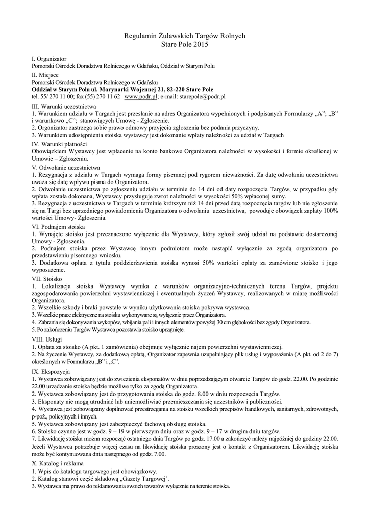 Regulamin Żuławskich Targów Rolnych Stare Pole 2015