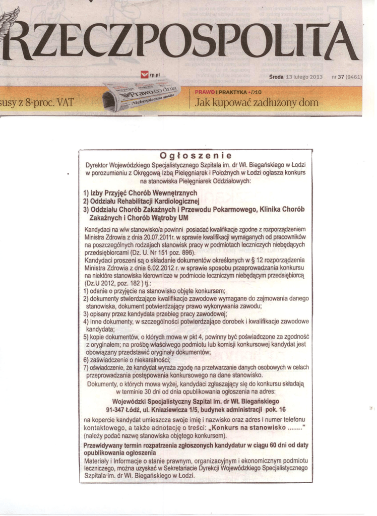 ZECZPOSPOL =rp.pl PL Środa 13 lutego 2013 P AWO I PRAKTYKA .D10 msy z B-proc. VAT Jak kupować zadłużony dom F Ogłoszenie Dyrektor Wojewódzkiego Specjalistycznego Szprtala im. dr Wł. Biegańskiego w Łodzi w porozumieniu z Okręgową Izbą Pielęgniarek i Połotnych w Łodzi ogłasza konkurs na stanowiska Pielęgniarek Oddziałowych: 1) Izby Przyjęć Chorób Wewnę rznych 2) Oddziału Rehabilitacji KardlologlczneJ 3) Oddziału Chorób Zakaźnych i Przewodu Pokannowego, Zakaźnych ł Chorób Wątroby UM Klinika Chorób Kandydaci na wtw stanowisko/a powinni posiadać kwalifikacje zgodne z rozporządzeniem Ministra Zdro 'a z dnia 20.07.2011r. w sprawie kwaliflkacj wymaganych od pracowników na poszczególnych rodzajach stanowis pracy w podmiotach leczniczych niebędących przedsiębiorcami (Dz. U. Nr 151 poz. 896). Kandydaci proszeni są o składanie dokumentów okreśłonych w § 12 rozporządzenia Ministra Zdrowia z dnia 6.02.2012 r. sprawie sposobu przeprowadzania konkursu na niektóre stanowiska kierownicze w podmiocie leczni(2}'ffi n będą~ przedsiębiorcą (Oz.U 2012, poz. 182) tj.: 1) oda nie o przyjęcie na stanowisko objęte konkursem; 2) dokumenty stwierdzające kwalifikacje zawodowe wymagane do zajmowania danego stanowis a, dokument potwierdzający prawo wykonywania zawodu; 3) op sany przez kandydata przeb eg pracy zawodowe}: 4} Inne dokumenty, w szczególności potwierdzające dorobek i kwalifikacje zawodowe kandydata; 5) kopie dokumentów, o k1órycłl mowa w pkt 4. powinny być poświadczone za zgodność z oryginałem; na pro bę wla ciwego podmiotu lub komisji konkursowej kandydat jest obowiązany przeostawić oryginały dokumentów; 6) zaświadczenie o niekaralnoścł; 7) oświadczenie, że kandydat wyraża zgodę na przetwarzanie danych osobowych w celach przeprowadzania postępowania onkursowego na dane stano iska. Dokumenty. o których mowa wy!ej, kandydaci zgłaszający się do konkursu kładają w terminie 30 dni od dnia opublikowania ogłoszenia na adres: Wojew6dzkl Specjalistyczny Szpital Im. dr Wł. BIegań kiego 91 341 Łódź, ul. Kniaziewlcza 1/5, budynek admln ejl pok. 16 na kopercie kandydat umieszcza swoje Imię i nazwisko oraz adres i numer telefonu kontaktowego. a także adnotację o treści: "Konkurs na stanowi ko ........• (należy podać nazwę stanowiska objętego konkursem). Przewidywany termin rozpatrzenia zgłoszonych kandydatur w ciągu 60 dni od daty opublikowania ogłoszenia Materiały i Informacje o stanie prawnym. organizacyjnym i ekonomicznym podmiotu leczniczego, można uzyskać w Sekretariacie DyrekCjI WojewódzkIego Specjalistycznego Szpitala im. dr Wl. BIegańskiego w lodzi. nr 37 (9461)
