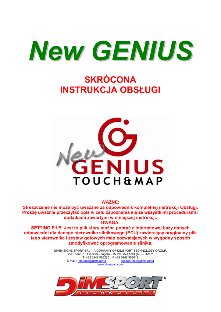New GENIUS SKRÓCONA INSTRUKCJA OBSŁUGI WAŻNE: Streszczenie nie może być uważane za odpowiednik kompletnej instrukcji Obsługi. Proszę uważnie przeczytać opis w celu zapoznania się ze wszystkimi procedurami i dodatkami zawartymi w niniejszej instrukcji. UWAGA: SETTING FILE: Jest to plik który można pobrać z internetowej bazy danych odpowiedni dla danego sterownika silnikowego (ECU) zawierający oryginalny plik tego sterownika i zestaw gotowych map pozwalających w wygodny sposób zmodyfikować oprogramowanie silnika. DIMENSIONE SPORT SRL – A COMPANY OF DIMSPORT TECHNOLOGY GROUP. Via Torino, 16 Frazione Piagera - 15020 GABIANO (AL) – ITALY T. +39 0142 955220 F +39 0142 955012 E-mail : [email protected] [email protected] www.dimsport.com NEW GENIUS ABSTRACT FROM THE OPERATIVE MANUAL March 2010 Ver.0.5 Pag. 2/10 NEW GENIUS ABSTRACT FROM THE OPERATIVE MANUAL March 2010 Ver.0.5 ODCZYT PRZEZ ZŁĄCZE OBD Zlokalizuj złącze diagnostyczne OBD pojazdu i podepnij właściwą wtyczkę dołączoną do zestawu New Genius: w menu głównym, wybierz WORK Vehicles Wybierz PRODUCENTA MODELTYP Aby odnaleźć pojazd który chcesz odczytać Po wejściu wymagany protokół szeregowy jest włączony. Wybierz przycisk ID lub czytania (READING). Niektóre protokoły pozwalają wybrać między K-LINE/CAN ID (IDENTYFIKATOR): New Genius identyfikuje HW(hardware) i SW(software) numery seryjnego ECU. Po zapisaniu ID, ekran wraca do menu wyboru następnej operacji z protokołem szeregowym. CZYTANIE(READING): New Genius ponownie identyfikuje HW i SW ECU , a następnie rozpoczyna procedurę czytania. Zapisz informacje uzyskane z ID, przydatne do znalezienia wymaganego SETTING FILE dla zmian w RACE (jeśli wcześniej nie pobrano z naszej bazy danych plików /ustawień). Po zakończeniu procedury odczytu, zapisz plik z dowolną nazwą dodając rozszerzenie (ORI). Musisz zapamiętać tę nazwę podczas przenoszenia go do komputera PC. * Jeśli protokół szeregowy obsługuje zarówno K-line i CAN, oba kanały będą dostępne dla komunikacji szeregowej. W przypadku, gdy pojazd nie obsługuje linii komunikacyjnej wybranej do czytania, New Genius nie otrzyma odpowiedzi od ECU: w rezultacie wystąpi "wake up error " (błąd komunikacji). W tym przypadku, po prostu wrócić do menu protokołu i wybierz inny protokół komunikacji K-LINE lub CAN. Pag. 3/10 NEW GENIUS ABSTRACT FROM THE OPERATIVE MANUAL March 2010 Ver.0.5 IMPORT ODCZYTANEGO ECU DO PROGRAMU RACE2000 Po wybraniu wymaganego SETTING FILE znajdującego się w RACE, podłaczyć konsolę do PC. Jeśli nie ma pliku na liście należy najpierw pobrać go z naszej internetowej bazy danych i zaimportować je do RaceEvo. Wybierz: File ECU Management Select MANUFACTURER MODEL TYPE, wtedy zaznacz wymagany SETTING FILE odpowiedni dla danego auta Po otwarciu pliku odpowiedniego dla danego auta naciśnij (po prawej stronie:) GENIUS IMPORT IMAGE FROM GENIUS.(zaimportuj plik z konsoli GENIUS) Wybierz plik odczytany z auta i załaduj go do RAM 2 naciskając UPLOAD RAM 2 ć Wybierz plik odczytany wcześniej z ECU. Wprowadź nazwę i rozszerzenie dla importowanego pliku: ORI original file MOD modified file Wybierz plik ORI zaimportowany wraz z setingiem i załaduj do RAM 1 przez naciśniecie UPLOAD RAM 1 Wybierz OK Po tych czynnościach możesz: □ ORI oryginalny plik dostarczony z internetowej bazy załadowany do RAM 1 □ Plik ORI odczytany z samochodu załadowany do RAM 2 Ta operacja pozwala na porównanie plików, odczytanego z pojazdu i oryginalnego z bazy internetowej. TYLKO plik znajdujący się w RAM2 może być modyfikowany. Po modyfikacji, trzeba najpierw zapisać plik, a następnie można go wyeksportować do konsoli New Genius. Pag. 4/10 NEW GENIUS ABSTRACT FROM THE OPERATIVE MANUAL March 2010 Ver.0.5 EKSPORT PLIKU DO KONSOLI Po zakończeniu modyfikacji, gdy nowy plik zostanie utworzony, musisz wyeksportować plik i przenieś go do New Genius. Narzędzie musi być podłączone do zasilania i do komputera. Zmieniony i utworzony plik można znaleźć w poprzedno używanym SETTING FILE: odnajdź właściwy plik zgodnie z nazwą (xxx.MOD) Wybierz GENIUS WRITE IMAGE TO GENIUS wpisz kopię wybranego pliku do New Genius. Wybierz zmodyfikowany plik, który chcesz wyeksportować i zaprogramować za pomocą New Genius Plik zostanie zapisany w pamięci karty SD New Genius , gotowy do zaprogramowania w aucie. Po tej operacji i zaimportowaniu zmodyfikowanego pliku do konsoli New Genius możesz iść do pojazdu, nawiązać połączenie przez gniazdo diagnostyczne OBD między pojazdem a konsolą i wykonać operację zapisu zmodyfikowanego programu do ECU. Pag. 5/10 NEW GENIUS ABSTRACT FROM THE OPERATIVE MANUAL March 2010 Ver.0.5 PROGRAMOWANIE PRZEZ ZŁACZE OBD W celu uzyskania stabilnej komunikacji i zapisania programu bez problemów, zalecamy stosowanie STABILIZOWANGO ŹRÓDŁA ZASILANIA (np. Booster) podłączonego do akumulatora pojazdu. Zlokalizuj złącze diagnostyczne OBD pojazdu i podepnij właściwą wtyczkę dołączoną do zestawu New Genius: w menu głównym, naciśnij WORK Vehicles WYBIERZ PRODUCENTA MODELTYP Aby odnaleźć pojazd który chcesz zaprogramować Po wejściu do menu protokołu szeregowego wybierz WRITING (zapis). Jeśli protokół szeregowy obsługuje K-LINE i CAN wybierz ten którego użyłeś do odczytu READING. Wybierz zmodyfikowany plik który chcesz zapisać do ECU Podążaj za wyświetlaną instrukcją w celu właściwego zaprogramowania ECU Po zakończeniu procedury wyboru auta i pliku do zapisu komunikacja jest uruchomiona, numery HW i SW z ECU wyświetlane są ponownie. Procedura jest zakończona, a ECU zostało poprawnie napisane wcześniej wybranym zmodyfikowanym plikiem. Pag. 6/10 NEW GENIUS ABSTRACT FROM THE OPERATIVE MANUAL March 2010 Ver.0.5 “PLIK DS” DLA NASZEGO WSPARCIA TECHNICZNEGO Jeśli czytasz oryginalne ECU, którego numery HW i SW nie znajdują się w istniejących plikach SETTING FILE naszej bazy danych (a więc nie 