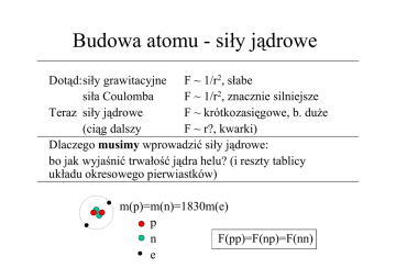 Budowa atomu - siły jądrowe Dotąd:siły grawitacyjne F ~ 1/r2, słabe siła Coulomba F ~ 1/r2, znacznie silniejsze Teraz siły jądrowe F ~ krótkozasięgowe, b. duŜe (ciąg dalszy F ~ r?, kwarki) Dlaczego musimy wprowadzić siły jądrowe: bo jak wyjaśnić trwałość jądra helu? (i reszty tablicy układu okresowego pierwiastków) m(p)=m(n)=1830m(e) p n F(pp)=F(np)=F(nn) e Budowa atomu – notacja (Z, M) Nr Z=p=1 nazwa 1H1 n=0 wodór (n p stabilny?, n: 25min (1/6700) 1H2 n=1 deuter (ślad) 1H3 n=2 tryt Z=p=2 2He3 n=1 hel-3 2He4 n=2 hel (cząstka α to He++) M 1 1 m 1,00783 1,00867) 2 3 3 4 2,01410 3,01605 3,01603 4,00260 Budowa atomu – notacja (Z, M) Nr nazwa M m 2He5 n=3 5 5,0122? Z=p=3 3Li6 n=3 lit 6 6,01703 Z=p=6 6C12 n=6 węgiel 12 12 6C14 n=8 węgiel 14 14,00324 (definicja, 1jam=masa(węgiel)/12=931.5MeV, E=mc2) (C14 promieniotwórczy, datowanie) ... Z=p=92 92U235 T=0,102·1010 lat 0,7% Z=p=92 92U238 T=0,652·1010 lat 99,3% wiek Ziemi 10·109 lat, (Wszechświata 15·109 lat) Energia reakcji jądrowych energia wiązania (około 8MeV) E(He4)=E(n)+E(n)+E(p)+E(p)-Q/4 4,0026=2·1,00867+2·1,00783 – 0,0304·931,5MeV fuzja, próg reakcji H2 + H2 He3 + n + 3,24MeV 2,01410+2,01410 3,01605+1,00867+0,00348·931,5MeV H2 + H2 He4 + 23,8MeV 2,01410+2,01410 4,0026 +0,0256·931,5MeV rozszczepienie 92U235 + 0n1 n + n + 54Xe140 + 38Sr94 + 200MeV Rozpad promieniotwórczy promieniotwórczość naturalna, 4 rodziny promieniotwórcze 4n+3: 92U235 (0,102·1010 lat) 2α4 + 90Th*231+Q 4n+2: 92U238(0,652·1010 lat) 2α4 + 90Th*234+4,25MeV 4n+1: 93Np237(0,0003·1010 lat) 4n+0: 90Th232(2·1010 lat) prawo rozpadu promieniotwórczego N (t ) = N 0 ⋅ e − λ ⋅t T= log 2 λ Promieniowanie α,β,γ Z M energia α +2 4 monoenergetyczne β+ +1 0 0..max neutrino ν β-1 0 0..max neutrino ν γ 0 0 monoenergetyczne pochłanianie promieniowania γ uwagi elektron? I ( x) = I 0 ⋅ e − µ ⋅x µ(E) = µf + µc + µp µf maleje z E µc wolniejsze malenie µp próg E=2mc2 = 1,02MeV Schemat rozpadu cezu – promieniowanie γ 55Cs137 (8%) β(1,18MeV) + 56Ba137 55Cs137 (92%)β(0,52MeV) + 56Ba*137 56Ba*137 γ(0,66MeV) + 56Ba137