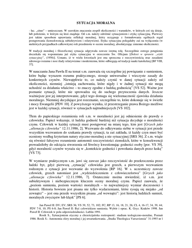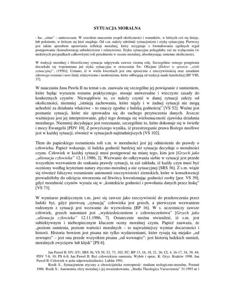 SYTUACJA MORALNA - łac. „situo” – umieszczam. W szerokim znaczeniu zespół okoliczno ci i warunków, w których co si dzieje, lub poło enie, w którym si kto znajduje. Od s.m. nale y odró ni sytuacjonizm i etyk sytuacyjn . Pierwszy jest takim sposobem uprawiania refleksji moralnej, który rezygnuje z formułowania ogólnych reguł post powania (konsekwencj subiektywizm i relatywizm). Etyka sytuacyjna polegałaby za na wył czeniu (w niektórych przypadkach całkowitym) roli przedmiotu w ocenie moralnej, absolutyzuj c zmienne okoliczno ci. W tradycji moralnej i filozoficznej sytuacja odgrywała zawsze istotn rol . Szczególnie ostrego pot pienia doczekała si wspomniana ju etyka sytuacyjna w orzeczeniu w. Oficjum [Dekret w sprawie „etyki sytuacyjnej”, (1956)]. Uznano, i w wielu kwestiach jest ona sprzeczna z rzeczywisto ci oraz zasadami zdrowego rozumu i nosi lady relatywizmu i modernizmu, które odbiegaj od tradycji nauki katolickiej [BF VIII, 37]. W nauczaniu Jana Pawła II na temat s.m. zauwa a si szczególne jej powi zanie z sumieniem, które b d c wyrazem rozumu praktycznego, stosuje uniwersalne i wieczyste zasady do konkretnych czynów. Niew tpliwie to, co nale y czyni w danej sytuacji zale y od okoliczno ci, niemniej „istniej zachowania, które nigdy i w adnej sytuacji nie mog uchodzi za działania wła ciwe – to znaczy zgodne z ludzk godno ci ” [VS 52]. Wa ne jest poznanie sytuacji, które nie sprowadza si do suchego przytoczenia danych. Jeszcze wa niejsze jest jej interpretowanie, gdy tego domaga si wieloznaczno zjawiska działania moralnego. Niemniej decyduj ce jest rozeznanie, szczególnie to, które dokonuje si w wietle i mocy Ewangelii [PDV 10]. Z powy szego wynika, i przestrzeganie prawa Bo ego mo liwe jest w ka dej sytuacji, równie w sytuacjach najtrudniejszych [VS 102]. Tłem do papieskiego rozumienia roli s.m. w moralno ci jest jej odniesienie do prawdy o człowieku. Papie wskazuje, i ludzka godno bardziej ni sytuacja decyduje o moralno ci czynu. Człowiek w ka dej sytuacji musi post powa na miar tego, kim jest [Grzech jako „alienacja człowieka” 12.11.1986, 2]. Wezwanie do odkrywania siebie w sytuacji jest przede wszystkim wezwaniem do szukania prawdy sytuacji, ta za zakłada, i ka dy czyn musi by oceniony według kryterium natury etyczno-moralnej a nie sytuacyjnej [SRS 36]. Z s.m. wi e si równie fałszywe rozumienie autonomii rzeczywisto ci ziemskich, które w konsekwencji prowadziłoby do odci cia stworzenia od Stwórcy kwestionuj c godno ci osoby [por. VS 39], gdy moralno czynów wyra a si w „kontek cie godno ci i powołania danych przez łask ” [VS 73]. W wymiarze praktycznym s.m. jawi si zawsze jako rzeczywisto do przekroczenia przez ludzki byt, gdy pierwsz „sytuacj ” człowieka jest grzech, a pierwszym wezwaniem rodzonym z sytuacji jest wezwanie do wyzwolenia [RP 16]. W s. uczestniczy zawsze człowiek, grzech natomiast jest „wydziedziczeniem z człowiecze stwa” [Grzech jako „alienacja człowieka” 12.11.1986, 7]. Ostatecznie mo na stwierdzi , i s.m. jest subiektywnym i niebezpiecznym kluczem oceny moralnej czynu. Papie zauwa a, e „poziom sumienia, poziom warto ci moralnych – to najwa niejszy wymiar doczesno ci i historii. Historia bowiem jest pisana nie tylko wydarzeniami, które rysuj si niejako „od zewn trz” – jest ona przede wszystkim pisana „od wewn trz”: jest histori ludzkich sumie , moralnych zwyci stw lub kl sk” [PS 6]. Jan Paweł II: DV; EV; SRS 36; VS 39, 52, 73, 102; FC; RP 13, 16, 18, 21, 26; CL 4, 16-17, 34, 39, 44; PDV 7-8, 10; PS 6-8; Jan Paweł II: By człowiekiem sumienia. Wybór i oprac. K. Gryz. Kraków 1998. Jan Paweł II: Człowiek w polu odpowiedzialno ci. Lublin 1991. Rosik S., Sytuacjonizm etyczny a chrze cija ska roztropno : studium teologiczno-moralne, Pozna 1986. Rosik S.: Autonomia sfery moralnej i jej uwarunkowania. „Studia Theologica Varsaviensia” 31:1993 nr l 2 s. 43-76. Rosik S.: Problem etycznego sytuacjonizmu. W: Teologia moralna u kresu II tysi clecia. Materiały z sympozjum KUL 1-2 grudnia 1997 r. Red. J. Nagórny, K. Je yna. Lublin 1998 s. 171-177. Jarosław A. Sobkowiak MIC