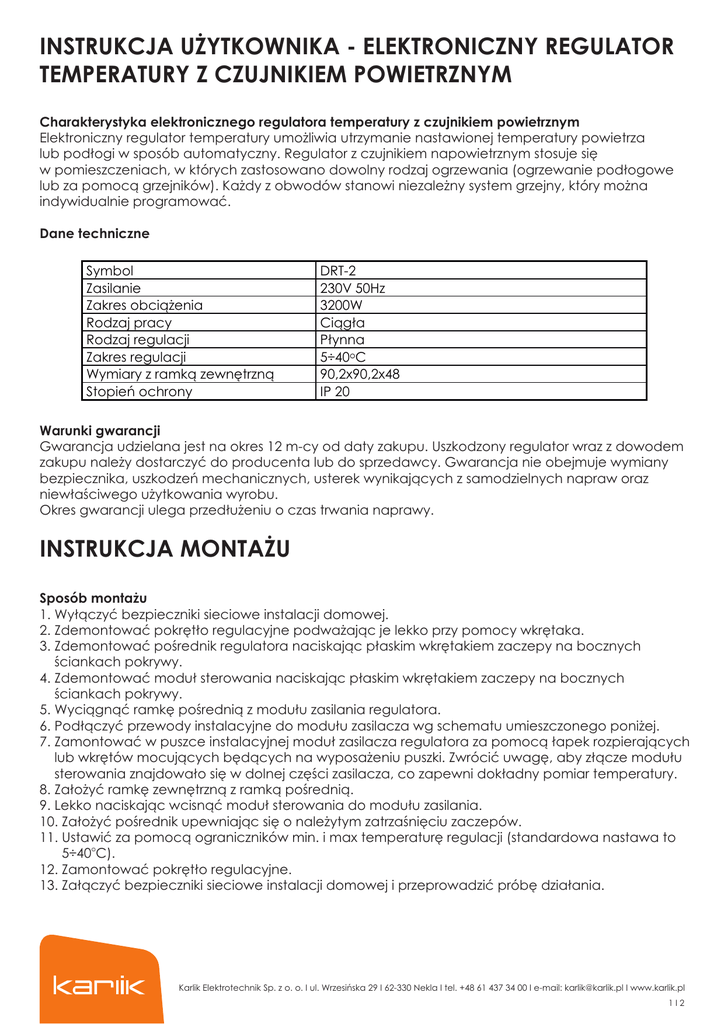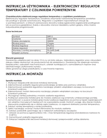 INSTRUKCJA UŻYTKOWNIKA - ELEKTRONICZNY REGULATOR TEMPERATURY Z CZUJNIKIEM POWIETRZNYM Charakterystyka elektronicznego regulatora temperatury z czujnikiem powietrznym Elektroniczny regulator temperatury umożliwia utrzymanie nastawionej temperatury powietrza lub podłogi w sposób automatyczny. Regulator z czujnikiem napowietrznym stosuje się w pomieszczeniach, w których zastosowano dowolny rodzaj ogrzewania (ogrzewanie podłogowe lub za pomocą grzejników). Każdy z obwodów stanowi niezależny system grzejny, który można indywidualnie programować. Dane techniczne Symbol Zasilanie Zakres obciążenia Rodzaj pracy Rodzaj regulacji Zakres regulacji Wymiary z ramką zewnętrzną Stopień ochrony DRT-2 230V 50Hz 3200W Ciągła Płynna 5÷40oC 90,2x90,2x48 IP 20 Warunki gwarancji Gwarancja udzielana jest na okres 12 m-cy od daty zakupu. Uszkodzony regulator wraz z dowodem zakupu należy dostarczyć do producenta lub do sprzedawcy. Gwarancja nie obejmuje wymiany bezpiecznika, uszkodzeń mechanicznych, usterek wynikających z samodzielnych napraw oraz niewłaściwego użytkowania wyrobu. Okres gwarancji ulega przedłużeniu o czas trwania naprawy. INSTRUKCJA MONTAŻU Sposób montażu 1. Wyłączyć bezpieczniki sieciowe instalacji domowej. 2. Zdemontować pokrętło regulacyjne podważając je lekko przy pomocy wkrętaka. 3. Zdemontować pośrednik regulatora naciskając płaskim wkrętakiem zaczepy na bocznych ściankach pokrywy. 4. Zdemontować moduł sterowania naciskając płaskim wkrętakiem zaczepy na bocznych ściankach pokrywy. 5. Wyciągnąć ramkę pośrednią z modułu zasilania regulatora. 6. Podłączyć przewody instalacyjne do modułu zasilacza wg schematu umieszczonego poniżej. 7. Zamontować w puszce instalacyjnej moduł zasilacza regulatora za pomocą łapek rozpierających lub wkrętów mocujących będących na wyposażeniu puszki. Zwrócić uwagę, aby złącze modułu sterowania znajdowało się w dolnej części zasilacza, co zapewni dokładny pomiar temperatury. 8. Założyć ramkę zewnętrzną z ramką pośrednią. 9. Lekko naciskając wcisnąć moduł sterowania do modułu zasilania. 10. Założyć pośrednik upewniając się o należytym zatrzaśnięciu zaczepów. 11. Ustawić za pomocą ograniczników min. i max temperaturę regulacji (standardowa nastawa to o 5÷40 C). 12. Zamontować pokrętło regulacyjne. 13. Załączyć bezpieczniki sieciowe instalacji domowej i przeprowadzić próbę działania. Karlik Elektrotechnik Sp. z o. o. I ul. Wrzesińska 29 I 62-330 Nekla I tel. +48 61 437 34 00 I e-mail: [email protected] I www.karlik.pl 1I2 INSTRUKCJA UŻYTKOWNIKA - ELEKTRONICZNY REGULATOR TEMPERATURY Z CZUJNIKIEM POWIETRZNYM Schemat elektryczny podłączenia regulatora temperatury L N DRT-2 L N L’ N Wymagane akcesoria do elektronicznego regulatora temperatury z czujnikiem powietrznym Do kompletu z elektronicznym regulatorem temperatury DRT-2 należy dokupić ramkę zewnętrzną pojedynczą ...DR-1 lub wielokrotną ...DR-2 ÷ ...DR-5 dostępną w różnych wariantach kolorystycznych z tworzywa, drewna naturalnego lub o efekcie szkła. Uwaga! Instalacja musi zostać wykonana przez osobę o odpowiednich kwalifikacjach przy wyłączonym napięciu oraz musi odpowiadać krajowym normom bezpieczeństwa. Elektroniczny regulator temperatury z czujnikiem powietrznym - elementy składowe pokrętło ograniczniki pośrednik regulatora moduł sterowania ramka pośrednia serii DECO ramka zewnętrzna serii DECO moduł zasilania Karlik Elektrotechnik Sp. z o. o. I ul. Wrzesińska 29 I 62-330 Nekla I tel. +48 61 437 34 00 I e-mail: [email protected] I www.karlik.pl 2I2