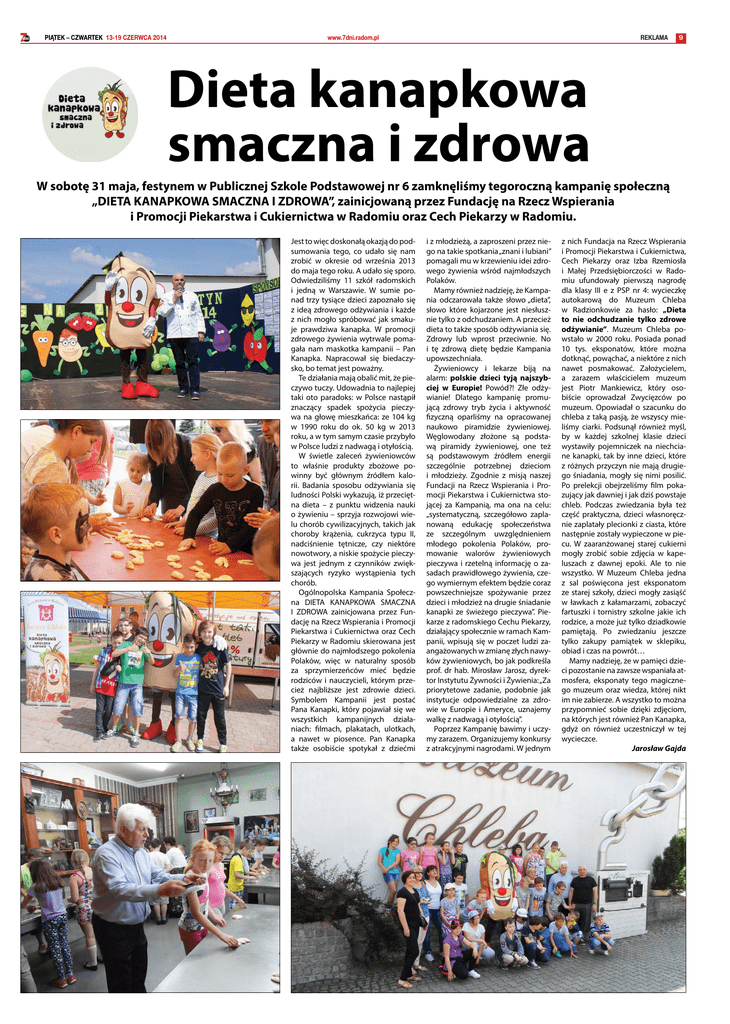 PIĄTEK – CZWARTEK 13-19 CZERWCA 2014 REKLAMA www.7dni.radom.pl 9 Dieta kanapkowa smaczna i zdrowa W sobotę 31 maja, festynem w Publicznej Szkole Podstawowej nr 6 zamknęliśmy tegoroczną kampanię społeczną „DIETA KANAPKOWA SMACZNA I ZDROWA”, zainicjowaną przez Fundację na Rzecz Wspierania i Promocji Piekarstwa i Cukiernictwa w Radomiu oraz Cech Piekarzy w Radomiu. Jest to więc doskonałą okazją do podsumowania tego, co udało się nam zrobić w okresie od września 2013 do maja tego roku. A udało się sporo. Odwiedziliśmy 11 szkół radomskich i jedną w Warszawie. W sumie ponad trzy tysiące dzieci zapoznało się z ideą zdrowego odżywiania i każde z nich mogło spróbować jak smakuje prawdziwa kanapka. W promocji zdrowego żywienia wytrwale pomagała nam maskotka kampanii – Pan Kanapka. Napracował się biedaczysko, bo temat jest poważny. Te działania mają obalić mit, że pieczywo tuczy. Udowadnia to najlepiej taki oto paradoks: w Polsce nastąpił znaczący spadek spożycia pieczywa na głowę mieszkańca: ze 104 kg w 1990 roku do ok. 50 kg w 2013 roku, a w tym samym czasie przybyło w Polsce ludzi z nadwagą i otyłością. W świetle zaleceń żywieniowców to właśnie produkty zbożowe powinny być głównym źródłem kalorii. Badania sposobu odżywiania się ludności Polski wykazują, iż przeciętna dieta – z punktu widzenia nauki o żywieniu – sprzyja rozwojowi wielu chorób cywilizacyjnych, takich jak choroby krążenia, cukrzyca typu II, nadciśnienie tętnicze, czy niektóre nowotwory, a niskie spożycie pieczywa jest jednym z czynników zwiększających ryzyko wystąpienia tych chorób. Ogólnopolska Kampania Społeczna DIETA KANAPKOWA SMACZNA I ZDROWA zainicjowana przez Fundację na Rzecz Wspierania i Promocji Piekarstwa i Cukiernictwa oraz Cech Piekarzy w Radomiu skierowana jest głównie do najmłodszego pokolenia Polaków, więc w naturalny sposób za sprzymierzeńców mieć będzie rodziców i nauczycieli, którym przecież najbliższe jest zdrowie dzieci. Symbolem Kampanii jest postać Pana Kanapki, który pojawiał się we wszystkich kampanijnych działaniach: filmach, plakatach, ulotkach, a nawet w piosence. Pan Kanapka także osobiście spotykał z dziećmi i z młodzieżą, a zaproszeni przez niego na takie spotkania „znani i lubiani” pomagali mu w krzewieniu idei zdrowego żywienia wśród najmłodszych Polaków. Mamy również nadzieję, że Kampania odczarowała także słowo „dieta”, słowo które kojarzone jest niesłusznie tylko z odchudzaniem. A przecież dieta to także sposób odżywiania się. Zdrowy lub wprost przeciwnie. No i tę zdrową dietę będzie Kampania upowszechniała. Żywieniowcy i lekarze biją na alarm: polskie dzieci tyją najszybciej w Europie! Powód?! Złe odżywianie! Dlatego kampanię promującą zdrowy tryb życia i aktywność fizyczną oparliśmy na opracowanej naukowo piramidzie żywieniowej. Węglowodany złożone są podstawą piramidy żywieniowej, one też są podstawowym źródłem energii szczególnie potrzebnej dzieciom i młodzieży. Zgodnie z misją naszej Fundacji na Rzecz Wspierania i Promocji Piekarstwa i Cukiernictwa stojącej za Kampanią, ma ona na celu: „systematyczną, szczegółowo zaplanowaną edukację społeczeństwa ze szczególnym uwzględnieniem młodego pokolenia Polaków, promowanie walorów żywieniowych pieczywa i rzetelną informację o zasadach prawidłowego żywienia, czego wymiernym efektem będzie coraz powszechniejsze spożywanie przez dzieci i młodzież na drugie śniadanie kanapki ze świeżego pieczywa”. Piekarze z radomskiego Cechu Piekarzy, działający społecznie w ramach Kampanii, wpisują się w poczet ludzi zaangażowanych w zmianę złych nawyków żywieniowych, bo jak podkreśla prof. dr hab. Mirosław Jarosz, dyrektor Instytutu Żywności i Żywienia: „Za priorytetowe zadanie, podobnie jak instytucje odpowiedzialne za zdrowie w Europie i Ameryce, uznajemy walkę z nadwagą i otyłością”. Poprzez Kampanię bawimy i uczymy zarazem. Organizujemy konkursy z atrakcyjnymi nagrodami. W jednym z nich Fundacja na Rzecz Wspierania i Promocji Piekarstwa i Cukiernictwa, Cech Piekarzy oraz Izba Rzemiosła i Małej Przedsiębiorczości w Radomiu ufundowały pierwszą nagrodę dla klasy III e z PSP nr 4: wycieczkę autokarową do Muzeum Chleba w Radzionkowie za hasło: „Dieta to nie odchudzanie tylko zdrowe odżywianie”. Muzeum Chleba powstało w 2000 roku. Posiada ponad 10 tys. eksponatów, które można dotknąć, powąchać, a niektóre z nich nawet posmakować. Założycielem, a zarazem właścicielem muzeum jest Piotr Mankiewicz, który osobiście oprowadzał Zwycięzców po muzeum. Opowiadał o szacunku do chleba z taką pasją, że wszyscy mieliśmy ciarki. Podsunął również myśl, by w każdej szkolnej klasie dzieci wystawiły pojemniczek na niechciane kanapki, tak by inne dzieci, które z różnych przyczyn nie mają drugiego śniadania, mogły się nimi posilić. Po prelekcji obejrzeliśmy film pokazujący jak dawniej i jak dziś powstaje chleb. Podczas zwiedzania była też część praktyczna, dzieci własnoręcznie zaplatały plecionki z ciasta, które następnie zostały wypieczone w piecu. W zaaranżowanej starej cukierni mogły zrobić sobie zdjęcia w kapeluszach z dawnej epoki. Ale to nie wszystko. W Muzeum Chleba jedna z sal poświęcona jest eksponatom ze starej szkoły, dzieci mogły zasiąść w ławkach z kałamarzami, zobaczyć fartuszki i tornistry szkolne jakie ich rodzice, a może już tylko dziadkowie pamiętają. Po zwiedzaniu jeszcze tylko zakupy pamiątek w sklepiku, obiad i czas na powrót… Mamy nadzieję, że w pamięci dzieci pozostanie na zawsze wspaniała atmosfera, eksponaty tego magicznego muzeum oraz wiedza, której nikt im nie zabierze. A wszystko to można przypomnieć sobie dzięki zdjęciom, na których jest również Pan Kanapka, gdyż on również uczestniczył w tej wycieczce. Jarosław Gajd