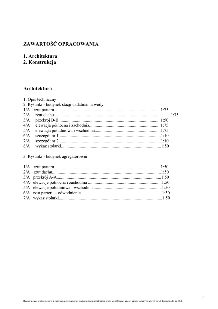 ZAWARTOŚĆ OPRACOWANIA 1. Architektura 2. Konstrukcja Architektura 1. Opis techniczny 2. Rysunki - budynek stacji uzdatniania wody 1/A rzut parteru.................................................................................................1:75 2/A rzut dachu............................................................................................... ..1:75 3/A przekrój B-B.............................................................................................1:50 4/A elewacja północna i zachodnia.................................................................1:75 5/A elewacja południowa i wschodnia............................................................1:75 6/A szczegół nr 1.............................................................................................1:10 7/A szczegół nr 2.............................................................................................1:10 8/A wykaz stolarki...........................................................................................1:50 3. Rysunki - budynek agregatorowni 1/A 2/A 3/A 4/A 5/A 6/A 7/A rzut parteru.................................................................................................1:50 rzut dachu...................................................................................................1:50 przekrój A-A...............................................................................................1:50 elewacje północna i zachodnia ...................................................................1:50 elewacje południowa i wschodnia...............................................................1:50 rzut parteru – odwodnienie..........................................................................1:50 wykaz stolarki..............................................................................................1:50 __________________________________________________________________________________________________________ 1 Budowa sieci wodociągowej i gazowej, przebudowa i budowa stacji uzdatniania wody w północnej części gminy Pełczyce, obręb ewid. Lubiana, dz. nr 30/6 1. OPIS TECHNICZNY (budynek SUW i agregatorownia). 1. Opis ogólny a) budynek SUW składa się z następujących pomieszczeń: hala główna sterownia przedsionek WC ustęp pomieszczenie chloratora b) budynek agregatorowni składa się z następujących pomieszczeń: rozdzielni pom.agregatu 2. Dane techniczne a) budynek SUW : powierzchnia zabudowy powierzchnia uŜytkowa kubatura a) budynek agregatorowni : powierzchnia zabudowy powierzchnia uŜytkowa kubatura - 273.0 m2 - 245.4 m2 - 1502 m3 - 35.0 m2 - 26.5 m2 - 130 m3 3. Zatrudnienie i obsługa stacji uzdatniania wody (SUW). Stacja uzdatniania wody „BaŜanty” w Lubianie będzie w pełni zautomatyzowana. Z tego teŜ powodu nie przewiduje się stałego zatrudnienia, a jedynie okresową kontrolę poprawności działania poszczególnych urządzeń i automatyki. 4. Fundamenty. a) fundament budynku: ściany fundamentowe z bloczków betonowych wykonać izolację pionową ścian fundamentowych na zimno typu SUPERFLEX 10 łącząc z izolacją podłogi (do poziomu+0.35) ściany fundamentowe do poziomu cokołu od zewnątrz ocieplić płytami styropianowymi gr.10 EPS 100 038 (FS-20) na zakładkę całość zasypać Ŝwirem a) fundamenty pod urządzenia 5. Przepusty w ścianach fundamentowych. Wykonać przepusty (przejścia rur) przez ściany fundamentowe wg proj.instalacji techologicznych. Szczeliny wypełnić uszczelniaczami elastycznymi, wodoszczelnymi, odpornymi na środki chemiczne ( rozwiązania systemowe typu KERAKOLL, SOUDALL, SCHOMBURG, DEITERMANN). 6. Otwory w ścianie. W ścianach zewnętrznych wykonać otwory technologiczne wg projektu technologiczno-instalacyjnego. 7. Ściany. a) ściany zewnętrzne dwuwarstwowe gr.39.0 cm (budynek SUW) i 36.0 cm (agregatorownia) wykonać z bloczków betonu komórkowego gr. 24.0 cm na zaprawie klejowej-termicznej o wytrzymałości 5 Mpa, z ociepleniem od zewnątrz płytami styropianowymi gr.15.0 (12 cm - agregatorownia) cm EPS 70-040. Współczynnik przenikania ciepła U=0.24 W/m2K. b) ściany działowe ściany z bloczków betonu komórkowego gr. 12.0 cm na zaprawie klejowej-termicznej o wytrzymałości 5 Mpa, __________________________________________________________________________________________________________ 2 Budowa sieci wodociągowej i gazowej, przebudowa i budowa stacji uzdatniania wody w północnej części gminy Pełczyce, obręb ewid. Lubiana, dz. nr 30/6 8. NadproŜa. NadproŜa okienne i drzwiowe wykonać z belek L19. 9. Wieniec. Na obwodzie ścian zewnętrznych wykonać wieniec Ŝelbetowy W1. 10. Podłoga. Płyta Ŝelbetowa gr. 10.0 cm zbrojona siatką, izolowana folią PE gr. 0.2 mm, Podłogę na gruncie wykonać wg układu warstw jak na rysunkach. Podłogę izolować płytami styropianowymi gr.10 EPS 100 038 (FS-20) na zakładkę lub 2x5cm (z przesunięciem). z jastrychem cementowym gr. 4 cm oddzielonym od ścian taśmą dylatacyjną (paskami styropianu) gr. 2.0 cm. 11. Opaska przycokołowa. Wokół budynku wykonać opaskę z płytek chodnikowych 40x40 cm na podsypce piaskowej stabilizowanej cementem. 12. Pochylnia Przy drzwiach zamykanych bramą rolowaną wykonać pochylnię o spadku 15%, betonową na podsypce piaskowej utwardzonej pokrytą gresem antypoślizgowym. (relief) 13. Wycieraczki. Przy drzwiach zewnętrznych zastosować wycieraczkę zewnętrzną z rusztem typu ACO 60x40 cm . oraz wewnęrzną w grubości płytek. 14. Izolacje p.wilgociowe. a) Izolacja pozioma, podłoga – folia PE gr.0.2 mm, klejona na zakład, łączona z izolacją poziomą fundamentów b) Izolacja pozioma, fundamenty - papa termozgrzewalna na osnowie z tkaniny szklanej + grunder oraz termicznie płytami styropianowymi c) izolacja pionowa – ABIZOL 2R+P z przedłuŜeniem na ściany 30 cm nad teren, łączona z izol. poziomą 15. Wpusty podłogowe (odwodnienia punktowe) i odwodnienia liniowe. W posadzce zamontować 