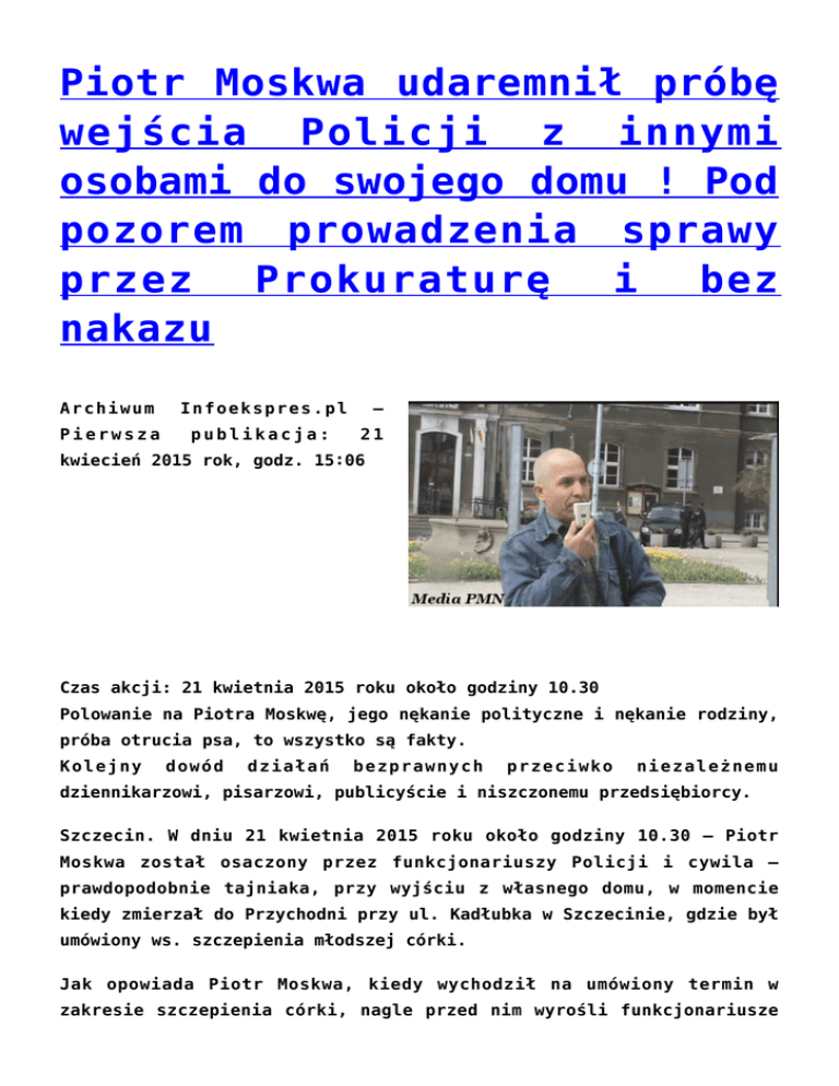 Piotr Moskwa udaremnił próbę wejścia Policji z innymi osobami do swojego domu ! Pod pozorem prowadzenia sprawy przez Prokuraturę i bez nakazu Archiwum Infoekspres.pl Pierwsza publikacja: – 21 kwiecień 2015 rok, godz. 15∶06 Czas akcji: 21 kwietnia 2015 roku około godziny 10.30 Polowanie na Piotra Moskwę, jego nękanie polityczne i nękanie rodziny, próba otrucia psa, to wszystko są fakty. Kolejny dowód działań bezprawnych przeciwko niezależnemu dziennikarzowi, pisarzowi, publicyście i niszczonemu przedsiębiorcy. Szczecin. W dniu 21 kwietnia 2015 roku około godziny 10.30 – Piotr Moskwa został osaczony przez funkcjonariuszy Policji i cywila – prawdopodobnie tajniaka, przy wyjściu z własnego domu, w momencie kiedy zmierzał do Przychodni przy ul. Kadłubka w Szczecinie, gdzie był umówiony ws. szczepienia młodszej córki. Jak opowiada Piotr Moskwa, kiedy wychodził na umówiony termin w zakresie szczepienia córki, nagle przed nim wyrośli funkcjonariusze Policji. Pytali: Czemu ucieka ? Piotr Moskwa stwierdził iż nie ucieka, bo niby dlaczego ? Biegnie po prostu, bo jest umówiony na godzinę 11.00, a zapomniał zabrać ze sobą dowodu osobistego. Piotr Moskwa zapytał się: O co chodzi ? Policjanci powiedzieli mu, że muszą wejść na jego teren i do domu. Piotr Moskwa czując podstęp – cofnął się do domu z asystą funkcjonariuszy Policji, których nagle zaczęło przybywać wokół jego wejścia do domu, jak grzybów po deszczu. Pod pozorem uwiązania trzech psów obronnych i specjalnie szkolonych – Piotr Moskwa zamknął bramę wejściową na swój teren. Wykonał kilka telefonów, po czym podszedł pod bramę i zapytał licznie zgromadzonych funkcjonariuszy umundurowanych, kilku tajniaków i dziwnych rysów pochodzenia ludzi: Dlaczego chcą wejść do jego domu ? Nie byli chętni do rozmowy, ale chcieli wejść do domu i na teren. Piotr Moskwa zadawał pytania. Wtedy jeden tajniak, bo był po cywilnemu powiedział, że nie ładnie się zachowuje, bo rozmawia przez zamkniętą bramę. Piotr Moskwa na wypowiedź nie zareagował. Piotr Moskwa jednak pytał umundurowanych funkcjonariuszy: O co chodzi ? Wtedy w końcu otrzymał odpowiedź iż muszą wejść w związku z prowadzoną sprawą przez Prokuraturę, jednak nie przeciwko niemu, ale w sprawie. Piotr Moskwa dalej się domagał informacji. W końcu otrzymał kolejną odpowiedź iż sprawa ma związek z tym, co opowiadała w Gimnazjum – jego zmanipulowana starsza córka w okresie września-października 2013-go roku. Piotr Moskwa, kiedy to usłyszał powiedział wszystkim licznie zgromadzonym, aby odeszli od jego terenu oraz domu i nie wracali bez nakazu, nadto iż takie najście na jego dom jest bezprawne. Powiedział przy tym iż nikogo do domu nie wpuści, bez świadków ze swojej strony, którzy – muszą być obecni w takim wypadku, a wszystkie czynności w jego domu muszą być nagrane kamerą. Po tym wszystkim Piotr Moskwa zaczął uwalniać wszystkie trzy psy, aby pilnowały jego terenu, nadto domu oraz jego schorowanej na kręgosłup żony. Kiedy Piotr Moskwa uwolnił psy, wtedy włączył syrenę policyjną, która zaczęła wyć niemiłosiernie na terenie jego posesji i pobliskich domów. W międzyczasie Piotr Moskwa przez megafon o mocy 700 watów – zaczął mówić iż do jego domu przeszli wysłannicy OKUPANTÓW, którzy w roku 2014-tym zabrali mu i jego żonie podstępnie dwie małoletnie córki, a dziś przyszli do jego domu, pod pozorem wydumanej sprawy – nie mającej żadnego poparcia dowodowego. Kiedy Piotr Moskwa włączał na przemian syrenę policyjną, a potem megafon – całe towarzystwo zaczęło uciekać spod domu Piotra Moskwy. Piotr Moskwa przeprowadził całą akcję jak w czasie Protestu, co widzieli i słyszeli w dużej liczbie ludzie. Zapytany przeze mnie Piotr Moskwa, co takiego jego zdaniem mogło się zdarzyć iż obserwuje się go (czytaj: ma ogon), podsłuchuje i próbowano wejść podstępem do jego domu ? – Piotr Moskwa odpowiedział: „Rzecz jest prosta. Lekceważyli mnie, a teraz się boją moich działań patriotycznych dla Polski i Polaków. Przerażeni są iż znam ich plany i udział w działaniu przeciwko Polsce i Polakom. Przerażeni są, jednak najwięcej, bo uruchomiłem wirtualne: Międzynarodowe Muzeum Zbrodni Żydów, w dniu 18 kwietnia 2015 roku. Oczywiście cały projekt to budowa takiego muzeum przez Słowian, na ich ziemi.” Adres internetowy do tego muzeum: https://twitter.com/MZbrodniZydow W związku z tym iż próbuje się w różny wyrafinowany sposób nękać, zastraszać, nadto niszczyć Piotra Moskwę i jego działalność gospodarczą, aby przestał działać dla Polski i Polaków – Piotrowi Moskwa grozi niebezpieczeństwo ze strony skrytobójców. Bandyci ci wysługują się skorumpowanymi sędziami, policjantami, prokuratorami, kolaborantami i obcymi udającymi Polaków. Piotr Moskwa odkrył iż za zabraniem jego dzieci – stoją ludzie, którzy się go panicznie boją i już wiedzą, że zajmą się nimi Prawdziwi Polacy i rozliczą, kiedy obejmą legalną władzę w Polsce . Piotr Moskwa demaskuje zbrodniarzy sądowych i wszelkiej władzy bez skrupułów, z liczną ekipą dziennikarzy, a też uczciwych funkcjonariuszy publicznych i obywateli, z pochodzenia Polaków, którzy tak jak on kochają Polskę i o nią walczą. Nadmienić potrzeba nadto, że: Piotr Moskwa już pisał w temacie swojej sprawy wiele artykułów. Wcześniej nękali go Niebieską Kartą za to, że zawiadomił Policję o przestępstwach Dyrektora przeciwko jego córce w Gimnazjum. Piotr Moskwa nadto ujawnił sprawę dewianta Dyrektora, który bezprawnie monitorował kamerami przez 24 godziny na dobę – swoich uczniów w Internacie. Przestępstwa te ukrywają ludzie, którzy są przeciwko Polakom, którzy udają Polaków, a też wrogowie, zdrajcy, spiskowcy i kolaboranci. Artykuł napisano wg relacji Piotra Moskwy, który też wyda w tej sprawie w