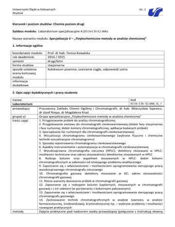 Uniwersytet Śląski w Katowicach Wydział str. 1 Kierunek i poziom studiów: Chemia poziom drugi Sylabus modułu: Laboratorium specjalizacyjne A (0310-CH-S2-006) Nazwa wariantu modułu: Specjalizacja V – „Fizykochemiczne metody w analizie chemicznej” 1. Informacje ogólne koordynator modułu rok akademicki semestr forma studiów sposób ustalania oceny końcowej modułu informacje dodatkowe Prof. dr hab. Teresa Kowalska 2014 / 2015 drugi/letni stacjonarna Kolokwium pisemne, ocenianie ciągłe, odpowiedź ustna 2. Opis zajęć dydaktycznych i pracy studenta nazwa Laboratorium prowadzący grupa(-y) treści zajęć metody kod 0310- CH- S2-006_fs_1 Pracownicy Zakładu Chemii Ogólnej i Chromatografii; dr hab. Mieczysław Sajewicz, dr Józef Rzepa, dr Magdalena Knaś Grupa specjalizacyjna „Fizykochemiczne metody w analizie chemicznej” 1. Przygotowanie próbek do analizy chromatograficznej. 2. Przygotowanie zestawu do chromatografii cienkowarstwowej (dobór fazy stacjonarnej i fazy ruchomej; dobór komory chromatograficznej, aplikacja badanych próbek) 3. Sporządzanie faz ruchomych dla chromatografii cienkowarstwowej 4. Wizualizacja chromatogramu cienkowarstwowego (wybrane fizyczne i chemiczne techniki wizualizacyjne chromatogramu) 5. Sposoby rejestrowania chromatogramu cienkowarstwowego 6. Aspekty instrumentalne i automatyzacja w chromatografii cienkowarstwowej 7. Wysokosprawna chromatografia cieczowa (HPLC); detektory stosowane w HPLC; możliwości techniczne oraz zakres stosowalności detektorów stosowanych w HPLC 8. Rodzaje kolumn oraz wypełnień stosowanych w HPLC- dobór kolumn chromatograficznych w zależności od istniejącego problemu analitycznego 9. Zapoznanie się z właściwościami i możliwościami oprogramowania sterującego pracą wysokosprawnego chromatografu cieczowego 10. Chromatografia gazowa; detektory stosowane w GC; zakres stosowalności chromatografii gazowej 11. Różne warianty dozowania próbek w chromatografii gazowej 12. Zapoznanie się z rodzajami kolumn kapilarnych, stosowanych w chromatografii gazowej i z ich zaletami (w porównaniu z kolumnami pakowanymi) 13. Zapoznanie się z właściwościami i możliwościami oprogramowania sterującego pracą chromatografu gazowego 14. Zastosowanie technik chromatograficznych w analizie żywności, w analizie farmaceutycznej, środowiskowej, kryminalistycznej itp. – wybrane problemy i możliwości rozwiązań praktycznych Zajęcia praktyczne pod nadzorem osoby prowadzącej (połączone z instrukcją słowną Uniwersytet Śląski w Katowicach Wydział prowadzenia zajęć liczba godzin dydaktycznych (kontaktowych) liczba godzin pracy własnej studenta opis pracy własnej studenta organizacja zajęć literatura obowiązkowa str. 2 oraz demonstracjami praktycznymi) 75 100 Opanowanie materiału w zakresie przewidzianym programem zajęć. Przygotowanie do ćwiczeń laboratoryjnych przez samodzielną pracę z literaturą. Ćwiczenia laboratoryjne 1. Z. Witkiewicz, “Podstawy chromatografii”, WNT, Warszawa, 2005 2. „Handbook of Thin-Layer Chromatography”, wydanie 3, praca zbiorowa pod red. J. Shermy I B. Frieda, Marcel Dekker, New York, 2003 3. L.R. Snyder, J.J. Kirkland, J.W. Dolan, ”Introduction to Modern Liquid Chromatography”, 3rd Edition, Wiley, New York, 2010 4. R.L. Grob, E.F. Barry, "Modern Practice of Gas Chromatography” (Fourth Edition), Wiley, New York, 2004 literatura uzupełniająca adres strony www zajęć informacje Od studentów wymagana jest znajomość języka angielskiego w stopniu dodatkowe zapewniającym im możliwość korzystania z literatury przedmiotu głównie w tym języku. nazwa Konsultacje prowadzący grupa(-y) treści zajęć metody prowadzenia zajęć liczba godzin dydaktycznych (kontaktowych) liczba godzin pracy własnej studenta opis pracy własnej studenta organizacja zajęć literatura kod 0310- CH- S2-006_fs_2 Pracownicy Zakładu Chemii Ogólnej i Chromatografii; dr hab. Mieczysław Sajewicz, dr Józef Rzepa, dr Magdalena Knaś Grupa specjalizacyjna „Fizykochemiczne metody w analizie chemicznej” Zakres materiału stanowiący problematyczne dla studenta zagadnienie. Konsultacje bezpośrednie mające na celu pomoc w rozwiązywaniu trudności wynikających z realizacji treści programowych modułu. 4 - - bieżących Uniwersytet Śląski w Katowicach Wydział obowiązkowa literatura uzupełniająca adres strony www zajęć informacje dodatkowe str. 3 - 3. Opis sposobów weryfikacji efektów kształcenia modułu nazwa Kolokwium pisemne kod(-y) zajęć osoba(-y) przeprowadzająca(e) weryfikację grupa(-y) wymagania merytoryczne kryteria oceny przebieg procesu weryfikacji informacje dodatkowe kod 0310- CH- S2- 006_w_1 0310- CH- S2-006_fs_1 Pracownicy Zakładu Chemii Ogólnej i Chromatografii; dr hab. Mieczysław Sajewicz, dr Józef Rzepa, dr Magdalena Knaś Grupa specjalizacyjna „Fizykochemiczne metody w analizie chemicznej” Wiedza z zakresu materiału przewidzianego programem zajęć oraz umiejętności w rozwiązywaniu zadań i problemów z zakresu przedmiotu specjalizacyjnego. Poprawność udzielonych odpowiedzi, opanowanie materiału dotyczącego technik chromatograficznych. Posługiwanie się poprawną terminologią specjalistyczną. Kryterium oceny kolokwium: 60% - 67% dst 68% - 75% +dst 76% - 83% db 84% - 91% +db 91% -100% bdb Na kolokwium pisemnym wymagana jest znajomość języka angielskiego - język specjalistyczny, terminologia stosowana w technikach chromatograficznych. nazwa kod Odpowiedź ustna 0310-CH-S1-002_w_2 kod(-y) zajęć osoba(-y) przeprowadzająca (-e) weryfikację grupa(-y) wymagania merytoryczne kryteria oceny 0310- CH- S2-006_fs_1 Pracownicy Zakładu Chemii Ogólnej i Chromatografii; dr hab. Mieczysław Sajewicz, dr Józef Rzepa, dr Magdalena Knaś Grupa specjalizacyjna „Fizykochemiczne metody w analizie chemicznej” Opanowanie wiedzy teoretycznej i praktycznych umiejętności w laboratorium specjalizacyjnym. Opanowanie treści wskazany
