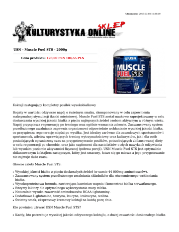 Utworzono: 2017-03-08 10:39:09 USN - Muscle Fuel STS - 2000g Cena produktu: 123,00 PLN 104,55 PLN Koktajl zastępujący kompletny posiłek wysokobiałkowy Bogaty w wartości odżywcze napój o świetnym smaku, skomponowany w celu zapewnienia maksymalnej stymulacji tkanki mięśniowej. Muscle Fuel STS został naukowo zaprojektowany w celu dostarczania wysokiej jakości białka z pięciu najlepszych źródeł osobom aktywnym w różnym wieku. Napój przyspiesza regenerację po treningu oraz ogólnie wzmacnia zdrowie. Zaawansowany system przedłużonego uwalniania zapewnia organizmowi odpowiednie wchłanianie wysokiej jakości białka, co przyspiesza regenerację mięśni po wysiłku. Jest idealny zarówno dla zawodowych sportsmenów i sportsmenek, atletów uprawiających trening wytrzymałościowy oraz kulturystów, jak i dla osób posiadających ograniczony czas na przygotowywanie posiłków, potrzebujących zbilansowanej diety w celu regeneracji po chorobie, oraz jako suplement dla nastolatków o złych nawykach odżywiania lub wysokim poziomie aktywności fizycznej (połowa porcji). USN Muscle Fuel STS jest optymalnie zbilansowanym koktajlem zastępczym, który jest smaczny, łatwo się go miesza a jego przygotowanie nie zajmuje dużo czasu. Główne zalety Muscle Fuel STS: ● ● ● ● ● ● ● Wysokiej jakości białko z pięciu doskonałych źródeł (w sumie 44 000mg aminokwasów). Zaawansowany system przedłużonego uwalniania składników dla równomiernego wchłaniania białka. Wysokoproteinowa formuła, zawierająca kazeinian wapnia i koncentrat białka serwatkowego. Enzymy laktozy dla optymalnego wykorzystania masy mleka. Naturalnie wysoka zawartość aminokwasów BCAA i glutaminy. Dodatkowo L-glutamina, tauryna, leucyna, izoleucyna, walina. Świetny smak, ekspresowy kremowy koktajl na każdą porę dnia. Kto powinien używać USN Muscle Fuel STS? ● Każdy, kto potrzebuje wysokiej jakości odżywczego koktajlu, o dużej zawartości doskonałego białka ● i węglowodanów, w celu stymulacji rozwoju tkanki mięśniowej; kulturyści, atleci oraz osoby nie uprawiające sportu, szukające alternatywy dla regularnych produktów lub pragnących się wzmocnić między posiłkami. Dzieci bardzo czynne fizycznie (od 12 roku życia), wymagające zbilansowanego suplementu posiłku w celu zoptymalizowania ich aktywności (tylko połowa porcji). Wartości odżywcze Jedna porcja: 1 kopiasta łyżka (60g) Wartość energetyczna Białko Węglowodany Tłuszcz Błonnik (razem) Sód Potas Wapń Fosfor Magnez Witamina A Witamina D Witamina E Witamina C Witamina B1 (Tiamina) Witamina B2 (Ryboflawina) Witamina B3 (Amid kwasu nikotynowego) Kwas pantotenowy Witamina B6 (Pirydoksyna) Kwas foliowy Witamina B12 (Cyanokobalamina) Biotyna Tauryna Amino-baza stymulująca tkankę mięśniową Razem BCAA Razem glutamina / kwas glutaminowy 60g + 200-250ml Na 100g Na 120g Na 60g *% Zalecane dzienne spożycie / adekwatne spożycie na 60g 1541kJ 38.5g 47.4g 2.1g 2.3g 549mg 362mg 424mg 442mg 34mg 236µgRE 1.5µg 4mgTE 22mg 0.3mg 0.4mg 1849kJ 46.2g 56.9g 2.5g 2.8g 659mg 434mg 509mg 531mg 40mg 315µgRE 1.2µg 5mgTE 26mg 0.4mg 0.5mg 925kJ 23.1g 28.5g 1.3g 1.4g 330mg 217mg 255mg 266mg 20mg 158µgRE 0.6µg 2.5mgTE 13mg 0.2mg 0.3mg 4.7mg 5.6mg 2.8mg 18% 1.5mg 0.4mg 1.8mg 0.5mg 0.9mg 0.3mg 18% 18% 117µg 0.7µg 140µg 0.8µg 70µg 0.4µg 18% 18% 9µg 83mg 14.9g 11µg 100mg 17.9g 5.5µg 50mg 8.9g 18% 18% 8.2g 9.8g 4.9g 6.8g 8.1g 4.1g 42% 22% 5% 26% 38% 5% 18% 18% 18% 18% 18% *% Zalecane dzienne spożycie lub adekwatne spożycie na porcję dla osób powyżej 13 roku życia. Składniki: Maltodekstryna, mieszanka izolatu i koncentratu białka serwatkowego, izolat białka sojowego, kazeinian wapnia, proszek kakaowy (tylko w wariancie czekoladowym), fruktoza, tłuszcze MCT (średniołańcuchowe trójglicerydy), skrobia ryżowa, aromat, białko jajka, stabilizator: guma celulozowa, fosforan potasu (I), tauryna, glutamina, leucyna, izoleucyna, walina, tlenek magnezu, nieodżywczy słodzik: sukraloza, kwas askorbinowy, amid kwasu nikotynowego, pantotenian wapnia, 5`- fosforan pirydoksyny, ryboflawina, azotan tiaminy, Zymatech™ (enzymy trawienne, zawiera laktazę), biotyna, kwas foliowy, octan alfa-tokoferolu, cholekalcyferol, barwnik: E124, proszek buraka czerwonego (tylko w wariancie truskawkowym), cyanokobalamina. Ostrzeżenia: Informacje o alergenach: zawiera białko mleka, soi i jajka. Nie zawiera orzechów, lecz jest produkowany w miejscu, w którym przetwarza się orzechy ziemne i laskowe. Z powodu obecności laktazy produkt jest odpowiedni dla osób nietolerujących laktozy. Nie należy przekraczać zalecanej dawki dziennej. Suplementy żywności nie powinny zastępować zróżnicowanej diety. Przechowywać w chłodnym, suchym miejscu, niedostępnym dla dzieci. Zalecane stosowanie: Jako suplement diety: dodaj 2 kopiaste łyżki do 400ml zimnej wody. Przez 30 sekund mieszaj w blenderze lub za pomocą ręcznego shakera. Należy przyjmować 2-3 porcje dziennie (mogą być przyjmowane w połówkach). Aby spożyć większą ilość kalorii w formie dodatkowego białka i węglowodanów, zamiast wody można użyć beztłuszczowego mleka. Adres: http://www.ko.sklep.pl/ Telefon: kom. 782 010 880 Email: [email protected]