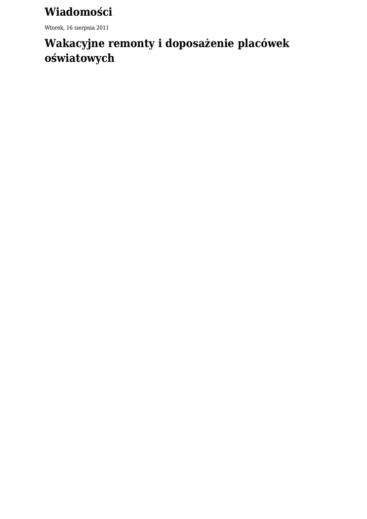 Wiadomości Wtorek, 16 sierpnia 2011 Wakacyjne remonty i doposażenie placówek oświatowych Okres wakacji to dla naszych milusińskich czas wypoczynku, poznawania nowych miejsc i zawierania przyjaźni. Jest to także czas wytężonej pracy związanej z przygotowaniem placówek oświatowych na nowy rok szkolny. W tym okresie przeprowadzane są następujące prace remontowe i inwestycyjne: - PS Brzezinka – malowanie pomieszczeń przedszkola na kwotę 5.035,12 zł, - PS Grojec – malowanie sal zajęć w przedszkolu na kwotę 3.874,00 zł, - PS Rajsko – malowanie pomieszczeń przedszkola na kwotę 7.430,00 zł, - PS Poręba W. - cyklinowanie parkietu w salach zajęć, jadalni, kancelarii i na klatce schodowej na kwotę 8.859,69 zł, PS Włosienica - malowanie pomieszczeń przedszkola na kwotę 5.839,76 zł, - SP Babice – remont instalacji odgromowej na budynku na kwotę 9.843,92 zł, remont schodów wejściowych do szkoły oraz wejścia do zaplecza kuchni wyjścia ewakuacyjnego z sali gimnastycznej , wymiana rynien na budynku szkoły od strony frontowej oraz na sali gimnastycznej od strony boiska, wykonanie bramki wejściowej od strony ul. Różanej oraz barierki stalowej zabezpieczającej przed bezpośrednim wyjściem na ulicę i wyłożenie chodnika wokół bramki - łączny koszt robót na kwotę 37.964,21 zł , SP Brzezinka - malowanie sali lekcyjnej dla oddziału „O”– 3.489,99 zł , SP Rajsko – wykonanie bramy wjazdowej do szkoły na kwotę 13.320,90 zł SP Poręba W. – remont i konserwacja 75 m2 parkietu ( 2 klasy) w szkole na kwotę 5.940,00 zł, wykonanie aktualizacji projektu elewacji szkoły podstawowej na kwotę 23.370,00 zł , SP Włosienica – modernizacja i doszczelnienie odstojnika bezodpływowego przy szkole na kwotę – 53.340,18 zł , GG Zaborze – remont stropów nad parterem holu głównego wejścia do budynku na kwotę 20.240,70 zł , - - ZEASIPG - adaptacja nowej siedziby Zespołu na II piętrze w Rajsku w ramach prac adaptacyjnych wykonanie instalacji elektrycznej wewnętrznej wraz z wymianą lamp, instalacji alarmowej, informatycznej i telefonicznej na kwotę 24.901,19 zł, wymiana stolarki okiennej i drzwiowej, wykonanie ścianek działowych, wymian posadzek podłogowych założenie wykładzin biurowych , położenie płytek na korytarzu, węźle sanitarnym i pomieszczeniu socjalnym, wymiana grzejników c.o. , przebudowa sanitariatów wraz z wymianą instalacji wod. kan., malowanie wszystkich pomieszczeń - na łączną kwotę – 86.666,40 zł - Doposażono placówki w niezbędny sprzęt i meble: - SP Brzezinka - zakupiono stoliki i krzesełka do nowego oddziału „O” – 4.858,48 zł, - SP Rajsko – zakup 2 szt. biurek oraz segmentów szkolnych do sal lekcyjnych na kwotę 2.739,97 zł PS Rajsko – zakup bojlera na wodę na kwotę 2.100,00 zł oraz zakup szafy na kwotę 1.850,01 zł, Część prac remontowo-budowlanych będzie realizowana w okresie wrzesień - październik po uzyskaniu odpowiednich pozwoleń oraz przygotowaniu dokumentacji technicznej tj.: - PS Rajsko – wykonanie zadaszenia wejścia do przedszkola, PS Zaborze - zadaszenie balkonu przedszkola, PS Włosienica – remont ściany i obróbek blacharskich budynku w wyniku odmrożenia, SP Babice – wykonanie projektu zmiany konstrukcji zadaszenia budynku szkoły, SP Brzezinka – wymiana ogrodzenia przy szkole od strony ulicy Dworskiej, SP Grojec – wymiana 12 szt okien w salach lekcyjnych, ZSP Harmęże – zakup pieca c.o. olejowego do szkoły wraz z remontem kotłowni , remont posadzki PCV w sali lekcyjnej, GG Rajsko – wykonanie izolacji pionowej przeciwwilgociowej, ocieplenie przyziemi budynku szkoły W trakcie rozeznania cenowego jest również część zakupów w ramach doposażenia placówek tj.: - PS Grojec – zakup karuzeli na plac zabaw, - PS Poręba W. – zakup stolików i krzesełek dla dzieci oraz zakup zmywarko-wyparzarki PS Zaborze - zakup nowej szatni dla dzieci oraz 4 stoliki i 8 szt. krzesełek oraz zakup ksero do przedszkola, - SP Brzezinka - zakup nowego trzonu kuchennego, - SP Poręba W. – zakup ksero do szkoły, - GG Zaborze - doposażenie salki fitnes w sprzęt - Ponadto placówki cały czas uatrakcyjniają bazę edukacyjną poprzez zakup nowych pomocy dydaktycznych. Wszystkie te działania mają na celu podniesienie jakości nauczania oraz dostosowanie naszych placówek do obowiązujących norm bezpieczeństwa.