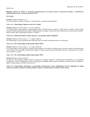 Białystok, dn. 03.02.2015r. ZP/II/15/30 Dotyczy: zapytań do SIWZ w przetargu nieograniczonym na dostawę leków Vecuronium bromide i Ciprofloxacin hydrochloride na okres 3 miesięcy (sprawa 9/2015) PYTANIA: Pytanie 1 (dotyczy Pakietu nr 1): Czy Zamawiający wymaga w pakiecie 1 Ciprofloxaciny w postaci monowodzianu?. Odpowiedź: Zamawiający dopuszcza, ale nie wymaga. Pytanie 2 (dotyczy Wzoru umowy – § 3 ust. 1 punkt c): Czy Zamawiający wyrazi zgodę na wprowadzenie zmian w dotychczasowym zapisie: " jeżeli dostawa wypada w dniu wolnym od pracy lub poza godzinami pracy apteki szpitalnej dostawa nastąpi w pierwszym dniu roboczym po wyznaczonym terminie", ujmie również zapis wykluczający dostawy w soboty? Odpowiedź: Sobota jest dniem wolnym od pracy w przypadku Apteki Szpitalnej. Pytanie 3 (dotyczy Wzoru umowy – § 7 ustęp 1 punkt a): Czy Zamawiający wyrazi zgodę aby kara naliczana była od wartości niedostarczonej na czas dostawy? Odpowiedź: Nie, Zamawiający podtrzymuje zapisy SIWZ. Pytanie 4 (dotyczy Wzoru umowy – § 1 ustęp 1 punkt d): Czy Zamawiający wyrazi zgodę na wskazanie jako podstawy do ustalenia wysokości kary umownej wartość niezrealizowanej części umowy? W przypadku zrealizowania zgodnie z umową znacznej części przedmiotu umowy, naliczanie kar od całości jest wyraźnie zawyżona. Odpowiedź: Nie, Zamawiający podtrzymuje zapisy SIWZ. Pytanie 5 (dotyczy Wzoru umowy): W oparciu o obowiązujące przepisy prawne, wracamy się z prośbą o dodanie w zapisach umowy informacji, iż w przypadku konieczności zwrotu zakupionego towaru, Zamawiający udostępni kopię rejestru warunków przechowywania produktu w aptece, od dnia dostawy do dnia zwrotu towaru. Odpowiedź: Zamawiający informuje, iż przypadku konieczności zwrotu zakupionego towaru, udostępni on kopię rejestru warunków przechowywania produktu w aptece, od dnia dostawy do dnia zwrotu towaru.
