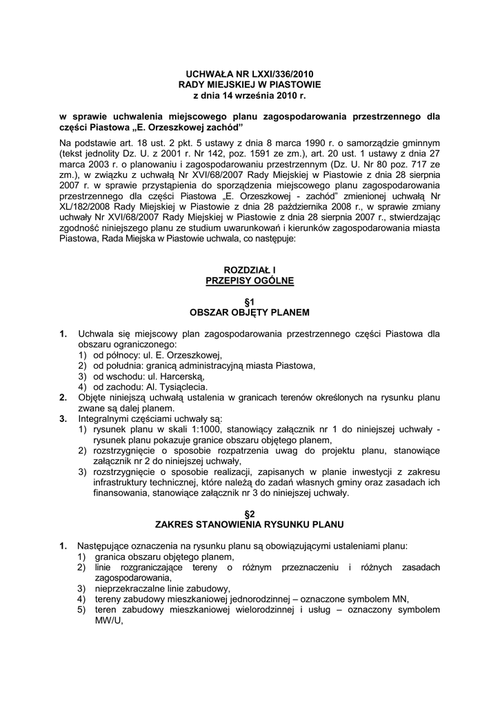 UCHWAŁA NR LXXI/336/2010 RADY MIEJSKIEJ W PIASTOWIE z dnia 14 września 2010 r. w sprawie uchwalenia miejscowego planu zagospodarowania przestrzennego dla części Piastowa „E. Orzeszkowej zachód” Na podstawie art. 18 ust. 2 pkt. 5 ustawy z dnia 8 marca 1990 r. o samorządzie gminnym (tekst jednolity Dz. U. z 2001 r. Nr 142, poz. 1591 ze zm.), art. 20 ust. 1 ustawy z dnia 27 marca 2003 r. o planowaniu i zagospodarowaniu przestrzennym (Dz. U. Nr 80 poz. 717 ze zm.), w związku z uchwałą Nr XVI/68/2007 Rady Miejskiej w Piastowie z dnia 28 sierpnia 2007 r. w sprawie przystąpienia do sporządzenia miejscowego planu zagospodarowania przestrzennego dla części Piastowa „E. Orzeszkowej - zachód” zmienionej uchwałą Nr XL/182/2008 Rady Miejskiej w Piastowie z dnia 28 października 2008 r., w sprawie zmiany uchwały Nr XVI/68/2007 Rady Miejskiej w Piastowie z dnia 28 sierpnia 2007 r., stwierdzając zgodność niniejszego planu ze studium uwarunkowań i kierunków zagospodarowania miasta Piastowa, Rada Miejska w Piastowie uchwala, co następuje: ROZDZIAŁ I PRZEPISY OGÓLNE §1 OBSZAR OBJĘTY PLANEM 1. 2. 3. Uchwala się miejscowy plan zagospodarowania przestrzennego części Piastowa dla obszaru ograniczonego: 1) od północy: ul. E. Orzeszkowej, 2) od południa: granicą administracyjną miasta Piastowa, 3) od wschodu: ul. Harcerską, 4) od zachodu: Al. Tysiąclecia. Objęte niniejszą uchwałą ustalenia w granicach terenów określonych na rysunku planu zwane są dalej planem. Integralnymi częściami uchwały są: 1) rysunek planu w skali 1:1000, stanowiący załącznik nr 1 do niniejszej uchwały rysunek planu pokazuje granice obszaru objętego planem, 2) rozstrzygnięcie o sposobie rozpatrzenia uwag do projektu planu, stanowiące załącznik nr 2 do niniejszej uchwały, 3) rozstrzygnięcie o sposobie realizacji, zapisanych w planie inwestycji z zakresu infrastruktury technicznej, które należą do zadań własnych gminy oraz zasadach ich finansowania, stanowiące załącznik nr 3 do niniejszej uchwały. §2 ZAKRES STANOWIENIA RYSUNKU PLANU 1. Następujące oznaczenia na rysunku planu są obowiązującymi ustaleniami planu: 1) granica obszaru objętego planem, 2) linie rozgraniczające tereny o różnym przeznaczeniu i różnych zasadach zagospodarowania, 3) nieprzekraczalne linie zabudowy, 4) tereny zabudowy mieszkaniowej jednorodzinnej – oznaczone symbolem MN, 5) teren zabudowy mieszkaniowej wielorodzinnej i usług – oznaczony symbolem MW/U, 2 teren usług i rozmieszczenia obiektów handlowych o powierzchni sprzedaży powyżej 2000 m2 – oznaczony symbolem U/UC, 7) tereny zieleni izolacyjnej – oznaczone symbolami ZI 8) teren dróg publicznych – ulica zbiorcza – oznaczony symbolem KDZ, 9) tereny dróg publicznych – ulice lokalne – oznaczone symbolami KDL, 10) tereny dróg publicznych – ulice dojazdowe – oznaczone symbolami KDD, 11) tereny dróg wewnętrznych – oznaczone symbolami KDW, 12) strefy zieleni izolacyjnej w liniach rozgraniczających dróg publicznych, 13) wymiary terenów komunikacji w liniach rozgraniczających, 14) odległości nieprzekraczalnych linii zabudowy od linii rozgraniczających tereny, Następujące oznaczenia na rysunku planu są elementami informacyjnymi planu (nie podlegają uchwaleniu): 1) granica administracyjna z miastem Pruszkowem, 2) orientacyjny zasięg uciążliwego oddziaływania głównych ulic, 3) orientacyjny zasięg uciążliwego oddziaływania hałasem obiektu handlowego wielkopowierzchniowego. Ponadto charakter informacyjny mają symbole i oznaczenia geodezyjne zawarte na mapie sytuacyjno – wysokościowej, na której wykonany został rysunek planu. 6) 2. 3. §3 WYJAŚNIENIE POJĘĆ ZAWARTYCH W TEKŚCIE UCHWAŁY Ilekroć w uchwale jest mowa o: 1) przeznaczeniu podstawowym – należy przez to rozumieć takie przeznaczenie, które powinno przeważać na danym terenie, wyznaczonym liniami rozgraniczającymi, 2) przeznaczeniu dopuszczonym – należy przez to rozumieć rodzaje przeznaczenia inne niż podstawowe, które uzupełniają przeznaczenie podstawowe, na warunkach określonych ustaleniami szczegółowymi, 3) usługach – należy przez to rozumieć samodzielne obiekty budowlane lub pomieszczenia w budynkach o innych funkcjach niż usługowe i urządzenia służące działalności, której celem jest zaspakajanie potrzeb ludności, a nie wytwarzającej bezpośrednio metodami przemysłowymi, dóbr materialnych. Usługi mogą występować jako: a) nieuciążliwe – to jest usługi o charakterze bytowym, których uciążliwość nie wykracza poza granice działki i nie będące przedsięwzięciami mogącymi zawsze znacząco oddziaływać na środowisko, wymienionymi w obowiązujących przepisach prawa oraz nie zaliczane w myśl obowiązujących przepisów do inwestycji mogących potencjalnie znacząco oddziaływać na środowisko – pod warunkiem, że nie powodują wzrostu poziomu hałasu oraz zanieczyszczeń pyłowych i gazowych (w tym odorów) poza terenem, do którego prowadzący usługi ma tytuł prawny – prowadzenie usług nieuciążliwych nie może powodować wprowadzenia ruchu transportu ciężkiego, b) o ograniczonej uciążliwości – to jest nie spełniające wyżej wymienionych wymogów lub mogące potencjalnie znacząco oddziaływać na środowisko, to znaczy będące przedsięwzięciami dla których obowiązek wykonania raportu o oddziaływaniu na środowisko może być wymagany, zgodnie z obowiązującymi przepisami prawa – pod warunkiem ograniczenia uciążliwości do granic działki budowlanej, c) uciążliwe – to jest mogące zawsze znacząco oddziaływać na środowisko lub mogące potencjalnie znacząco oddziaływać na środowisko, będące przedsięwzięciami, dla których obowiązek wykonania raportu o oddziaływaniu na środowisko jest wymagany, zgodnie z obowiązującymi przepisami prawa, 4) liniach rozgraniczających tereny o różnym przeznaczeniu i różnych zasadach zagospoda