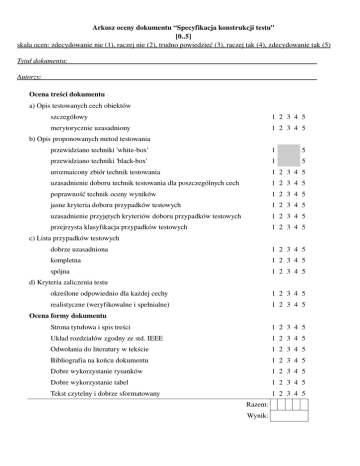 Arkusz oceny dokumentu “Specyfikacja konstrukcji testu” [0..5] skala ocen: zdecydowanie nie (1), raczej nie (2), trudno powiedzieć (3), raczej tak (4), zdecydowanie tak (5) Tytuł dokumentu: Autorzy: Ocena treści dokumentu a) Opis testowanych cech obiektów szczegółowy 1 2 3 4 5 merytorycznie uzasadniony 1 2 3 4 5 b) Opis proponowanych metod testowania przewidziano techniki 'whitebox' 1 5 przewidziano techniki 'blackbox' 1 5 urozmaicony zbiór technik testowania 1 2 3 4 5 uzasadnienie doboru technik testowania dla poszczególnych cech 1 2 3 4 5 poprawność technik oceny wyników 1 2 3 4 5 jasne kryteria doboru przypadków testowych 1 2 3 4 5 uzasadnienie przyjętych kryteriów doboru przypadków testowych 1 2 3 4 5 przejrzysta klasyfikacja przypadków testowych 1 2 3 4 5 c) Lista przypadków testowych dobrze uzasadniona 1 2 3 4 5 kompletna 1 2 3 4 5 spójna 1 2 3 4 5 d) Kryteria zaliczenia testu określone odpowiednio dla każdej cechy 1 2 3 4 5 realistyczne (weryfikowalne i spełnialne) 1 2 3 4 5 Ocena formy dokumentu Strona tytułowa i spis treści 1 2 3 4 5 Układ rozdziałów zgodny ze std. IEEE 1 2 3 4 5 Odwołania do literatury w tekście 1 2 3 4 5 Bibliografia na końcu dokumentu 1 2 3 4 5 Dobre wykorzystanie rysunków 1 2 3 4 5 Dobre wykorzystanie tabel 1 2 3 4 5 Tekst czytelny i dobrze sformatowany 1 2 3 4 5 Razem: Wynik: