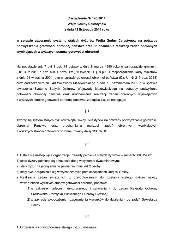 Zarządzenie Nr 143/2014 Wójta Gminy Celestynów z dnia 12 listopada 2014 roku w sprawie utworzenia systemu stałych dyżurów Wójta Gminy Celestynów na potrzeby podwyższania gotowości obronnej państwa oraz uruchamiania realizacji zadań obronnych wynikających z wyższych stanów gotowości obronnej Na podstawie art. 7 pkt 1 ust. 14 ustawy z dnia 8 marca 1990 roku o samorządzie gminnym (Dz. U. z 2013 r. poz. 594 z późn. zm.) w związku z § 8 pkt. 1 rozporządzenia Rady Ministrów z dnia 21 września 2004 roku w sprawie gotowości obronnej państwa (Dz. U. Nr 219 poz. 2218) oraz Zarządzeniem Nr 340 Wojewody Mazowieckiego z dnia 13 października 2009 r. w sprawie utworzenia Systemu Stałych Dyżurów Wojewody Mazowieckiego na potrzeby podwyżenia gotowości obronnej państwa oraz uruchamiania realizacji zadań obronnych wynikających z wyższych stanów gotowości obronnej państwa, zarządza się, co następuje: §1 Tworzy się system stałych dyżurów Wójta Gminy Celestynów na potrzeby podwyższania gotowości obronnej Państwa oraz uruchamiania realizacji zadań obronnych wynikających z wyższych stanów gotowości obronnej, zwany dalej SSD WGC. §2 1. Ustala się następującą organizację i zasady pełnienia stałych dyżurów w ramach SSD WGC: 1) stałe dyżury pełnione są przez całą dobę w systemie dwuzmianowym; 2) stały dyżur na jedną zmianę pełnią nie mniej niż 2 osoby; 3) stały dyżur organizuje się w wyznaczonych pomieszczeniach Urzędu Gminy. 2. Realizacja zadań związanych z przygotowaniem do działania stałego dyżuru należy w warunkach wyższych stanów gotowości obronnej państwa: 1) w zakresie nadzoru merytorycznego i szkolenia - do zadań Referatu Ochrony Środowiska, Porządku Publicznego i Obrony Cywilnej; 2) w zakresie wyposażenia i zapewnienia warunków do działania - do zadań Sekretarza Gminy. §3 1. Organizacja i przygotowanie stałego dyżuru obejmuje: 1) W zakresie nadzoru merytorycznego i szkolenia: a) określenie ogniw SSD WGC, składu osobowego, podległości, miejsca pełnienia, zadań oraz współpraca z osobą odpowiedzialną za przygotowanie i funkcjonowanie stałego dyżuru; b) opracowanie wykazu osób upoważnionych do uruchomienia stałego dyżuru po godzinach pracy – z ich danymi teleadresowymi; c) ustalenie zasad i trybu obiegu informacji dotyczących gotowości organu do podjęcia i realizacji zadań oraz zorganizowanie systemu powiadamiania; d) opracowanie i uzgodnienie z Wójtem Gminy Celestynów dokumentacji związanej z zapewnieniem warunków do funkcjonowania stałego dyżuru, Instrukcji stałego dyżuru, stanowiącego załącznik do niniejszego zarządzenia; e) ustalenia zasad i trybu obiegu informacji w ramach stałego dyżuru; f) szkolenie teoretyczne i praktyczne składu osobowego stałego dyżuru w ramach szkolenia obronnego (przyjnajmniej raz w roku); 2) W zakresie wyposażenia i zapewnienia warunków do działania: a) wyznaczenie, przygotowanie i utrzymanie właściwego stanu technicznego pomieszczeń do pracy oraz pomieszczeń socjalnych na potrzeby stałego dyżuru w stanie stałej gotowości obronnej państwa; b) wyposażenie wyznaczonego pomieszczenia w niezbędne środki łączności, środki informatyczne oraz środki biurowe; c) wyposażenie w zapasowe źródła energii; d) wyznaczenie dyżurnych środków transportowych dla potrzeb stałego dyżuru; e) zorganizowanie żywienia i zaopatrywania w artykuły codziennego użytku. §4 1. Stały dyżur może być uruchamiany w stanie stałej gotowości obronnej państwa w pełnym lub ograniczonym zakresie, na polecenie organu organizującego stały dyżur lub jego organu nadrzędnego w celach szkoleniowo i kontrolno-sprawdzających. 2. W wyższych stanach gotowości obronnej państwa stały dyżur uruchamiany jest obligatoryjnie, zgodnie z harmonogramem osiągania wyższych stanów gotowości obronnej. 3. O uruchomieniu stałego dyżuru organ zarządzający informuje właściwy organ nadrzędny SSD WGC, podając pełne uzasadnienie podjętej decyzji. 4. W ramach SSD WGC utrzymywana jest pełna gotowość do pracy w radiowej sieci zarządzania Wojewody Mazowieckiego, sprawne powiadamianie kadry kierowniczej i wyznaczonych pracowników stanowiących obsadę stałego dyżuru. §5 Traci moc Zarządzenie Nr 87/2007 Wójta Gminy Celestynów z dnia 23 października 2007 roku w sprawie wprowadzenie stałego dyżuru w Urzędzie Gminy Celestynów na czas wojny i sytuacji kryzysowych. §6 Zarządzenie wchodzi w życie z dniem podpisania. Wójt Gminy Celestynów Stefan Traczyk Załącznik do zarządzenia nr 143 z dnia 12 listopada 2014 r. Urząd Gminy w Celestynowie Referat Ochrony Środowiska, Porządku Publicznego i Obrony Cywilnej ZAT W I E R D ZAM Wójt Gminy Celestynów …………………………..……………… Dnia ….. ….. 2014 r. Instrukcja stałego dyżuru Wójta Gminy Celestynów Celestynów, październik 2014 Spis treści I. ZASADY OGÓLNE …………………………………………………………….….. - 3 1. Cel organizacji stałego dyżuru …………………………………………..….…… - 3 2. Zadania realizowane w ramach stałego dyżuru ………………………...…….. -3 3. Skład osobowy i czas pełnienia stałego dyżuru ………………….………….... -4 4. Miejsce pełnienia stałego dyżuru i jego podległość ………………………….. -4 5. Zasady uruchamiania stałego dyżuru ………………………………………...… - 4 6. Kontrola i nadzór nad stałym dyżurem ..……………………………………...… - 5 II. USTALENIA SZCZEGÓŁOWE ……………………………………………….…. - 5 1. Skład zmiany stałego dyżuru oraz jej oznakowanie ……...………………..… - 5 2. Uprawnienia osób pełniących stały dyżur …………………..………………….. - 6 3. Zadania osób pełniących stały dyżur………………………..……