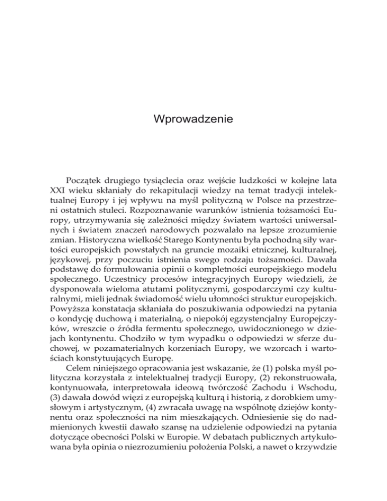 Wprowadzenie Początek drugiego tysiąclecia oraz wejście ludzkości w kolejne lata XXI wieku skłaniały do rekapitulacji wiedzy na temat tradycji intelektualnej Europy i jej wpływu na myśl polityczną w Polsce na przestrzeni ostatnich stuleci. Rozpoznawanie warunków istnienia tożsamości Europy, utrzymywania się zależności między światem wartości uniwersalnych i światem znaczeń narodowych pozwalało na lepsze zrozumienie zmian. Historyczna wielkość Starego Kontynentu była pochodną siły wartości europejskich powstałych na gruncie mozaiki etnicznej, kulturalnej, językowej, przy poczuciu istnienia swego rodzaju tożsamości. Dawała podstawę do formułowania opinii o kompletności europejskiego modelu społecznego. Uczestnicy procesów integracyjnych Europy wiedzieli, że dysponowała wieloma atutami politycznymi, gospodarczymi czy kulturalnymi, mieli jednak świadomość wielu ułomności struktur europejskich. Powyższa konstatacja skłaniała do poszukiwania odpowiedzi na pytania o kondycję duchową i materialną, o niepokój egzystencjalny Europejczyków, wreszcie o źródła fermentu społecznego, uwidocznionego w dziejach kontynentu. Chodziło w tym wypadku o odpowiedzi w sferze duchowej, w pozamaterialnych korzeniach Europy, we wzorcach i wartościach konstytuujących Europę. Celem niniejszego opracowania jest wskazanie, że (1) polska myśl polityczna korzystała z intelektualnej tradycji Europy, (2) rekonstruowała, kontynuowała, interpretowała ideową twórczość Zachodu i Wschodu, (3) dawała dowód więzi z europejską kulturą i historią, z dorobkiem umysłowym i artystycznym, (4) zwracała uwagę na wspólnotę dziejów kontynentu oraz społeczności na nim mieszkających. Odniesienie się do nadmienionych kwestii dawało szansę na udzielenie odpowiedzi na pytania dotyczące obecności Polski w Europie. W debatach publicznych artykułowana była opinia o niezrozumieniu położenia Polski, a nawet o krzywdzie 8 Wprowadzenie Polaków, gdy pojawiały się hasła „powrotu Polski do Europy”, precyzyjniej – do Europy Zachodniej. Zdaniem uczestnika dyskursu publicznego oburzenie z tego powodu ujawniało „poczucie niższości, ów, jeśli można się tak wyrazić, kompleks europejski, mania nieustannego powtarzania, że należymy do Zachodu, na którą przecie nie cierpi żaden Francuz czy Anglik, albo też, z drugiej strony, mania wyodrębniania się ze wspólnoty europejskiej, będąca […] produktem zawiedzionej miłości przy jednoczesnym obniżonym poczuciu własnej przynależności narodowej”.1 Bez wiedzy o uniwersalnych składnikach myśli politycznej nie było możliwe wartościowe poznawczo badanie jej genealogii, rozpoznawanie centralnych kategorii oraz śledzenie przejawów twórczości ideowej. Kondycję myśli politycznej można określić na podstawie oceny kontaktów wzajemnych ze światem zewnętrznym i przenikania się sfery intelektualno-kulturalnej, debat społecznych, dyskursu publicznego. W polskiej myśli politycznej uwidoczniło się falowanie świadomości zbliżania ze światem zewnętrznym (zachodnim bądź wschodnim) i oddalania się od niego. Różny był poziom intensyfikacji kontaktów myśli polskiej z jej odpowiednikami w Europie. Nieproporcjonalne pozostawały wzajemne relacje bezpośrednie i pośrednie. Dostrzegalna była niesymetryczność przepływu myśli, co wywoływało na gruncie polskim poczucie wtórności, epigoństwa, peryferyjności. Obieg myślowy odbywał się w jednym kierunku, jednosektorowo, z zewnątrz do Polski, co sprzyjało podtrzymywaniu kompleksów polskich najczęściej wiązanych z poczuciem domniemanego opóźnienia cywilizacyjnego i technicznego względem Zachodu oraz niższości intelektualnej w stosunku do Wschodu. Przekonanie o upośledzeniu Polski pod względem oddziaływania myśli ekonomicznej, kulturalnej, naukowej, technicznej miało odzwierciedlenie w powstaniu czy utrwalaniu poczucia nierówności oddziaływania w sferze myśli politycznej. Niekiedy można było zauważyć występowanie poczucia niskiej atrakcyjności myśli polskiej. Z drugiej strony ujawniało się przekonanie o niejakiej hermetyczności doświadczeń polskich w wymiarze ostatnich stuleci. Ekskluzywizm myślowy pozwalał na pokazywanie Polski jako tajemniczego, hermetycznego obiektu, mającego twórczość polityczną, której cudzoziemscy badacze nie byli w stanie zrozumieć. Bazował na przekonaniu o nieodwracalności skutków procesów społecznych i gospodarczych z czasów zaborów, wojen, okupacji. Świadomość odrębności polskiej myśli politycznej ujawniała się w związku z występowaniem kategorii swoistych, niepowtarzalnych czy 1 P. Hertz, Europeizm i literatura polska (1957), [w:] Europejskie wizje polskich pisarzy w XX wieku. Antologia, wybór i oprac. M. Urbanowski, Kraków 2011, s. 227. Wprowadzenie 9 nieznanych w innych kulturach. Wyłaniały się przesłanki do dyskursu wysublimowanego z przestrzeni europejskiej, niekiedy nawet w poczuciu wyższości względem innych Europejczyków, w duchu stwierdzenia: „my bardziej cierpieliśmy i więcej doświadczyliśmy”. Nie przeszkadzało jednak utrzymywaniu się zainteresowania modelami, ale także wyobrażeniami siebie samych, a więc Polski i Polaków w Europie, a także przestrzeni europejskich idei i wartości, europejskiej gospodarki, kultury i sztuki, szkolnictwa i nauki, europejskich instytucji. Modele te ewoluowały, wzajemnie przenikały się, absorbowały rzeczy nowe. Modele metaforyczne obecne w europejskim dyskursie politycznym pozwalały na budowę zbiorowej wyobraźni, znaków, obrazów konstytuujących Stary Kontynent. W polskiej myśli politycznej Europa, nawet ze świadomością jej dualnego charakteru w zestawieniu Zachód – Wschód, była postrzegana jako całość materialna i umysłowa, realna i abstrakcyjna, ale także identyfikowano ją z systemem etyczno-moralnym, filozoficznym, prawno-politycznym. Istniała też wi