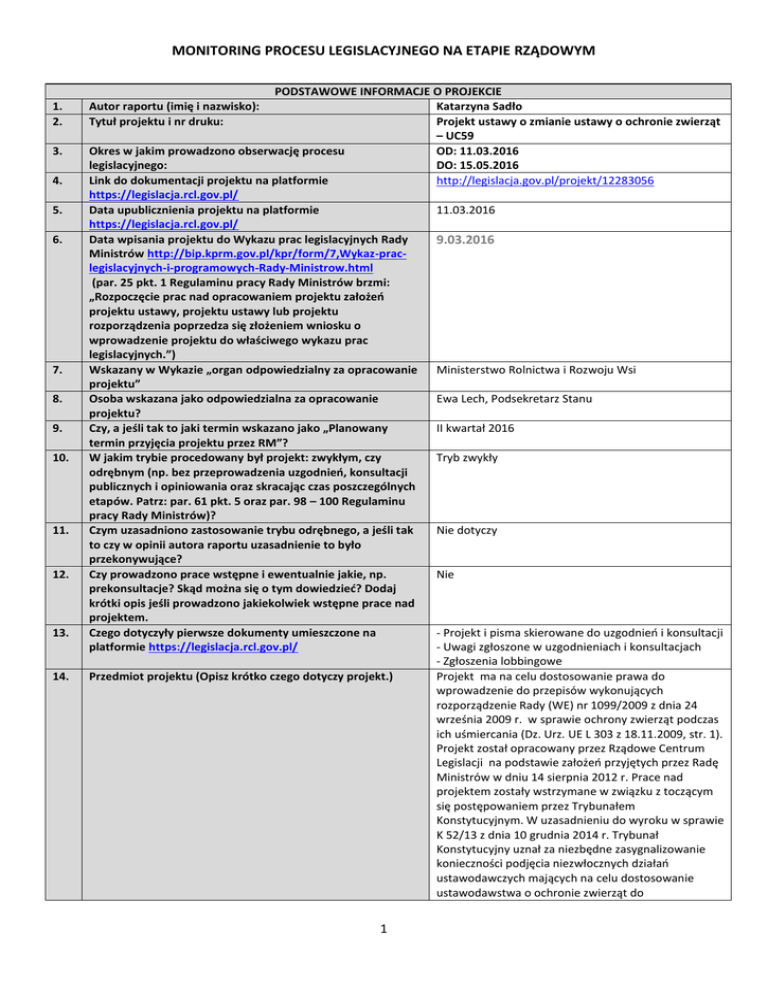 MONITORING PROCESU LEGISLACYJNEGO NA ETAPIE RZĄDOWYM 1. 2. 3. 4. 5. 6. 7. 8. 9. 10. 11. 12. 13. 14. PODSTAWOWE INFORMACJE O PROJEKCIE Katarzyna Sadło Projekt ustawy o zmianie ustawy o ochronie zwierząt – UC59 Okres w jakim prowadzono obserwację procesu OD: 11.03.2016 legislacyjnego: DO: 15.05.2016 Link do dokumentacji projektu na platformie http://legislacja.gov.pl/projekt/12283056 https://legislacja.rcl.gov.pl/ Data upublicznienia projektu na platformie 11.03.2016 https://legislacja.rcl.gov.pl/ Data wpisania projektu do Wykazu prac legislacyjnych Rady 9.03.2016 Ministrów http://bip.kprm.gov.pl/kpr/form/7,Wykaz-praclegislacyjnych-i-programowych-Rady-Ministrow.html (par. 25 pkt. 1 Regulaminu pracy Rady Ministrów brzmi: „Rozpoczęcie prac nad opracowaniem projektu założeń projektu ustawy, projektu ustawy lub projektu rozporządzenia poprzedza się złożeniem wniosku o wprowadzenie projektu do właściwego wykazu prac legislacyjnych.”) Wskazany w Wykazie „organ odpowiedzialny za opracowanie Ministerstwo Rolnictwa i Rozwoju Wsi projektu” Osoba wskazana jako odpowiedzialna za opracowanie Ewa Lech, Podsekretarz Stanu projektu? Czy, a jeśli tak to jaki termin wskazano jako „Planowany II kwartał 2016 termin przyjęcia projektu przez RM”? W jakim trybie procedowany był projekt: zwykłym, czy Tryb zwykły odrębnym (np. bez przeprowadzenia uzgodnień, konsultacji publicznych i opiniowania oraz skracając czas poszczególnych etapów. Patrz: par. 61 pkt. 5 oraz par. 98 – 100 Regulaminu pracy Rady Ministrów)? Czym uzasadniono zastosowanie trybu odrębnego, a jeśli tak Nie dotyczy to czy w opinii autora raportu uzasadnienie to było przekonywujące? Czy prowadzono prace wstępne i ewentualnie jakie, np. Nie prekonsultacje? Skąd można się o tym dowiedzieć? Dodaj krótki opis jeśli prowadzono jakiekolwiek wstępne prace nad projektem. Czego dotyczyły pierwsze dokumenty umieszczone na - Projekt i pisma skierowane do uzgodnień i konsultacji platformie https://legislacja.rcl.gov.pl/ - Uwagi zgłoszone w uzgodnieniach i konsultacjach - Zgłoszenia lobbingowe Przedmiot projektu (Opisz krótko czego dotyczy projekt.) Projekt ma na celu dostosowanie prawa do wprowadzenie do przepisów wykonujących rozporządzenie Rady (WE) nr 1099/2009 z dnia 24 września 2009 r. w sprawie ochrony zwierząt podczas ich uśmiercania (Dz. Urz. UE L 303 z 18.11.2009, str. 1). Projekt został opracowany przez Rządowe Centrum Legislacji na podstawie założeń przyjętych przez Radę Ministrów w dniu 14 sierpnia 2012 r. Prace nad projektem zostały wstrzymane w związku z toczącym się postępowaniem przez Trybunałem Konstytucyjnym. W uzasadnieniu do wyroku w sprawie K 52/13 z dnia 10 grudnia 2014 r. Trybunał Konstytucyjny uznał za niezbędne zasygnalizowanie konieczności podjęcia niezwłocznych działań ustawodawczych mających na celu dostosowanie ustawodawstwa o ochronie zwierząt do Autor raportu (imię i nazwisko): Tytuł projektu i nr druku: 1 MONITORING PROCESU LEGISLACYJNEGO NA ETAPIE RZĄDOWYM rozporządzenia nr 1099/2009. ZAŁOŻENIA PROJEKTU USTAWY NIE 15. Czy projekt ustawy poprzedzono przygotowaniem założeń? Zaznacz TAK / NIE. 16. 17. 18. 19. 20. 21. 22. 23. 24. 25. Kiedy (data) upubliczniono projekt założeń? Czy projekt założeń był napisany językiem klarownym, łatwym do przygotowania uwag przez obywateli i organizacje pozarządowe? Zaznacz TAK / NIE. Ewentualnie dodaj, krótki komentarz poniżej. Czy założenia wyczerpująco przedstawiały problem, który ma zostać poddany interwencji legislacyjnej? Zaznacz TAK / NIE. Ewentualnie dodaj, krótki komentarz poniżej. Czy w założeniach omówiono inne niż zmiana prawna możliwości osiągnięcia celu? Zaznacz TAK / NIE. Ewentualnie dodaj, krótki komentarz poniżej. Czy do projektu założeń dołączono test regulacyjny? Zaznacz TAK / NIE. Ewentualnie dodaj, krótki komentarz poniżej. Jeśli dołączono test regulacyjny to czy został on przygotowany poprawnie? Uzasadnij swoją ocenę. Zaznacz odpowiedź. Dodaj, krótki komentarz poniżej. Jeśli uważasz, ze test nie został przygotowany poprawnie, wskaż konkretne braki. Jeśli dołączono test regulacyjny to czy był on przedmiotem konsultacji wraz z projektem założeń? Zaznacz odpowiedź. Dodaj, krótki komentarz poniżej. Ile dni przeznaczono na konsultacje? Jeśli krótszy niż 14 dni czym to uzasadniono? (par. 107. pkt. 1. Wyznaczenie terminu do zajęcia stanowiska w ramach uzgodnień, konsultacji publicznych lub opiniowania krótszego niż 14 dni od udostępnienia projektu wymaga szczegółowego uzasadnienia.) Wpisz liczbę dni. Dodaj krótki komentarz. Czy projekt założeń został umieszczony do konsultacji na platformie http://konsultacje.gov.pl/ ? Zaznacz TAK / NIE. Czy i ewentualnie do kogo skierowano prośbę o przedstawienie uwag? Zaznacz odpowiedź. Dodaj, krótki komentarz Założenia zostały opracowane jeszcze w 2012 roku, ale potem prace nad ustawą zostały wstrzymane z uwagi na postępowanie przed Trybunałem Konstytucyjnym, zakończone w 2014 roku. Z uwagi na długą przerwę między założeniami a projektem, oraz fakt, że w sprawie wypowiedział się Trybunał Konstytucyjny, na użytek obserwacji procesu legislacyjnego traktuję niniejszy projekt jako nowy. Nie dotyczy Nie dotyczy Dodaj komentarz Nie dotyczy Dodaj komentarz Nie dotyczy Dodaj komentarz Nie dotyczy Dodaj komentarz Nie dotyczy Dodaj komentarz Nie dotyczy Dodaj komentarz Nie dotyczy Nie dotyczy Nie dotyczy 2 MONITORING PROCESU LEGISLACYJNEGO NA ETAPIE RZĄDOWYM 26. 27. 28. 29. 30. 31. 32. 33. 34. 35. 36. 37. 38. 39. poniżej. W szczególności opisz, czy można stwierdzić jakie były zasady doboru organizacji, którym przesłano projekt z zaproszeniem do wzięcia udziału w konsultacjach publicznych, jeśli do takowych skierowano zaproszenie. Ile podmiotów (organizacji i osób) przedstawiło uwagi do założeń? (Chodzi o liczbę pism umieszczonych na platformie 