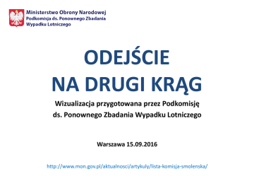 ODEJŚCIE NA DRUGI KRĄG Wizualizacja przygotowana przez Podkomisję ds. Ponownego Zbadania Wypadku Lotniczego Warszawa 15.09.2016 http://www.mon.gov.pl/aktualnosci/artykuly/lista-komisja-smolenska/ Obraz mapy satelitarnej bliższej radiolatarni oraz działki Bodina, nad którymi przelatywał TU-154 A B C Czerwonymi kółkami zaznaczono pierwsze znalezione odłamki samolotu „A” Odłamek skrzydła „A” wykopany przez ekspertów Prokuratury z CLKP w 2012 r. w odległości około 60 m przed brzozą.