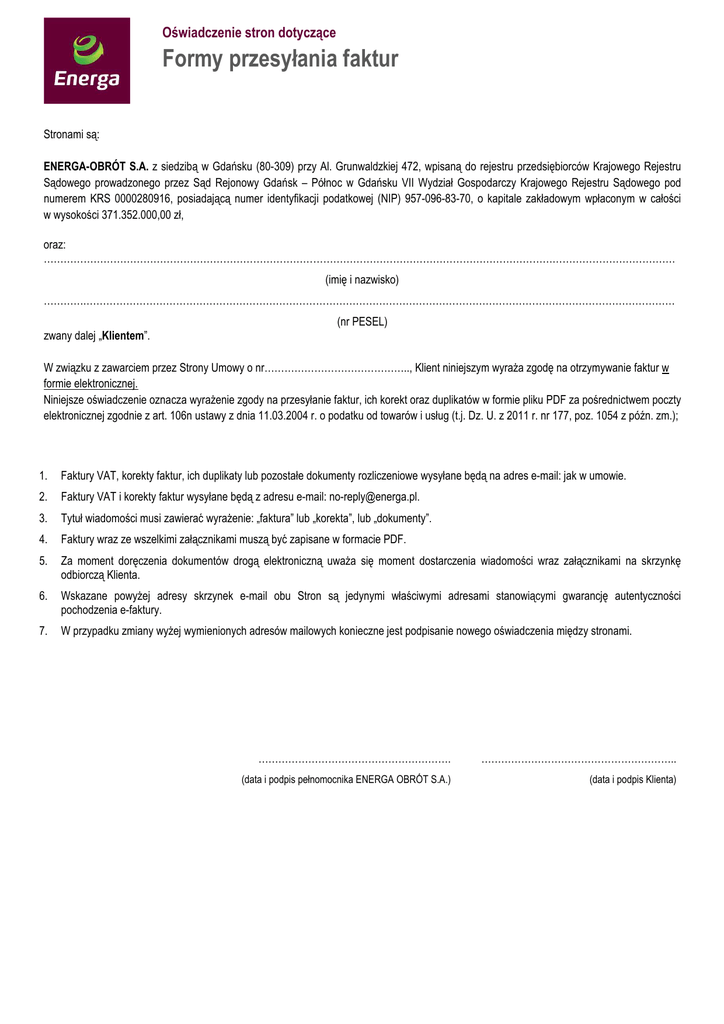Oświadczenie stron dotyczące Formy przesyłania faktur Stronami są: ENERGA-OBRÓT S.A. z siedzibą w Gdańsku (80-309) przy Al. Grunwaldzkiej 472, wpisaną do rejestru przedsiębiorców Krajowego Rejestru Sądowego prowadzonego przez Sąd Rejonowy Gdańsk – Północ w Gdańsku VII Wydział Gospodarczy Krajowego Rejestru Sądowego pod numerem KRS 0000280916, posiadającą numer identyfikacji podatkowej (NIP) 957-096-83-70, o kapitale zakładowym wpłaconym w całości w wysokości 371.352.000,00 zł, oraz: ………………………………………………………………………………………………………………………………………………………………………. (imię i nazwisko) ………….…………………………………………………………………………………………………………………………………………………………… (nr PESEL) zwany dalej „Klientem”. W związku z zawarciem przez Strony Umowy o nr…………………………………….., Klient niniejszym wyraża zgodę na otrzymywanie faktur w formie elektronicznej. Niniejsze oświadczenie oznacza wyrażenie zgody na przesyłanie faktur, ich korekt oraz duplikatów w formie pliku PDF za pośrednictwem poczty elektronicznej zgodnie z art. 106n ustawy z dnia 11.03.2004 r. o podatku od towarów i usług (t.j. Dz. U. z 2011 r. nr 177, poz. 1054 z późn. zm.); 1. Faktury VAT, korekty faktur, ich duplikaty lub pozostałe dokumenty rozliczeniowe wysyłane będą na adres e-mail: jak w umowie. 2. Faktury VAT i korekty faktur wysyłane będą z adresu e-mail: [email protected]. 3. Tytuł wiadomości musi zawierać wyrażenie: „faktura” lub „korekta”, lub „dokumenty”. 4. Faktury wraz ze wszelkimi załącznikami muszą być zapisane w formacie PDF. 5. Za moment doręczenia dokumentów drogą elektroniczną uważa się moment dostarczenia wiadomości wraz załącznikami na skrzynkę odbiorczą Klienta. 6. Wskazane powyżej adresy skrzynek e-mail obu Stron są jedynymi właściwymi adresami stanowiącymi gwarancję autentyczności pochodzenia e-faktury. 7. W przypadku zmiany wyżej wymienionych adresów mailowych konieczne jest podpisanie nowego oświadczenia między stronami. …………………………………………………. ………………………………………………….. (data i podpis pełnomocnika ENERGA OBRÓT S.A.) (data i podpis Klienta)