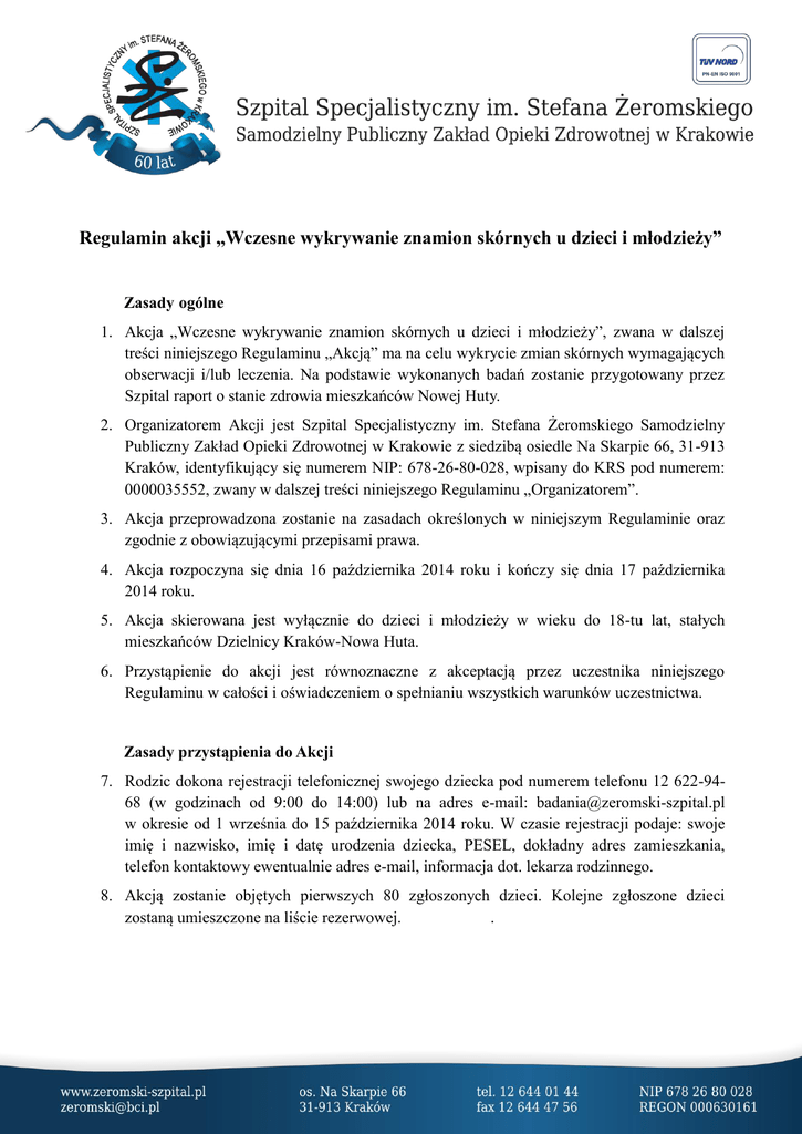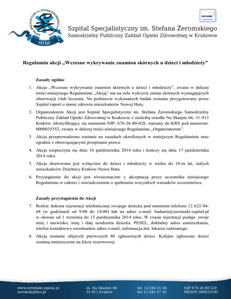 Regulamin akcji „Wczesne wykrywanie znamion skórnych u dzieci i młodzieży” Zasady ogólne 1. Akcja „Wczesne wykrywanie znamion skórnych u dzieci i młodzieży”, zwana w dalszej treści niniejszego Regulaminu „Akcją” ma na celu wykrycie zmian skórnych wymagających obserwacji i/lub leczenia. Na podstawie wykonanych badań zostanie przygotowany przez Szpital raport o stanie zdrowia mieszkańców Nowej Huty. 2. Organizatorem Akcji jest Szpital Specjalistyczny im. Stefana Żeromskiego Samodzielny Publiczny Zakład Opieki Zdrowotnej w Krakowie z siedzibą osiedle Na Skarpie 66, 31-913 Kraków, identyfikujący się numerem NIP: 678-26-80-028, wpisany do KRS pod numerem: 0000035552, zwany w dalszej treści niniejszego Regulaminu „Organizatorem”. 3. Akcja przeprowadzona zostanie na zasadach określonych w niniejszym Regulaminie oraz zgodnie z obowiązującymi przepisami prawa. 4. Akcja rozpoczyna się dnia 16 października 2014 roku i kończy się dnia 17 października 2014 roku. 5. Akcja skierowana jest wyłącznie do dzieci i młodzieży w wieku do 18-tu lat, stałych mieszkańców Dzielnicy Kraków-Nowa Huta. 6. Przystąpienie do akcji jest równoznaczne z akceptacją przez uczestnika niniejszego Regulaminu w całości i oświadczeniem o spełnianiu wszystkich warunków uczestnictwa. Zasady przystąpienia do Akcji 7. Rodzic dokona rejestracji telefonicznej swojego dziecka pod numerem telefonu 12 622-9468 (w godzinach od 9:00 do 14:00) lub na adres e-mail: [email protected] w okresie od 1 września do 15 października 2014 roku. W czasie rejestracji podaje: swoje imię i nazwisko, imię i datę urodzenia dziecka, PESEL, dokładny adres zamieszkania, telefon kontaktowy ewentualnie adres e-mail, informacja dot. lekarza rodzinnego. 8. Akcją zostanie objętych pierwszych 80 zgłoszonych dzieci. Kolejne zgłoszone dzieci zostaną umieszczone na liście rezerwowej. . Organizacja Akcji 9. Dzieci zakwalifikowane do udziału w Akcji zostaną poinformowane o terminie przeprowadzenia badania. 10. Badania będą prowadzone przez lekarzy dermatologów Dermatologicznego w dniach 16-17 października 2014 roku. na terenie Oddziału 11. Rodzic zostanie poinformowany o wynikach badania. Dzieci, które zakwalifikowane zostaną do wycięcia znamienia będą skierowane na konsultacje do Poradni Chirurgii Dzieci przy Szpitalu im. S. Żeromskiego, gdzie zostanie wyznaczony termin wycięcia przez chirurga dziecięcego.