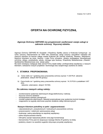 Kraków 19,11,2015 OFERTA NA OCHRONĘ FIZYCZNĄ Agencja Ochrony GEPARD ma przyjemność zaoferować swoje usługi w zakresie ochrony fizycznej obiektu. Agencja Ochrony GEPARD M. Kowalski i Wspólnicy Spółka Jawna w Krakowie funkcjonuje na rynku ochrony nieprzerwanie od 1994 roku świadcząc usługi ochrony wszystkich rodzajów dla naszych klientów na terenie całego miasta Krakowa jak również Wieliczki, Skawiny, Niepołomic. Naszymi klientami są duże, średnie i małe Firmy prywatne, obiekty podlegające obowiązkowej ochronie, sklepy, przedszkola, szkoły, różnego typu budowy, Wspólnoty Mieszkaniowe „Osiedla”, Spółdzielnie Mieszkaniowe oraz stacje paliw. Na dzień dzisiejszy następuje stały wzrost Firmy dzięki stałej i profesjonalnej współpracy z naszymi klientami, wdrażania nowych projektów i technologii oraz wzajemnego zaufania do siebie. 1. STAWKA PROPONOWANA. a) Cena netto za 1 godzinę pracy pracownika ochrony wynosi 11,50 PLN (słownie: jedenaście złotych 50/100 groszy) b) Cena brutto za 1 godzinę pracy pracownika ochrony wynosi 14,15 PLN z podatkiem VAT 23% (słownie: czternaście złotych 15/100) Do zakresu naszych usług należy: - - monitorowanie systemów alarmowych drogą telefoniczną i radiową fizyczna ochrona obiektów konwojowanie wartości pieniężnych montaż systemów alarmowych, telewizji przemysłowej oraz systemów kontroli dostępu reagowanie na sygnały alarmowe poprzez działanie załóg interwencyjnych Naszym klientom potrafimy w pełni zagwarantować: - odpowiedzialnych, przeszkolonych i kulturalnych pracowników ochrony - poszanowanie i rzetelność wykonywanej usługi - dyskrecję i pełną satysfakcję ze wspólnej współpracy - pełne bezpieczeństwo klienta - oferujemy sprzęt najwyższej jakości oraz jego konserwację - kierownictwo Firmy jest do dyspozycji naszego klienta 24 godziny na dobę - jesteśmy otwarci na wszelkie sugestie dotyczące przyszłej współpracy Pracownicy ochrony Zleceniobiorcy są: - umundurowani, posiadają przeszkolenie w zakresie BHP wyposażeni w identyfikatory ze zdjęciem, wyposażeni w środki łączności Wszystkie zespoły ochrony fizycznej znajdują się pod całodobowym Centrum Operacyjnego Naszej Agencji. nadzorem Ochrona przez załogi interwencyjne. Do realizacji zadań interwencyjnych stosujemy pojazdy dostosowane i specjalnie oznakowane. Załogi są umundurowane, uzbrojone w środki przymusu oraz wyposażone w środki łączności. Posiadamy uprawnienia SUFO (Specjalistyczne Uzbrojone Formacje Ochronne) 2. ILOŚĆ ZATRUDNIONYCH PRACOWNIKÓW I ICH KWALIFIKACJE. Ilość zatrudnionych pracowników w Agencji GEPARD zawiera się w przedziale 100-150 osób. Na stanowiska kierowników zespołów, załóg konwojowych i do załóg GSI wybierani są pracownicy o najwyższych kwalifikacjach po minimum dwuletnim, nienagannym okresie pracy w Naszej Agencji, pozostali pracownicy na mniej odpowiedzialnych stanowiskach. 3. SPOSÓB PŁATNOŚCI I ROZLICZENIA PRAC. Płatność przelewem z 14-dniowym terminem od daty otrzymania faktury. . Żywimy nadzieję, że powyższa oferta sprosta Państwa oczekiwaniom. Osoba upoważniona do kontaktów z zamawiającym: Grzegorz Paluch tel. 0663-452-222.