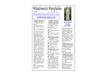Nr 109 w w w .anin.parafia.info.pl Parafia M atki Bożej K rólow ej Polski w A ninie INTENCJE MSZALNE 16 października, 29 NIEDZIELA ZWYKŁA 700 + Janina Nowacka /greg.14/ 830 + Józef, Marianna Milik, Mieczysław i Henryk 1000 + Piotr Dorabialski w 7 r.śm. 1130 + Stefania i Edward Darkowscy, cr. Darkowskich i Popielskich 1300 zbiorowa: chrzty: Mikołaj Fic, Szymon Wirtek; - dz. w 45 r. ślubu Marka i Reginy z prośbą o potrzebne łaski i opiekę Bożą na dalsze lata; - w int. nowożeńców: Patryka i Małgorzaty o Boże bł. i potrzebne łaski i dar rodzicielstwa; - dz.-bł. w int. Teresy w 80 urodziny z prośbą o dalsze łaski dla niej i cr.; - dz.-bł. w 20 r. ślubu Macieja i Anety z prośbą o bł. Boże dla cr.; o zdrowie dla Jerzego; - o szczęśliwą operację dla Elżbiety; + Jadwiga i Tadeusz Wolniccy; + Bolesława (k), Piotr, Władysław i Zdzisław; + Jadwiga i Wacław Domańscy, Małgorzata Sierewicz; 1800 – o Boże bł. dla Jadwigi, + Edward Cacko z racji imienin 17 października, poniedziałek; Św. Ignacego Antiocheńskiego, bpa i męcz., wspomnienie 700 + Helena w 19 r.śm. i Stanisław Kot 800 + Janina Nowacka /greg.15/ 1800 + Agnieszka i Łukasz Marzec 1800 – dz.bł. w int. Anny i Stefana w 2 r. ślubu oraz ich cr. 18 października, wtorek; ŚW. ŁUKASZA EWANGELISTY, święto 700 – dz.-bł. w 43 r. ślubu Bronisława i Marii Sapińskich o bł. Boże dla cr. 800 + Janina Nowacka /greg.16/ 1800 + Bogusław Jarzębowski w 7 r.śm. 19 października, środa; 700 + Janina Nowacka /greg.17/ 800 + Jan i Helena Żelazo, Zofia Kasprzak, cr. Żelazo i Rutkowskich 1800 zbiorowa: - w intencji wynagradzającej Najświętszemu Sercu Pana Jezusa za grzechy całego świata; - o intronizację Najświętszego Serca Pana Jezusa w naszych sercach, rodzinach, parafii, ojczyźnie i całym świecie; - za Krucjatę Różańcową, aby 29 Niedziela Zwykła 16.10.2011 Polska była wierna Bogu, Krzyżowi i Ewangelii wypełniając Śluby Jasnogórskie; - o zdrowie dla Małgorzaty i Stefanii i potrzebne łaski; - dz. w 1 urodziny Kamili z prośbą o bł. Boże dla niej i rodziców; + Marek Sobieraj; + Czesław Mitrus; + Jan i Helena Buczyńscy w r.śm.; 20 października, czwartek; Św. Jana Kantego, prezbitera, wspomnienie 700 + Mariusz Wicik, cr. Lechów i Wicików 800 + Janina Nowacka /greg.18/ 1800 + Ryszard, Jerzy, Aleksander i Marian 21 października, piątek; Bł. Jakuba Strzemię, biskupa, wspomnienie 700 – dz. z prośbą o dalszą opiekę dla Jacka i Tamara w 1 r. ślubu 800 + Janina Nowacka /greg.19/ 1800 zbiorowa za zmarłych: + Jan, Zofia, Jan, Stanisław, Krystyna i Stanisława (k) Brama, Liturgia Słowa Bożego Iz 45,1.4-6 Pośród narodów głoście chwałę Pana 1 Tes 1,1-5b Mt 22,15-21 Wtedy faryzeusze odeszli i naradzali się, jak by podchwycić Go w mowie. Posłali więc do Niego swych uczniów razem ze zwolennikami Heroda, aby Mu powiedzieli: Nauczycielu, wiemy, że jesteś prawdomówny i drogi Bożej w prawdzie nauczasz. Na nikim Ci też nie zależy, bo nie oglądasz się na osobę ludzką. Powiedz nam więc, jak Ci się zdaje? Czy wolno płacić podatek Cezarowi, czy nie? Jezus przejrzał ich przewrotność i rzekł: Czemu Mnie wystawiacie na próbę, obłudnicy? Pokażcie Mi monetę podatkową! Przynieśli Mu denara. On ich zapytał: Czyj jest ten obraz i napis? Odpowiedzieli: Cezara. Wówczas rzekł do nich: Oddajcie więc Cezarowi to, co należy do Cezara, a Bogu to, co należy do Boga. Ogłoszenia na 29 Niedzielę Zwykłą 16.10.2011 r. • W dniu dzisiejszym przypada 33. r. wyboru Karola Kard. Wojtyły na papieża. „Nie lękajcie się otworzyć drzwi Chrystusowi”. • W najbliższą środę wspomnienie bł. Ks. Jerzego Popiełuszki - wikariusza naszej parafii. • Wypominki. Zgłoszenia zmarłych przyjmujemy tylko w zakrystii i kancelarii. Wieczorne Msze święte - w listopadzie codziennie, w ciągu roku w każdy piątek - odprawiane są w intencjach wspominkowych. • Przez cały październik modlimy się na Różańcu. Zapraszamy na Nabożeństwa Różańcowe codziennie o godz. 17.15. • Nabożeństwo Różańcowe prowadzone przez dzieci w każdą środę października o godz. 17.15. • 22 października - w sobotę - w pierwsze liturgiczne wspomnienie bł. Jana Pawła II zostanie uroczyście poświęcony i zawieszony w kaplicy MB Częstochowskiej obraz naszego Wielkiego Rodaka. Wszystkich parafian serdecznie zapraszamy na mszę św. na godz. 18.00! • Ofiary składane na tacę za tydzień 23.10 - będą przeznaczone na potrzeby misyjne. • Przypominamy, że można już rezerwować intencje mszalne na rok 2012. • Uczniów klas III gimnazjalnych i starszą młodzież - ale tylko z naszej parafii - która pragnie przygotowywać się do przyjęcia sakr. Bierzmowania zapraszamy dziś na pierwsze spotkanie wraz z rodzicami na mszę św. o godz. 16.30 w dolnej kaplicy. • Msza św. dla dzieci, które przystąpią do Pierwszej Komunii św. i ich Rodziców będzie odprawiona w przyszłą niedzielę o godz. 16.30 w dolnej kaplicy. Zapraszamy! • Przypominamy o istnieniu blogu związanego z parafialną Salve Regina i jednocześnie zachęcamy do zapoznania się z nowym, powakacyjnym numerem naszej gazetki. Adres blogu: www.sr46.blogspot.com • Zachęcamy do włączania się do Krucjaty Różańcowej za naszą Ojczyznę - deklaracje na stoliku pod chórem. • W kiosku parafialnym są do nabycia filmy DVD o błogosławionym Janie Pawle II. XXIX Niedziela zwykła – 16.10 Zadania Cała rzeczywistość ziemska jest zadana człowiekowi do uświęcenia jej prawdą, pokojem i miłością. To dawanie świadectwa w duchu prawdy, pokoju i miłości jest służbą, do której zobowiązuje nas uczestnictwo w społeczności Chrystusa. Tylko człowiek modlący się pojmuje wielkość tej misji. Słowa św. Pawła w dzisiejszym liście do Tessaloniczan pozwalają nam lepiej poznać wewnętrzną istotę Wspólnoty wierzących, czyli Kościoła. Nie jest on zwykłym stowar