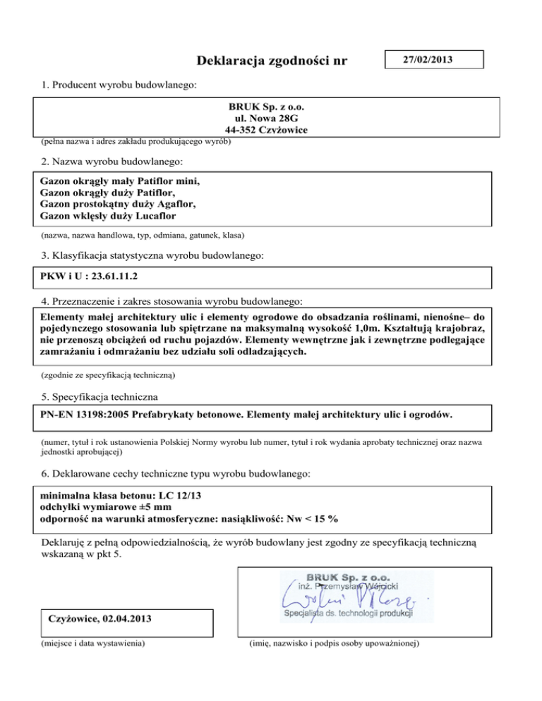 Deklaracja zgodności nr 27/02/2013 1. Producent wyrobu budowlanego: BRUK Sp. z o.o. ul. Nowa 28G 44-352 Czyżowice (pełna nazwa i adres zakładu produkującego wyrób) 2. Nazwa wyrobu budowlanego: Gazon okrągły mały Patiflor mini, Gazon okrągły duży Patiflor, Gazon prostokątny duży Agaflor, Gazon wklęsły duży Lucaflor (nazwa, nazwa handlowa, typ, odmiana, gatunek, klasa) 3. Klasyfikacja statystyczna wyrobu budowlanego: PKW i U : 23.61.11.2 ............................................................................... 4. Przeznaczenie i zakres stosowania wyrobu budowlanego: Elementy małej architektury ulic i elementy ogrodowe do obsadzania roślinami, nienośne– do pojedynczego stosowania lub spiętrzane na maksymalną wysokość 1,0m. Kształtują krajobraz, nie przenoszą obciążeń od ruchu pojazdów. Elementy wewnętrzne jak i zewnętrzne podlegające zamrażaniu i odmrażaniu bez udziału soli odladzających. (zgodnie ze specyfikacją techniczną) 5. Specyfikacja techniczna PN-EN 13198:2005 Prefabrykaty betonowe. Elementy małej architektury ulic i ogrodów. (numer, tytuł i rok ustanowienia Polskiej Normy wyrobu lub numer, tytuł i rok wydania aprobaty technicznej oraz nazwa jednostki aprobującej) 6. Deklarowane cechy techniczne typu wyrobu budowlanego: minimalna klasa betonu: LC 12/13 odchyłki wymiarowe ±5 mm odporność na warunki atmosferyczne: nasiąkliwość: Nw < 15 % Deklaruję z pełną odpowiedzialnością, że wyrób budowlany jest zgodny ze specyfikacją techniczną wskazaną w pkt 5. Czyżowice, 02.04.2013 (miejsce i data wystawienia) (imię, nazwisko i podpis osoby upoważnionej)