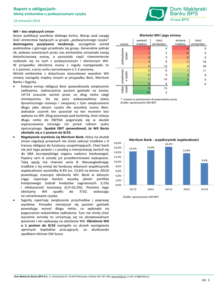 Raport o obligacjach: Mniej emitentów o podwyższonym ryzyku y, r. 19 wrzesieo 2014 Wartości WII i jego zmiany wartość indeksu podwyższone ryzyko ocena niskie umiarkowan ryzyko e ryzyko WII – bez większych zmian Sezon publikacji wyników dobiega kooca. Biorąc pod uwagę ilośd emitentów będących w grupie „podwyższonego ryzyka” dostrzegamy pozytywne tendencje, szczególnie wśród podmiotów z górnego przedziału tej grupy. Generalnie jednak ok. połowa ocenianych przez nas emitentów utrzymała swoją dotychczasową ocenę, a pozostała częśd równomiernie rozłożyła się na tych z podwyższonym i obniżonym WII. W przypadku obniżenia oceny z reguły następowało to o 1 poziom, a przy ruchu wzrostowym o 1-2 poziomy. Wśród emitentów z dotychczas stosunkowo wysokim WII zmiany nastąpiły między innymi w przypadku Best, Meritum Banku i Sygnity. Kolejna emisja obligacji Best spowodowała zwiększenie zadłużenia. Jednocześnie poziom gotówki na koniec 1H’14 znacznie wzrósł przez co dług netto uległ zmniejszeniu. Do tej pory wskazywaliśmy plany dynamicznego rozwoju i związanej z tym zwiększeniem długu jako obszar ryzyka dla wysokiej oceny Best. Jednakże czynnik ten pozostał na ten moment bez wpływu na WII. Dług pozostaje pod kontrolą, chod relacja długu netto do EBITDA pogorszyła się w skutek wypracowania niższego niż przed rokiem zysku operacyjnego. Spadek EBIT spowodował, że WII Besta obniżyło się o 1 poziom do 9/10. Negatywnie wyróżnia się Meritum Bank, który na skutek zmian regulacji prawnych nie może zaliczyd środków z II transzy obligacji do funduszy uzupełniających. Chod bank nie jest tego pewien i z prośbą o interpretację zwrócił się do EBA (europejskiego organu nadzoru bankowego). Papiery serii A zostały już przedterminowo wykupione. Taką opcję ma również seria B. Nieuwzgledniając środków z tej emisji do funduszy własnych współczynnik wypłacalności wyniósłby 9,4% (vs. 13,6% na koniec 2013) powodując znaczące obniżenie WII. Bank w dalszym ciągu raportuje bardzo wysoką jakośd portfela kredytowego (udział kredytów zagrożonych 3,1%) i efektywnośd kosztową (C/I=32,3%). Pomimo tego obniżamy WII spadło do 7/10, wskazując na umiarkowane ryzyko. Sygnity raportuje zwiększenie przychodów i poprawę wyników. Ponadto zmniejszył się poziom gotówki powodując wzrost długu netto, co wpłynęło na pogorszenie wskaźników zadłużenia. Tym nie mniej chod wyraźnie wzrosły to utrzymują się na akceptowalnym poziomie i nie wpływają na obniżenie WII. Obniżenie WII o 1 poziom do 8/10 nastąpiło na skutek wystąpienia ujemnych kapitałów pracujących, co skutkowało spadkiem Altman EM Score. ilość emitentów ilość emitentów zmiana indeksu 0 4 -4 0 1 2 -3 2 2 3 -2 2 3 8 -1 16 4 13 0 36 5 6 1 11 6 9 2 9 7 10 3 0 8 6 4 0 9 13 10 2 *- zmiana w porównaniu do poprzedniej oceny Źródło: opracowanie DM BPS Meritum Bank - współczynnik wypłacalności 18,0% 16,0% 16,4% 14,4% 14,9% 13,6% 14,0% 12,0% 9,4% 10,0% 8,0% 6,0% 4,0% 2,0% 0,0% 1H'12 2012 1H'13 2013 1H'14 Źródło: opracowanie DM BPS Dom Maklerski Banku BPS S.A., ul. Grzybowska 81, 00-844 Warszawa, Infolinia: 801 321 456, www.dmbps.pl, e-mail: [email protected] str. 1 Raport o obligacjach: Mniej emitentów o podwyższonym ryzyku y, r. 19 wrzesieo 2014 Alior Bank – jakośd portfela lekko zaciążyła na ocenie Alior Bank dynamicznie zwiększa skalę prowadzonej działalności, co pomimo środowiska niskich stóp procentowych pozwala na poprawę wyników. Nie bez znaczenia w tym kontekście jest także kontrola kosztów, co widad w stopniowym obniżaniu relacji kosztów do dochodów, która wynosi już 50,8%. Kontynuacja tych tendencji w przyszłości pozwoli na podwyższenie WII banku. Tym nie mniej wzrost skali działalności odbywa się przy jednoczesnym obniżaniu jakości portfela kredytowego. Z danych na koniec 1H’14 wynika, że udział kredytów zagrożonych w strukturze kredytów ogółem wynosi 8,8%, czyli nieco powyżej poziomu średniego dla branży. Widoczne są negatywne skutki dojrzewania portfela kredytowego w warunkach dośd dynamicznego wzrostu skali działalności. Relacja wartości kredytów zagrożonych do wielkości portfela kredytowego sprzed 12 miesięcy wynosi ponad 11%. Zmiany w ocenie jakości portfela kredytowego powodują, że WII dla banku obniżyło się o 1 pkt. do 7/10. Dostrzegamy jednak możliwośd podwyższenia tej oceny (powrotu do 8/10), gdy C/I spadnie poniżej 50%. Alior Bank - jakośd portfela kredytowego 10,0% 8,4% 9,0% 8,0% 7,0% 6,2% 6,9% 7,2% 7,2% 3Q'13 2013 8,8% 6,0% 5,0% 4,0% 3,0% 2,0% 1,0% 0,0% 1Q'13 2Q'13 1Q'14 2Q'14 Źródło: opracowanie DM BPS PGNiG – słabsze wyniki bez wpływu na WII Nieco słabsze niż przed rokiem wyniki PGNiG wynikają z wpływu zdarzeo niepieniężnych (odpisy) i nie wpływa na WII, które utrzymuje się na poziomie 9/10. Dług netto w niewielkim stopniu zwiększył się, ale w relacji do EBITDA i kapitałów własnych pozostaje na bezpiecznym poziomie, zaś koszty finansowe są znacznie przewyższane przez poziom wygenerowanych zysków z działalności operacyjnej. Kredyt Inkaso – WII stabilny Od strony wyników Kredyt Inkaso rozczarowało rynek, chod wynik EBIT był zbliżony do tego z 1Q’14. Nie ma to jednak wpływu na ocenę emitenta z punktu widzenia obligatariusza. Zwracamy natomiast uwagę na pogorszenie struktury terminowej długu w związku ze zbliżającym się terminem wykupu obligacji KRI0615, które zostały przeklasyfikowane jako zadłużenie krótkoterminowe. W efekcie negatywnie wpłynęło to na poziom Altman EM Score, chod jednocześnie nie wpłynęło to na obniżenie WII, które pozostało na dotychczasowym poziomie 7/10. Poziom zadłużenia na tle sektora wierzytelnościowego pozostaje umiarkowanie niski (dług netto/kapitały własne 1,3x). Amrest – pozytywne tendencje Pozytywna dynamika przychodów na sklepach porównywalnych, zwi