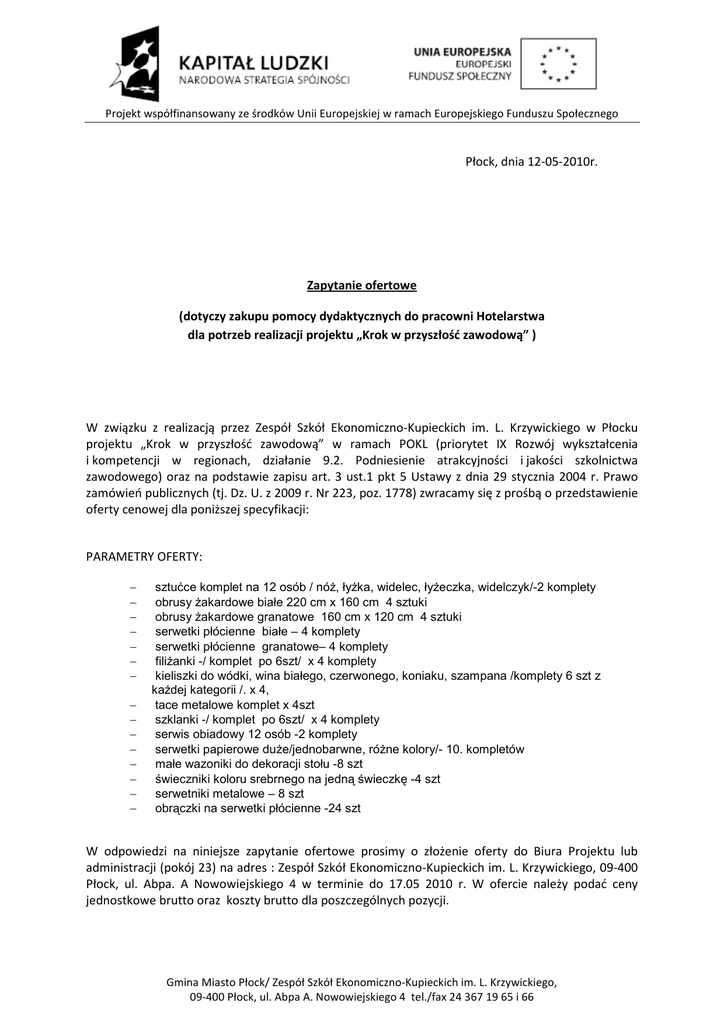 Projekt współfinansowany ze środków Unii Europejskiej w ramach Europejskiego Funduszu Społecznego Płock, dnia 12-05-2010r. Zapytanie ofertowe (dotyczy zakupu pomocy dydaktycznych do pracowni Hotelarstwa dla potrzeb realizacji projektu „Krok w przyszłość zawodową” ) W związku z realizacją przez Zespół Szkół Ekonomiczno-Kupieckich im. L. Krzywickiego w Płocku projektu „Krok w przyszłość zawodową” w ramach POKL (priorytet IX Rozwój wykształcenia i kompetencji w regionach, działanie 9.2. Podniesienie atrakcyjności i jakości szkolnictwa zawodowego) oraz na podstawie zapisu art. 3 ust.1 pkt 5 Ustawy z dnia 29 stycznia 2004 r. Prawo zamówień publicznych (tj. Dz. U. z 2009 r. Nr 223, poz. 1778) zwracamy się z prośbą o przedstawienie oferty cenowej dla poniższej specyfikacji: PARAMETRY OFERTY: − − − − − − − − − − − − − − − sztućce komplet na 12 osób / nóŜ, łyŜka, widelec, łyŜeczka, widelczyk/-2 komplety obrusy Ŝakardowe białe 220 cm x 160 cm 4 sztuki obrusy Ŝakardowe granatowe 160 cm x 120 cm 4 sztuki serwetki płócienne białe – 4 komplety serwetki płócienne granatowe– 4 komplety filiŜanki -/ komplet po 6szt/ x 4 komplety kieliszki do wódki, wina białego, czerwonego, koniaku, szampana /komplety 6 szt z kaŜdej kategorii /. x 4, tace metalowe komplet x 4szt szklanki -/ komplet po 6szt/ x 4 komplety serwis obiadowy 12 osób -2 komplety serwetki papierowe duŜe/jednobarwne, róŜne kolory/- 10. kompletów małe wazoniki do dekoracji stołu -8 szt świeczniki koloru srebrnego na jedną świeczkę -4 szt serwetniki metalowe – 8 szt obrączki na serwetki płócienne -24 szt W odpowiedzi na niniejsze zapytanie ofertowe prosimy o złożenie oferty do Biura Projektu lub administracji (pokój 23) na adres : Zespół Szkół Ekonomiczno-Kupieckich im. L. Krzywickiego, 09-400 Płock, ul. Abpa. A Nowowiejskiego 4 w terminie do 17.05 2010 r. W ofercie należy podać ceny jednostkowe brutto oraz koszty brutto dla poszczególnych pozycji. Gmina Miasto Płock/ Zespół Szkół Ekonomiczno-Kupieckich im. L. Krzywickiego, 09-400 Płock, ul. Abpa A. Nowowiejskiego 4 tel./fax 24 367 19 65 i 66 Projekt współfinansowany ze środków Unii Europejskiej w ramach Europejskiego Funduszu Społecznego Zamawiający zastrzega sobie: • • • • Prawo do swobodnego wyboru oferty Podjęcia dalszych negocjacji w celu zawarcia umowy Rezygnacji z wyboru oferty bez podania przyczyny Głównym kryterium wyboru będą parametry proponowanych towarów oraz cena Zamówienie jest współfinansowane ze środków Unii Europejskiej w ramach Europejskiego Funduszu Społecznego W sprawie oferty proszę się kontaktować z pracownikiem ds. obsługi finansowo-księgowej pod numerem tel. +48 24 3671965 w 25 e-mail: [email protected] Gmina Miasto Płock/ Zespół Szkół Ekonomiczno-Kupieckich im. L. Krzywickiego, 09-400 Płock, ul. Abpa A. Nowowiejskiego 4 tel./fax 24 367 19 65 i 66