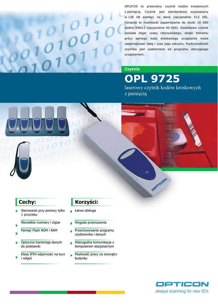 OPL9725 to z pamięcią. przenośny Czytnik jest czytnik kodów standardowo kreskowych wyposażany w 128 kB pamięci na dane (opcjonalnie 512 kB). Oznacza to możliwość zapamiętania do około 10 000 kodów EAN13 (opcjonalnie 40 000). Dodatkowo czytnik posiada zegar czasu rzeczywistego, dzięki któremu prócz samego kodu kreskowego urządzenie może zapamiętywać datę i czas jego odczytu. Funkcjonalność czytnika jest uzależniona od programu sterującego urządzeniem. Czytnik OPL 9725 laserowy czytnik kodów kreskowych z pamięcią Cechy: Korzyści: Sterowanie przy pomocy tylko 1 przycisku Łatwa obsługa Niewielkie rozmiary i ciężar Wygoda przenoszenia Pamięć Flash ROM i RAM Przechowywanie programu użytkownika i danych Optyczna transmisja danych do podstawki Wiarygodna komunikacja z komputerem stacjonarnym Klasa IP54 odporności na kurz i wilgoć Możliwość pracy na zewnątrz budynku always scanning for new ID's Specyfikacja techniczna OPL9725 – laserowy czytnik kodów kreskowych z pamięcią. Parametry optyczne Źródło światła Generowanie wiązki laserowej Szybkość odczytu Szybkość dekodowania Szerokość wiązki skanującej Dopuszczalne nachylenie kodu w osi X Dopuszczalne nachylenie kodu w osi Y Rozdzielczość dla PCS=0.9 Minimalna wartość PCS Obszar odczytu Dioda laserowa 650 nm Lustro wahadłowe 100 odczytów na sekundę 100 dekodowań na sekundę (45-320) mm – w zależności od odległości odczytu +/- 50° +/- 35° 0.15 mm 0.45 (50-450) mm – w zależności od gęstości kodu kreskowego Odczytywane kody kreskowe Chinese Post, Codebar ABC oraz CX, Code39, Code93, Code128, EAN8 z dod. +2, +5, EAN13 z dod. +2, +5, EAN128, IATA, ISBN, ISSN, Industrial 2of5, Interleaved 2of5, Italian Pharmaceutical, MSI/Plessey, UK-Plessey, UPC-A z dod. +2, +5, UPC-E z dod. +2, +5, Telepen, S-Code Parametry elektryczne Akumulator zasilający Czas pracy akumulatora zasilającego Akumulator podtrzymujący pamięć Czas pracy akumulatora podtrzymującego Sposób ładowania akumulatora Akumulator litowy 3.7V; 600mAh 40 godzin przy założeniu, że co 5 sekund będzie dokonywany odczyt kodu trwający mniej niż 1 sekunda Akumulator litowy 3.5V Co najmniej 7 dni Akumulator zasilający jest ładowany przez podstawkę komunikacyjną, akumulator podtrzymujący jest ładowany z akumulatora zasilającego Parametry funkcjonalne Pamięć Mikroprocesor Zegar czasu rzeczywistego Klawiatura Programowanie Prędkość transmisji Flash ROM: 512 kB (dla systemu operacyjnego i programu użytkownika) Podtrzymywana bateryjnie pamięć S-RAM: 128 kB (dla danych), opcjonalnie 512 kB 16 – bitowy Kwarcowy RTC, z programowaną datą i czasem i obsługą roku przestępnego (dokładność +60 sekund na miesiąc) 1 klawisz do ręcznego wyzwalania odczytu kodu Sposób pracy czytnika jest definiowany przez program użytkownika; program jest przesyłany do czytnika przy pomocy podstawki komunikacyjnej; programowanie z wykorzystaniem języka ANSI C (2400-115200) bitów na sekundę Parametry środowiskowe Dopuszczalne temperatury Dopuszczalna wilgotność Odporność na wstrząsy Dopuszczalne oświetlenie Emisja zakłóceń EM Odporność na zakłócenia EM Odporność na kurz i wilgoć Normy bezpieczeństwa Pracy: (-5 – 40)°C Przechowywanie: (-20 – 60)°C Praca: (20 – 80)% Przechowywanie: (20 – 90)% Test upadku z wysokości 1.5m na powierzchnię betonową Test wibracyjny 12-100 Hz z przyspieszeniem 2G przez 2 godziny Światło słoneczne: 50000 lux maks. Białe światło: 3000 lux maks. Ultrafiolet: 3000 lux maks. Według normy EN50081 Według normy EN50082 Według normy IEC529 - Klasa IP54 Według normy IEC825 (produkt z laserem klasy I) Parametry fizyczne Wymiary czytnika Materiał obudowy Ciężar czytnika 125x42x19 mm Plastik ABS <85 g Specyfikacja techniczna podstawki komunikacyjnej CRD972X Dostępne modele CRD9722-CHARGER – podstawka z ładowarką CRD9723-RU – podstawka komunikacyjna z ładowarką CRD9725-CABLE – podstawka komunikacyjna z ładowarką i złączem RS485 CRD9723-R&U1 – podstawka komunikacyjna z ładowarką dla 5 czytników CRD9723-R&U5 – podstawka komunikacyjna z ładowarką dla 5 czytników i możliwością jednoczesnej komunikacji z każdym urządzeniem Parametry elektryczne Napięcie zasilające Pobór prądu 6V +/-10 % <300 mA Parametry funkcjonalne Dostępne złącza komunikacyjne Tryb transmisji Parzystość RS-232 Pół – dupleks RS-232 Odd, Even, None Spełniane normy EMC EN 55022, EN 55024 Parametry fizyczne Wymiary podstawki Materiał obudowy Ciężar podstawki Standardowe złącze komunikacyjne Podstawka pojedyncza: 65x72x97 mm Podstawka dla 5 czytników: 65x310x97 mm Plastik ABS Podstawka pojedyncza: <85 g Podstawka dla 5 czytników: <335g RS-232 DB9pin LENZ Sp. z o.o. Al. Jerozolimskie 202; 02-486 Warszawa tel./fax. +48 22 863 70 06; tel. +48 22 874 03 87 E-mail: [email protected] www.lenz.pl