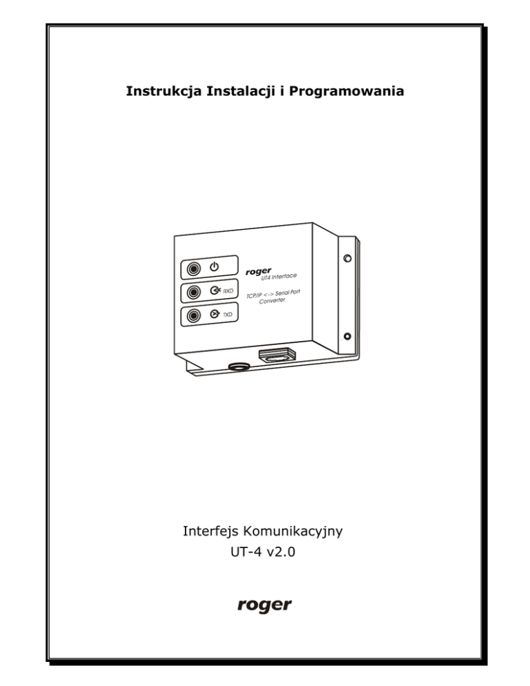 Instrukcja Instalacji i Programowania Interfejs Komunikacyjny UT-4 v2.0 UT-4 v2.0 Rev. D PL.doc 28-08-2006 _________________________________________________________________________________________ 1. Spis Treści 1. Spis Treści ............................................................................2 2. Terminy i Pojęcia ..................................................................3 3. Przeznaczenie i Budowa ........................................................3 4. Ograniczenia w Zastosowaniu Interfejsu ...............................4 5. Wykorzystanie Interfejsu w Systemie RACS...........................5 6. Instalacja .............................................................................6 6.1 Instalacja UT-4 w sieciach LAN na MS Windows XP i 2K ............7 6.2 Instalacja UT-4 poza siecią lokalną na MS Windows XP i 2K ..... 12 6.3 Instalacja UT-4 v2.0 na MS Windows 9x/ME ......................... 19 6.4 Ustawianie domyślnego trybu sterowania przepływem (Flowcontrol)........................................................................... 22 7. 6.5 Rekonfiguracja ................................................................ 24 6.6 Deinstalacja .................................................................... 25 Dodatki...............................................................................26 Uwaga: Interfejs UT-4 v2.0 jest zbudowany na bazie modułu sieciowego Digi Connect ME firmy Digi Corp. (www.digi.com). Niniejsza instrukcja opisuje sposób instalacji i wykorzystania interfejsu UT-4 jako wirtualnego portu szeregowego. Nie jest celem tej instrukcji szczegółowe opisywanie wszystkich możliwości wykorzystania modułu sieciowego Digi Connect ME. W przypadku chęci wykorzystania interfejsu do innego celu niż wirtualny port szeregowy należy skorzystać w pełnej dokumentacji modułu Digi Connect ME zamieszczonej na stronie internetowej www.digi.com lub skorzystać z dokumentacji dołączonej do produktu. Zarówno oprogramowanie jak i dokumentacja do modułu Digi Connect ME może być stosowana w odniesieniu do interfejsu UT-4. Ze względu na to, że moduł sieciowy Digi Connect ME jest nieprzerwanie ulepszany i rozwijany, zaleca się sięganie do strony internetowej producenta modułu jako źródła najbardziej aktualnych wersji oprogramowania oraz dokumentacji technicznej. ___________________________________________________________________________ Strona 2 UT-4 v2.0 Rev. D PL.doc 28-08-2006 _________________________________________________________________________________________ 2. Terminy i Pojęcia Interfejs UT-2 Interfejs komunikacyjny RS232-RS485, umożliwia komunikację pomiędzy komputerem PC i systemem kontroli dostępu RACS. Interfejs UT-4 Interfejs komunikacyjny COM-TCP, umożliwiający komunikację z urządzeniami wyposażonymi w port szeregowy za pośrednictwem sieci 100/10 BaseT Ethernet. UT-4 może pracować w standardzie: RS232, RS422 lub RS485. Interfejs RS485 Układ elektroniczny, który umożliwia odbiór i nadawanie pakietów zgodnych z standardem RS485. Standard RS485 umożliwia transmisję danych na odległości do 1200 metrów. Wszystkie kontrolery serii PR są wyposażone w interfejs tego typu. Magistrala Komunikacyjna Para przewodów, które są wykorzystywane do komunikacji pomiędzy urządzeniami wchodzącymi w skład danego systemu. W przypadku systemu RACS Magistrala Komunikacyjna jest zgodna ze standardem RS485. Reset Ustawień lub Reset Pamięci Proces polegający na skasowaniu aktualnej zawartości pamięci urządzenia i zapisaniu jej wartościami domyślnymi (fabrycznymi). 3. Przeznaczenie i Budowa Interfejs UT-4 umożliwia komunikację z urządzeniami wyposażonymi w port szeregowy za pośrednictwem sieci komputerowej. Od strony portu szeregowego UT-4 może być skonfigurowany do standardu RS232, RS422 lub RS485, od strony sieci komputerowej posiada gniazdo 100/10 BaseT Ethernet. Układ UT-4 jest identyfikowany w sieci komputerowej za pośrednictwem numeru IP który nadaje się w trakcie jego konfiguracji. Interfejs UT-4 jest zbudowany na bazie modułu sieciowego Digi Connect ME. Wszystkie programy narzędziowe dedykowane dla tego modułu mają zastosowanie w odniesieniu do interfejsu UT-4. ___________________________________________________________________________ Strona 3 UT-4 v2.0 Rev. D PL.doc 28-08-2006 _________________________________________________________________________________________ 4. Ograniczenia w Zastosowaniu Interfejsu W większości przypadków stosowanie interfejsu UT-4 z powodzeniem zastępuje używanie fizycznych portów szeregowych, niemniej w pewnych (rzadkich) sytuacjach stosowanie UT-4 może być problematyczne a nawet niemożliwe. W większości przypadków problemy w zastosowaniu UT-4 są rezultatem uwarunkowań czasowych w przesyłaniu pakietów danych za pośrednictwem sieci komputerowej, problemy te mogą się uwydatnić w szczególności wtedy, gdy komunikacja odbywa się za pośrednictwem sieci VPN. W tego typu połączeniach można spodziewać się znacznych opóźnień w przesyłaniu pakietów danych, opóźnienia te w rezultacie mogą skutecznie zakłócić komunikację pomiędzy komputerem i urządzeniem podłączonym do portu szeregowego interfejsu UT-4. W pewnych sytuacjach istnieje możliwość usunięcia problemów w działaniu wirtualnego portu szeregowego poprzez właściwe skonfigurowanie interfejsu, lecz wymaga to zarówno znajomości architektury modułu Digi jak również zagadnień związanych z funkcjonowaniem sieci komputerowych. Uwaga: Pomimo tego, że moduł Digi Connect ME na bazie, którego działa interfejs UT-4 prezentuje bardzo wysoki poziom zaawansowania technologicznego, należy mieć na uwadze, że w pewnych sytuacjach użycie UT-4 do komunikacji z oddalonym urządzeniem lub systemem może być niemożliwe. W celu uniknięcia potencjalnych problemów, zaleca się przed zakupem urządzenia przeprowadzenie testów, które praktycznie potwierdzą przydat