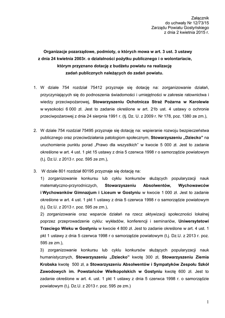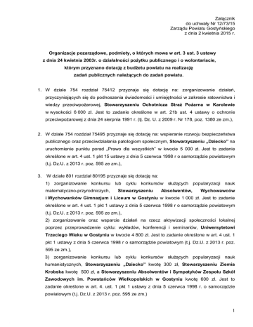 Załącznik do uchwały Nr 12/73/15 Zarządu Powiatu Gostyńskiego z dnia 2 kwietnia 2015 r. Organizacje pozarządowe, podmioty, o których mowa w art. 3 ust. 3 ustawy z dnia 24 kwietnia 2003r. o działalności pożytku publicznego i o wolontariacie, którym przyznano dotację z budżetu powiatu na realizację zadań publicznych należących do zadań powiatu. 1. W dziale 754 rozdział 75412 przyznaje się dotację na: zorganizowanie działań, przyczyniających się do podnoszenia świadomości i umiejętności w zakresie ratownictwa i wiedzy przeciwpożarowej, Stowarzyszeniu Ochotnicza Straż Pożarna w Karolewie w wysokości 6 000 zł. Jest to zadanie określone w art. 21b ust. 4 ustawy o ochronie przeciwpożarowej z dnia 24 sierpnia 1991 r. (tj. Dz. U. z 2009 r. Nr 178, poz. 1380 ze zm.), 2. W dziale 754 rozdział 75495 przyznaje się dotację na: wspieranie rozwoju bezpieczeństwa publicznego oraz przeciwdziałania patologiom społecznym, Stowarzyszeniu „Dziecko” na uruchomienie punktu porad „Prawo dla wszystkich” w kwocie 5 000 zł. Jest to zadanie określone w art. 4 ust. 1 pkt 15 ustawy z dnia 5 czerwca 1998 r o samorządzie powiatowym (t.j. Dz.U. z 2013 r. poz. 595 ze zm.), 3. W dziale 801 rozdział 80195 przyznaje się dotację na: 1) zorganizowanie konkursu lub cyklu konkursów służących popularyzacji nauk matematyczno-przyrodniczych, Stowarzyszeniu Absolwentów, Wychowawców i Wychowanków Gimnazjum i Liceum w Gostyniu w kwocie 1 000 zł. Jest to zadanie określone w art. 4 ust. 1 pkt 1 ustawy z dnia 5 czerwca 1998 r o samorządzie powiatowym (t.j. Dz.U. z 2013 r. poz. 595 ze zm.), 2) zorganizowanie oraz wsparcie działań na rzecz aktywizacji społeczności lokalnej poprzez przeprowadzenie cyklu: wykładów, konferencji i seminariów, Uniwersytetowi Trzeciego Wieku w Gostyniu w kwocie 4 800 zł. Jest to zadanie określone w art. 4 ust. 1 pkt 1 ustawy z dnia 5 czerwca 1998 r o samorządzie powiatowym (t.j. Dz.U. z 2013 r. poz. 595 ze zm.), 3) zorganizowanie konkursu lub cyklu konkursów służących popularyzacji nauk humanistycznych, Stowarzyszeniu „Dziecko” kwotę 300 zł, Stowarzyszeniu Ziemia Krobska kwotę 500 zł, a Stowarzyszeniu Absolwentów i Sympatyków Zespołu Szkół Zawodowych im. Powstańców Wielkopolskich w Gostyniu kwotę 600 zł. Jest to zadanie określone w art. 4. ust. 1 pkt 1 ustawy z dnia 5 czerwca 1998 r. o samorządzie powiatowym (t.j. Dz.U. z 2013 r. poz. 595 ze zm.) 1 4. W dziale 851 rozdział 85195 przyznaje się dotację w zakresie promocji i ochrony zdrowia oraz polityki prorodzinnej na zorganizowanie działań służących promocji zachowań prozdrowotnych, Stowarzyszeniu Absolwentów i Sympatyków Zespołu Szkół Zawodowych im. Powstańców Wielkopolskich w Gostyniu w kwocie 1 600 zł. Zadanie to określone jest w art. 8 pkt.3 ustawy z 27 sierpnia 2004 r. o świadczeniach opieki zdrowotnej finansowanych ze środków publicznych (Dz.U. 2008 r. Nr 164, poz. 1027 ze zm.) 5. W dziale 853 rozdział 85395 przyznaje się dotację na: 1) prowadzenie w Centrum Aktywności Lokalnej działalności wspomagającej rozwój III sektora, Stowarzyszeniu Dziecko w kwocie 3 500 zł. Zadanie określone w art. 5 Ustawy z dnia 24 kwietnia 2003 r. o działalności pożytku publicznego i o wolontariacie (t.j. Dz. U z 2014 r poz. 1118),. 2) wsparcie rozwoju i aktywizację środowiska lokalnego poprzez realizację programów grantowych, Stowarzyszeniu „Dziecko” w wysokości 30 000 zł. Zadanie to jest określone w art. 5 ustawy z Ustawy z dnia 24 kwietnia 2003 r. o działalności pożytku publicznego i o wolontariacie (t.j. Dz. U z 2014 r poz. 1118), 6. W dziale 926 rozdział 92605 przyznaje się dotacje w zakresie kultury fizycznej i turystyki na: 1) zorganizowanie szkolnego systemu rozgrywek sportu dzieci i młodzieży na szczeblu powiatowym i ponadpowiatowym, Powiatowemu Szkolnemu Związkowi Sportowemu w kwocie 4 500 zł. Zadanie to określone jest w art. 4 ustawy o sporcie z dnia 25 czerwca 2010 r., (t.j. Dz.U. z 2014 r. poz. 715), 2) zorganizowanie imprez lub cyklu imprez rekreacyjno-sportowych kierowanych do mieszkańców powiatu – kolarstwo, Kolarskiemu Klubowi Sportowemu Gostyń w kwocie 1 000 zł. Zadanie to określone jest w art. 4 ustawy z ustawy o sporcie z dnia 25 czerwca 2010 r., (t.j. Dz.U. z 2014 r. poz. 715), 3) zorganizowanie imprezy lub cyklu imprez rekreacyjno-sportowych kierowanych do mieszkańców powiatu – kręgle, Stowarzyszeniu „Gostyńska Liga Kręglarska” w kwocie 2 000 zł. Zadanie to określone jest w art. 4 ustawy z ustawy o sporcie z dnia 25 czerwca 2010 r., (t.j. Dz.U. z 2014 r. poz. 715), 4) zorganizowanie imprezy lub cyklu imprez rekreacyjno-sportowych kierowanych do mieszkańców powiatu –pływanie, Gostyńskiemu Towarzystwu Sportowemu CITIUS w kwocie 1 100 zł. Jest to zadanie określone w art. 4 ustawy z ustawy o sporcie z dnia 25 czerwca 2010 r., (t.j. Dz.U. z 2014 r. poz. 715), 5) zorganizowanie imprez lub cyklu imprez rekreacyjno-sportowych kierowanych do mieszkańców powiatu – siatkówka, Uczniowskiemu Klubowi Sportowemu 2 „Kaniasiatka” w kwocie 1 500 zł. Zadanie to określone jest w art. 4 ustawy o sporcie z dnia 25 czerwca 2010 r., (t.j. Dz.U. z 2014 r. poz. 715) 6) zorganizowanie imprez lub cyklu imprez rekreacyjno-sportowych kierowanych do mieszkańców powiatu – rajdy rowerowe, Gostyńskiemu Klubowi Rowerowemu „Cyklista” w kwocie 2 300 zł, Stowarzyszeniu „Na szlaku” 1 200 zł. Zadanie to określone jest w art. 4 ustawy o sporcie z dnia 25 czerwca 2010 r., (t.j. Dz.U. z 2014 r. poz. 715), 7) zorganizowanie imprez lub cyklu imprez rekreacyjno-sportowych kierowanych do mieszkańców powiatu – bieg masowy, Uczniowskiemu Klubowi Sportowemu „Biskupianka” Stara Krobia w kwocie 1 500 zł, Stowarzyszeniu „Ziemia Krobska” w kwocie 3 000 zł oraz Gostyńskiemu Towarzystwu Sportowemu CITIUS w kwocie 4 500 zł oraz Uczniowskiemu Ludowemu Klubowi Sportowemu „Grabonóg” kwotę 