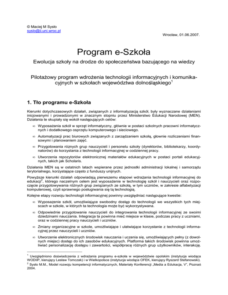 © Maciej M Sysło [email protected] Wrocław, 01.06.2007. Program e-Szkoła Ewolucja szkoły na drodze do społecze stwa bazuj cego na wiedzy Pilota owy program wdro enia technologii informacyjnych i komunikacyjnych w szkołach województwa dolno l skiego1 1. Tło programu e-Szkoła ń Kierunki dotychczasowych działa , zwi zanych z informatyzacj szkół, były wyznaczane działaniami inicjowanymi i prowadzonymi w znacznym stopniu przez Ministerstwo Edukacji Narodowej (MEN). Działania te skupiały si wokół nast puj cych celów: ą ę ę ą ą • Wyposa ania szkół w sprz t informatyczny, głównie w postaci szkolnych pracowni informatycznych i dodatkowego osprz tu komputerowego i sieciowego. Ŝ ę ę • Automatyzacji prac biurowych zwi zanych z zarz dzaniem szkoł , głownie rozliczeniami finansowymi i planowaniem zaj . ą ę ą ą ć • Przygotowania ró nych grup nauczycieli i personelu szkoły (dyrektorów, bibliotekarzy, koordynatorów) do korzystania z technologii informacyjnej w codziennej pracy. Ŝ • Utworzenia repozytoriów elektronicznej materiałów edukacyjnych w postaci portali edukacyjnych, takich jak Scholaris. Działania MEN s w ostatnich latach wspierane przez jednostki administracji lokalnej i samorz du terytorialnego, korzystaj ce cz sto z funduszy unijnych. ą ą ą ę ń Powy sze kierunki działa odpowiadaj pierwszemu etapowi wdra ania technologii informacyjnej do 2 edukacji , którego naczelnym celem jest wyposa enie w technologi szkół i nauczycieli oraz rozpocz cie przygotowywania ró nych grup zwi zanych ze szkoł , w tym uczniów, w zakresie alfabetyzacji komputerowej, czyli sprawnego posługiwania si t technologi . Ŝ ą Ŝ Ŝ ę Ŝ ę ą ą ę ą ą Kolejne etapy rozwoju technologii informacyjnej powinny uwzgl dnia nast puj ce kwestie: ę ć ę ą • Wyposa enie szkół, umo liwiaj ce swobodny dost p do technologii we wszystkich tych miejscach w szkole, w których ta technologia mo e by wykorzystywana. Ŝ Ŝ ą ę Ŝ ć • Odpowiednie przygotowanie nauczycieli do integrowania technologii informacyjnej ze swoimi dziedzinami nauczania. Integracja ta powinna mie miejsce w klasie, podczas pracy z uczniami, oraz w codziennej pracy nauczycieli i uczniów. ć • Zmiany organizacyjne w szkole, umo liwiaj ce i ułatwiaj ce korzystanie z technologii informacyjnej przez nauczycieli i uczniów. Ŝ ą ą • Utworzenie elektronicznych rodowisk nauczania i uczenia si , umo liwiaj cych pełny (z dowolnych miejsc) dost p do ich zasobów edukacyjnych. Platforma takich rodowisk powinna umo liwia personalizacj dost pu i zawarto ci, współprac ró nych grup u ytkowników, interakcj . ś ę ę ć Ŝ ą ś ę ę ś ę Ŝ Ŝ Ŝ ę 1 Uwzgl dniono do wiadczenia z wdra ania programu e-szkoła w województwie opolskim (instytucja wiod ca WODIiP, kieruj cy Lesław Tomczak) i w Wielkopolsce (instytucja wiod ca OFEK, kieruj cy Ryszard Stefanowski). 2 Sysło M.M., Model rozwoju kompetencji informatycznych, Materiały Konferencji „Media a Edukacja, V”, Pozna 2004. ę ś ą Ŝ ą ą ą ń 2 Ta platforma powinna równie wspiera ustawiczne kształcenie si zarówno uczniów, jak i personelu szkoły, w tym głównie nauczycieli. Ŝ ć ę Celem Programu e-Szkoła jest opracowanie i wdro enie projektu przej cia wybranych szkół na Dolnym l sku na nast pny etap rozwoju technologii informacyjnej w edukacji, poprzez zastosowanie nowoczesnych rozwi za technicznych (sieci radiowych, komputerów przeno nych, systemów interaktywnych), przygotowanie nauczycieli do osi gni cia trzeciego etapu rozwoju kompetencji w 3 zakresie technologii informacyjnej oraz utworzenie elektronicznych materiałów i rodowisk uczenia si . Ŝ Ś ą ś ę ą ń ś ą ę ś ę 2. Cele Programu e-Szkoła Głównym celem Programu e-Szkoła jest wsparcie szkoły na drodze do kolejnego etapu rozwoju technologii informacyjnej w jej działaniach, poprzez stworzenie warunków do skutecznego stosowania tej technologii przez nauczycieli w pracy dydaktycznej oraz przez uczniów w ich kształceniu si . ę Program e-Szkoła polega na wdro eniu projektów przej cia wybranych szkół na Dolnym l sku na wy szy etap rozwoju technologii informacyjnej w edukacji, poprzez wykorzystanie nowoczesnych rozwi za technicznych, odpowiednie przygotowanie nauczycieli, oraz utworzenie elektronicznych platform uczenia si . W szczególno ci: Ŝ Ś ś ą Ŝ ń ą ę ś • Szkoły bior ce udział w Programie zostan wyposa one w nowoczesne rozwi zania techniczne, takie jak sieci radiowe, komputery przeno ne i systemy interaktywne, umo liwiaj ce: o swobodny dost p do Internetu z ka dego miejsca w szkole; o korzystanie z komputerów nie tylko w wydzielonych miejscach i pracowniach; o jednoczesn aktywno wszystkich uczniów podczas zaj . ą ą Ŝ ą ś ę Ŝ ą Ŝ ą ś ć ę ć • Przeprowadzone zostanie szkolenie nauczycieli, maj ce na celu przygotowanie ich do integrowania technologii informacyjnej ze swoimi dziedzinami nauczania oraz wykorzystywania tej technologii w klasie, podczas zaj z uczniami, oraz w codziennej pracy. Nauczyciele powinni d y do osi gni cia trzeciego etapu rozwoju swoich kompetencji stosowania technologii informacyjnej w edukacji. ą ę ą Ŝ ć ą ć ę • Zmiany dost pu do technologii w szkole (dost p w ka dym miejscu) oraz zmiany trybu pracy nauczycieli i uczniów powoduj , e niezb dne jest przeprowadzenie zmian organizacji nauczania w szkole, maj cych na celu pełne wykorzystanie technologii informacyjnej przez nauczycieli i uczniów. ę ę ą Ŝ Ŝ ę ą • Wraz z rozwojem infrastruktury technicznej w szkołach oraz zmianami w pracy nauczycieli, niezb dne jest utworzenie elektronicznych rodowisk nauczania i uczenia si , umo liwiaj cych pełny (z dowolnych miejsc) dost p do ich zasobów edukacyjnych. Odpowiednie elektroniczne platformy edukacyjne powinny powsta w szkołach, w regionach i w województwie. Powinny umo liwia pełn personalizacj dost pu i zawarto ci, współprac ró nych grup u ytkowników, interakcj . 