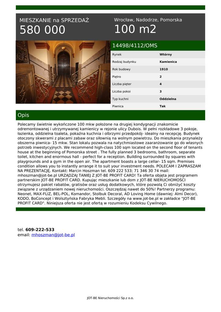 MIESZKANIE na SPRZEDAŻ 580 000 Wrocław, Nadodrze, Pomorska 100 m2 14498/4112/OMS Rynek Wtórny Rodzaj budynku Kamienica Rok budowy 1910 Piętro 2 Liczba pięter 4 Liczba pokoi 3 Typ kuchni Oddzielna Piwnica Tak Opis Polecamy świetnie wykończone 100 mkw położone na drugiej kondygnacji znakomicie odremontowanej i utrzymywanej kamienicy w rejonie ulicy Dubois. W pełni rozkładowe 3 pokoje, łazienka, oddzielna toaleta, pokaźna kuchnia i olbrzymi przedpokój- idealny na recepcję. Budynek otoczony skwerami z placami zabaw oraz siłownią na wolnym powietrzu. Do mieszkania przynależy obszerna piwnica- 15 mkw. Stan lokalu pozwala na natychmiastowe zaaranżowanie go do własnych potrzeb inwestycyjnych. We recommend high-class 100 sqm located on the second floor of tenants house at the beginning of Pomorska street . The fully planned 3 bedrooms, bathroom, separate toilet, kitchen and enormous hall - perfect for a reception. Building surrounded by squares with playgrounds and a gym in the open air. The apartment boasts a large cellar- 15 sqm. Premises condition allows you to instantly arrange it to suit your investment needs. POLECAM I ZAPRASZAM NA PREZENTACJĘ. Kontakt: Marcin Hoszman tel. 609 222 533; 71 346 30 74 mail: [email protected] URZĄDZAJ TANIEJ Z JOT-BE PROFIT CARD! Ta oferta objęta jest programem partnerskim JOT-BE PROFIT CARD. Kupując mieszkanie lub dom z JOT-BE NIERUCHOMOŚCI otrzymujesz pakiet rabatów, gratisów oraz usług dodatkowych, które pozwolą Ci obniżyć koszty związane z urządzaniem nowej nieruchomości. Oszczędzaj nawet do 50%! Partnerzy programu: Neonet, MAX-FLIZ, BEL-POL, Komandor, Stolbuk Decoral, AD Loving Home (dawniej: Almi Decor), KODO, BoConcept i Wolsztyńska Fabryka Mebli. Szczegóły na www.jot-be.pl w zakładce "JOT-BE PROFIT CARD". Niniejsza oferta nie jest ofertą w rozumieniu Kodeksu Cywilnego. tel. 609-222-533 email: [email protected] JOT-BE Nieruchomości Sp.z o.o. Powered by TCPDF (www.tcpdf.org)