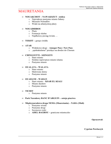 Wybrane interesujące miejsca w Mauretanii Opracował: Cyprian Pawlaczyk MAURETANIA • NOUAKCHOT – NAWAKSZUT - stolica o Największe pustynne miasto Sahary o Muzeum Nomadów o Wraki na atlantyckiej plaŜy • NOUADHIBOU o PlaŜe o Formacje skalne o NajdłuŜszy pociąg świata … • TERJIT – gorące źródła • ATAR o Widokowe drogi – Amogar Pass i New Pass o „spektakularna” przełęcz na drodze do Chorum • CHINGUETTI - SZINGETI o Stare miasto o Siódme najświętsze miasto islamu o Pustynne miasto • OUALATA - WALATA o Stare miasto o Malowane domy o Pustynne miasto • OUADANE - WADAN o Stare miasto – KSAR EL KIALI o Miasto duchów o Pustynne miasto • TICHIT o Pustynne miasto • Park Narodowy BANC D’ARGUIN – ostoja ptactwa • Międzynarodowa droga NEMA (Mauretania) – NARA (Mali) o Pustynne wioski o Pustynne drogi o Sezonowe rzeki o ADEL BAGROU – graniczne miasteczko Opracował: Cyprian Pawlaczyk Strona 1 z 1