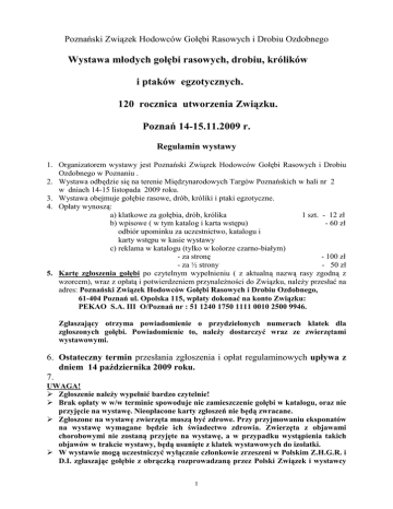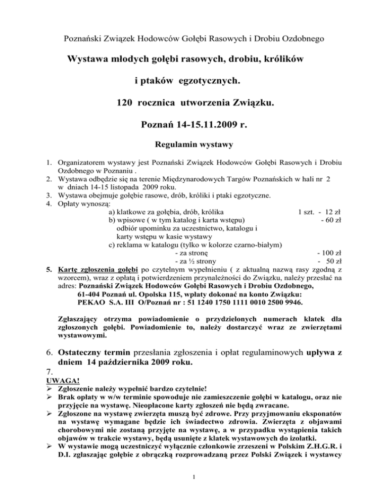 Poznański Związek Hodowców Gołębi Rasowych i Drobiu Ozdobnego Wystawa młodych gołębi rasowych, drobiu, królików i ptaków egzotycznych. 120 rocznica utworzenia Związku. Poznań 14-15.11.2009 r. Regulamin wystawy 1. Organizatorem wystawy jest Poznański Związek Hodowców Gołębi Rasowych i Drobiu Ozdobnego w Poznaniu . 2. Wystawa odbędzie się na terenie Międzynarodowych Targów Poznańskich w hali nr 2 w dniach 14-15 listopada 2009 roku. 3. Wystawa obejmuje gołębie rasowe, drób, króliki i ptaki egzotyczne. 4. Opłaty wynoszą: a) klatkowe za gołębia, drób, królika 1 szt. - 12 zł - 60 zł b) wpisowe ( w tym katalog i karta wstępu) odbiór upominku za uczestnictwo, katalogu i karty wstępu w kasie wystawy c) reklama w katalogu (tylko w kolorze czarno-białym) - za stronę - 100 zł - za ½ strony - 50 zł 5. Kartę zgłoszenia gołębi po czytelnym wypełnieniu ( z aktualną nazwą rasy zgodną z wzorcem), wraz z opłatą i potwierdzeniem przynaleŜności do Związku, naleŜy przesłać na adres: Poznański Związek Hodowców Gołębi Rasowych i Drobiu Ozdobnego, 61-404 Poznań ul. Opolska 115, wpłaty dokonać na konto Związku: PEKAO S.A. III O/Poznań nr : 51 1240 1750 1111 0010 2500 9946. Zgłaszający otrzyma powiadomienie o przydzielonych numerach klatek dla zgłoszonych gołębi. Powiadomienie to, naleŜy dostarczyć wraz ze zwierzętami wystawowymi. 6. Ostateczny termin przesłania zgłoszenia i opłat regulaminowych upływa z dniem 14 października 2009 roku. 7. UWAGA! Zgłoszenie naleŜy wypełnić bardzo czytelnie! Brak opłaty w w/w terminie spowoduje nie zamieszczenie gołębi w katalogu, oraz nie przyjęcie na wystawę. Nieopłacone karty zgłoszeń nie będą zwracane. Zgłoszone na wystawę zwierzęta muszą być zdrowe. Przy przyjmowaniu eksponatów na wystawę wymagane będzie ich świadectwo zdrowia. Zwierzęta z objawami chorobowymi nie zostaną przyjęte na wystawę, a w przypadku wystąpienia takich objawów w trakcie wystawy, będą usunięte z klatek wystawowych do izolatki. W wystawie mogą uczestniczyć wyłącznie członkowie zrzeszeni w Polskim Z.H.G.R. i D.I. zgłaszając gołębie z obrączką rozprowadzaną przez Polski Związek i wystawcy 1 zagraniczni z gołębiami obrączkowanymi na ogólnych zasadach przyjętych w Federacji Europejskiej. Zgłoszone gołębie rasowe muszą posiadać jedną znormalizowaną obrączkę. Gołębie nie posiadające polskiego wzorca mogą być wystawiane bez prawa do oceny sędziowskiej, a na karcie będzie umieszczony napis „POKAZ”. 8. Przyjęcie gołębi/drobiu/królików i ptaków egzotycznych odbędzie się w hali MTP nr 2 ul. Głogowska w dniu 12 listopada 2009 w godzinach 800-1800. 9. Ocenę eksponatów przeprowadzi 13 listopada 2009 roku Komisja Sędziowska, której werdykt jest ostateczny. 10. Wszystkie oceny zostaną wpisane w katalog. W przypadku gdyby komisja sędziowska danej rasy nie ukończyła oceny stawki gołębi do godziny 1600, organizator wystawy nie gwarantuje wpisu ocen tej rasy do katalogu. 11. Otwarcie wystawy nastąpi w dniu 14 listopada 2009 r. o godzinie 8 00 (czynna będzie do godz.1700). W dniu 15 listopada 2009 roku wystawa czynna będzie w godzinach 800-1500. Wcześniej eksponaty nie będą wydawane. Wyjątek stanowią ptaki sprzedane z wystawy, a których wydanie nastąpi nie wcześniej niŜ po godz. 14oo w pierwszym dniu wystawy i opłaceniu dodatkowo 25 zł w biurze wystawy. 12. Cenę biorącego udział w wystawie i przeznaczonego do sprzedaŜy gołębia, naleŜy podać w odpowiedniej rubryce zgłoszenia. Cena ta zostanie umieszczona w katalogu. 13. SprzedaŜ wystawianych eksponatów w czasie wystawy, moŜe się odbywać wyłącznie przez katalog i biuro wystawy. 14. Poznański Związek Hodowców Gołębi Rasowych i Drobiu Ozdobnego organizuje w dniu 14 listopada 2009 roku okolicznościowe spotkanie wystawców – na terenie MTP, na którym zostaną omówione problemy hodowlane i wręczone specjalne nagrody. 15. Konkursy i nagrody. - „Najlepsza kolekcja” (od I do III miejsca) wystawca wygrywający ten konkurs w rasie zdobywa tytuł „Mistrza Gołębi Młodych” na rok 2009 w rasie ........................ Aby konkurs się odbył w danej rasie, musi być minimum trzech wystawców wystawiających po 4 gołębie. Do konkursu zliczane są punkty trzech najwyŜej ocenionych gołębi. W przypadku tej samej punktacji o zwycięstwie przesądza gołąb „Zwycięzca w rasie”- kolorze- wyróŜniony gołąb z wyŜszą punktacją lub punkty zdobyte przez 4 gołębia w kolekcji. - „Zwycięzca w kolorze”. Zwycięzcą w kolorze zostaje gołąb, który został najwyŜej oceniony spośród minimum 6 gołębi w danym kolorze. W rasach, w których występują lub uczestniczą w wystawie gołębie tylko w jednym kolorze lub wystawiona jest za mała ilość gołębi, aby wybrać zwycięzcę w kolorze dokonuje się wyboru tylko Zwycięzcy w rasie. Zwycięzca w kolorze wybierany jest spośród gołębi jednokolorowych i gołębi z rysunkiem, jeŜeli takie występują w danej rasie (np. pawik jednokolorowy, pawik tarczowy, pawik barwnoogoniasty itp.). - „WyróŜniony w kolorze”. WyróŜnienie w kolorze otrzymują gołębie jeŜeli w kolorze wystawionych jest minimum 6 gołębi i uzyska ocenę równorzędną ze Zwycięzcą w kolorze. Nominacje nadaje sędzia oceniający daną rasę. - „Zwycięzca w rasie”. Zwycięzcą w rasie zostaje gołąb, który zostanie najwyŜej oceniony spośród zwycięzców w kolorze i gołębi z pozostałych kolorów z minimum 6 gołębi JeŜeli kilka gołębi zdobędzie tę samą punktację nominację Zwycięzcy w Rasie nadaje sędzia oceniający daną rasę. 16. Komitet wystawy przyjmuje odpowiedzialność za gołębie od chwili przyjęcia na wystawę. W przypadku zaginięcia eksponatu zostanie wypłacone odszkodowanie w wysokości 100 złotych, podobnie jak w przypadku gołębia padłego z winy organizatora. 2 17. Na terenie wystawy zostanie 