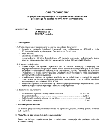 OPIS TECHNICZNY do projektowanego miejsca na ognisko wraz z siedziskami położonego na działce nr 97/1, 100/1 w Przedborzu INWESTOR: Gmina Przedbórz ul. Mostowa 29 97-570 Przedbórz 1. Dane ogólne 1.1. Projekt budowlany opracowano w oparciu o poniższe dokumenty: decyzja o ustaleniu lokalizacji inwestycji celu publicznego nr 52/2008 z dnia 20 listopada 2008 r. wydana przez Burmistrza m. Przedborza; wizja lokalna; ustalenia z inwestorem; rozporządzenie Ministra Infrastruktury „W sprawie warunków technicznych, jakim powinny odpowiadać budynki i ich usytuowanie” z dnia 12 kwietnia 2002 roku; 1.2. Program funkcjonalny projekt miejsc na ognisko wykonany jest w ramach inwestycji polegającej na zagospodarowaniu turystycznym terenu wokół zbiornika wodnego mającej ma na celu stworzenie odpowiednich warunków dla wypoczynku, sportu i rekreacji dla turystów i mieszkańców miasta i gminy poprzez urządzenie bazy noclegowej wraz z zapleczem sanitarnym i bazą towarzyszącą; projektowane miejsce na ognisko znajdują się w południowo – zachodniej części opracowania na terenie projektowanego pola namiotowego oraz w pobliżu domków kempingowych na działkach 97/1, 100/1 miejsce na ognisko przeznaczone są do obsługi projektowanego kąpieliska oraz pola namiotowego i caravaningowego i domków kempingowych 1.3 Zestawienie powierzchni: powierzchnia ogniska z strefą bezpieczeństwa............................... 400 cm długość siedziska………………… ………………………………………. 2,00 m ilość siedzisk dookoła miejsca na ognisko ………………………………… 6 szt. Ilość miejsc na ognisko ……………………………………………………… 2 szt. 2. Warunki geotechniczne W miejscu projektowanej lokalizacji miejsc na ognisko występują warstwy piachu o frakcji 0,2 – 0,5mm. 3. Klasyfikacja pod względem ochrony zabytków Teren na którym projektowana jest przedmiotowa inwestycja nie podlega ochronie konserwatorskiej. 4. Wpływ eksploatacji górniczej Teren na którym projektowana jest przedmiotowa inwestycja nie znajduje się w granicach terenu górniczego. 5. Konstrukcja siedziska miejsce do siedzenia z dwóch desek sosnowych o wymiarach 60/240/2000, czterostronnie struganego zaimpregnowanego preparatem „Fobos 4M” i pomalowane lakierobejcą „AltaxinQ” firmy Altax w kolorze orzech, siedzenie zamocowane do okrąglaków sosnowych o średnicy około 380 za pomocą gwoździ pierścieniowatych 5,0/200, okrąglaki okorowane, zaimpregnowane preparatem „Fobos 4M” i pomalowane lakierobejcą „AltaxinQ” firmy Altax w kolorze orzech, w miejscu styku z siedziskiem zestrugane tak aby przylegały do powierzchni desek. 6. Miejsce na ognisko palenisko o średnicy 150cm ogrodzone kamieniami polnymi, w miejscu paleniska usunąć istniejącą trawę, dookoła paleniska w odległości 30cm stworzyć strefę bezpieczeństwa z żwiru płukanego o frakcji 1,6 – 3,2, obok miejsca na ognisko ustawić tablicę z regulaminem korzystania z tego miejsca ze szczególnym uwzględnieniem informacji ppoż. 7. Uwagi 7.1. Wszystkie materiały, środki i urządzenia stosowane w trakcie budowy oraz w czasie użytkowania budynku muszą posiadać ocenę Państwowego Zakładu Higieny, certyfikat lub aprobatę techniczną Instytutu Techniki Budowanej. 7.2. Prace budowlano - montażowe wykonać pod nadzorem uprawnionego budowniczego zgodnie ze sztuką budowlaną oraz przepisami BHP.
